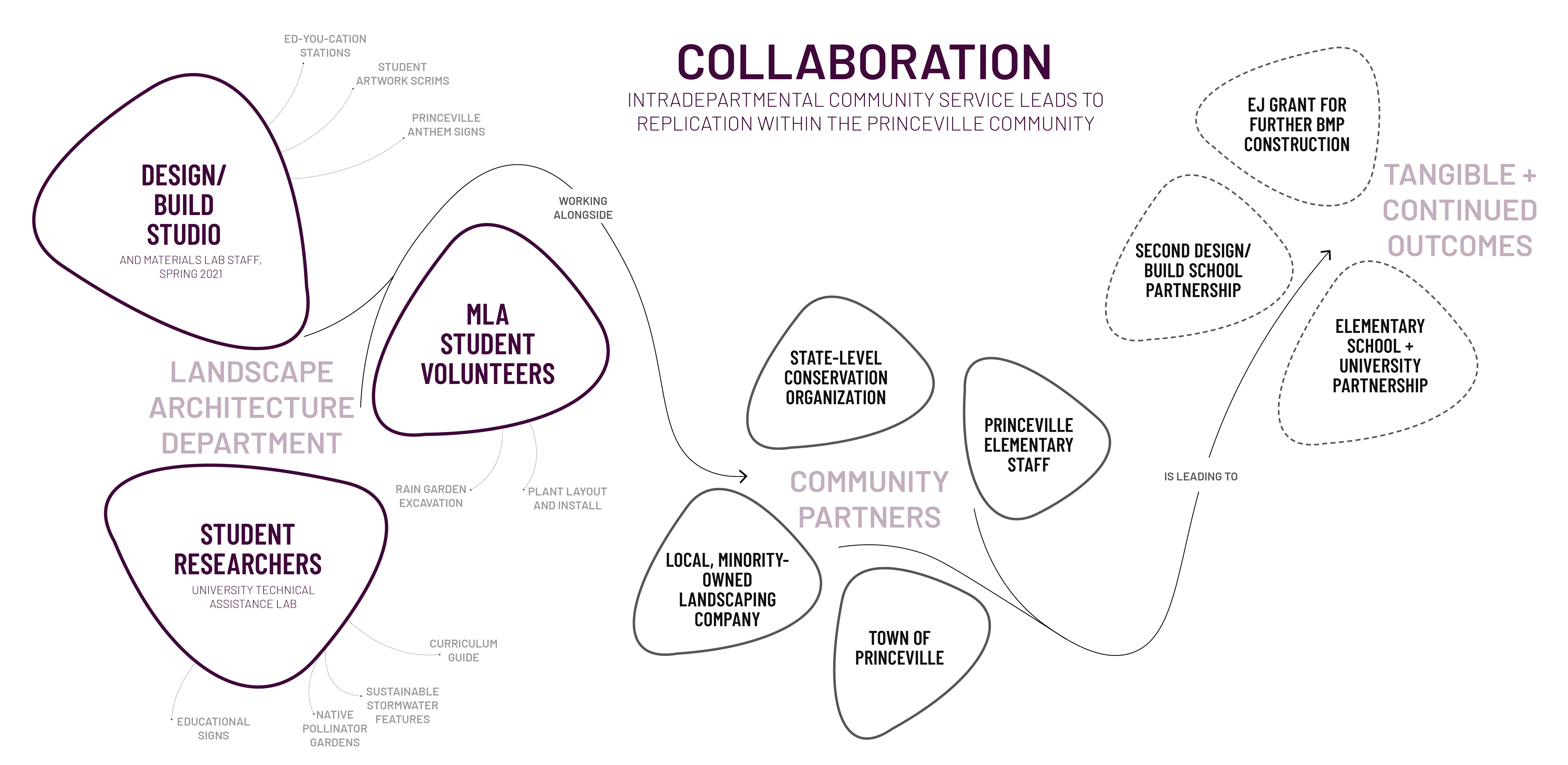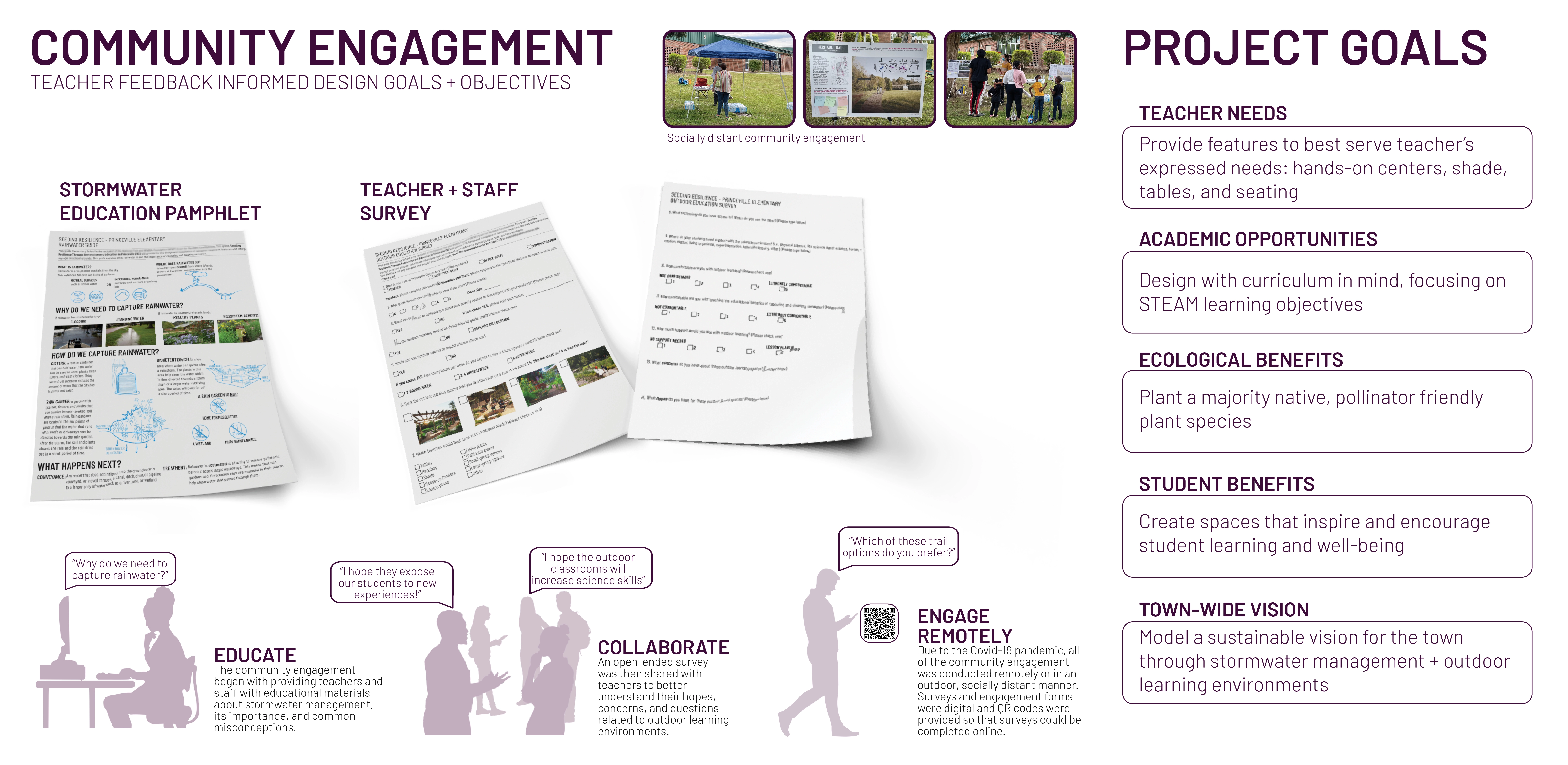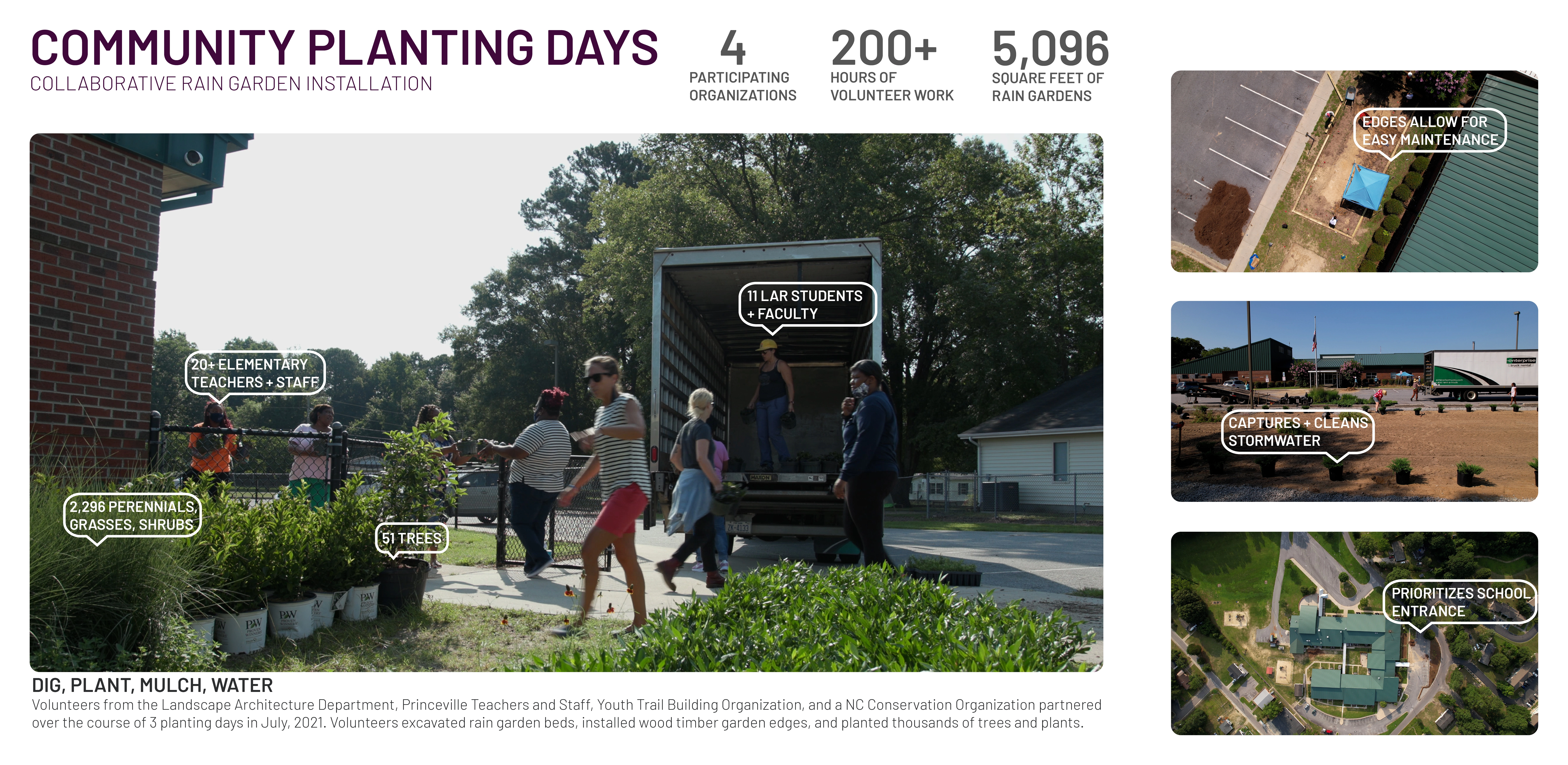 Graduate students collaborated from multiple branches of the department to partner with the Princeville community. Connecting students to this project through multiple departmental outlets allowed for an increased scope of work and the ability to meet Princeville Elementary’s comprehensive set of goals. Project goals centered around supporting the social, environmental, and economic resilience of the community, including increasing on-site stormwater storage, beautifying the campus, supporting teachers with outdoor learning environments and a curriculum guide, partnering with a local Black-owned business, and conducting community/teacher/staff engagement activities to inform designs.