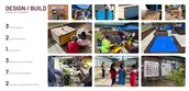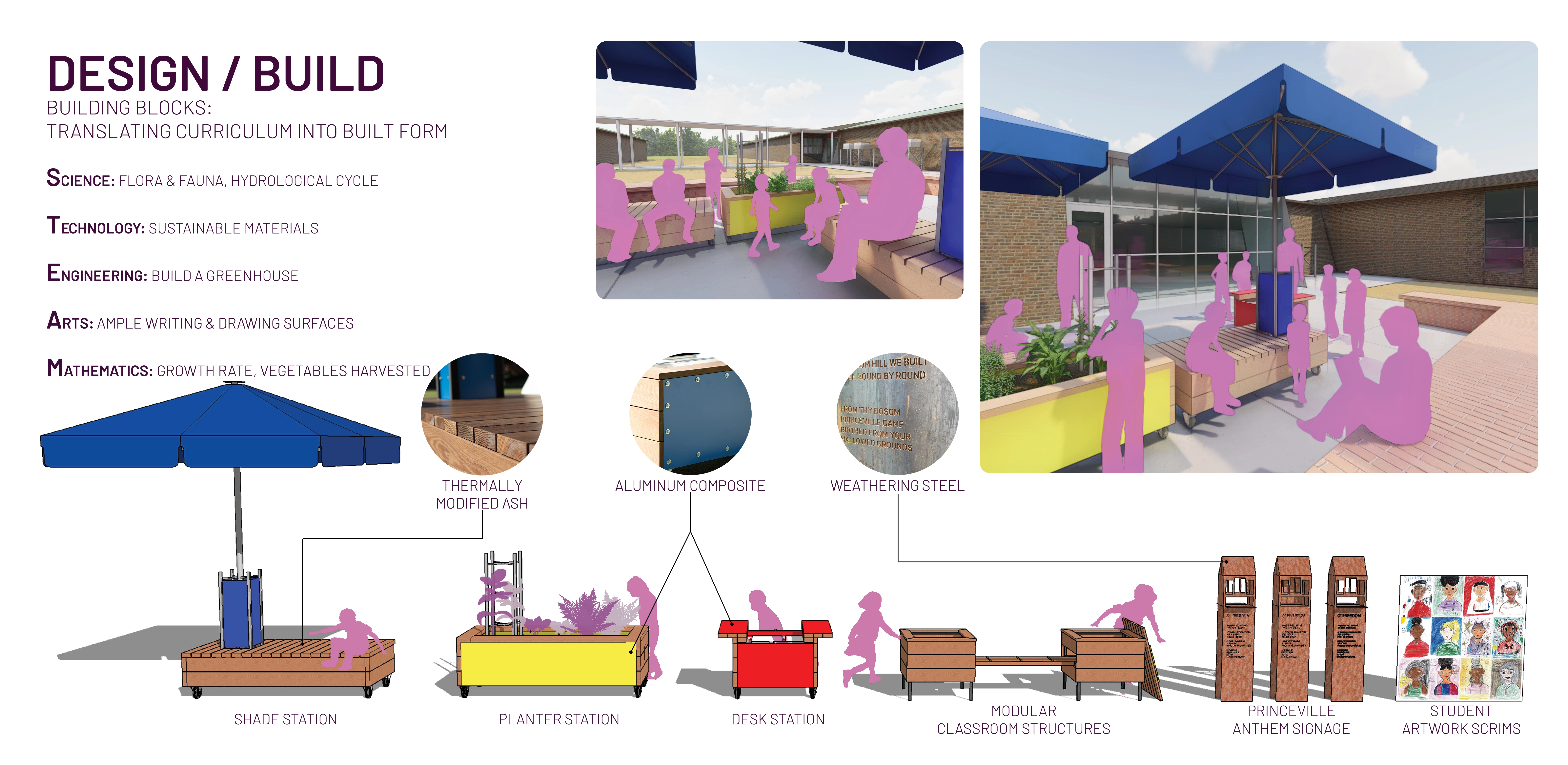 The students' work resulted in a wide variety of benefits for the school and community. The educational furnishings enable classes to gather outside due to their shade umbrellas and flexible seating arrangements. They also serve as learning stations that enable students to plant and observe vegetables as they grow. The furnishings were designed to be interactive, with vibrant yellow and blue aluminum composite that allows teachers and students to write directly on the structures themselves using dry-erase markers. The student artwork scrims serve a dual purpose of screening elevated HVAC units while showcasing the students' art to further their sense of belonging and ownership of the courtyard space.