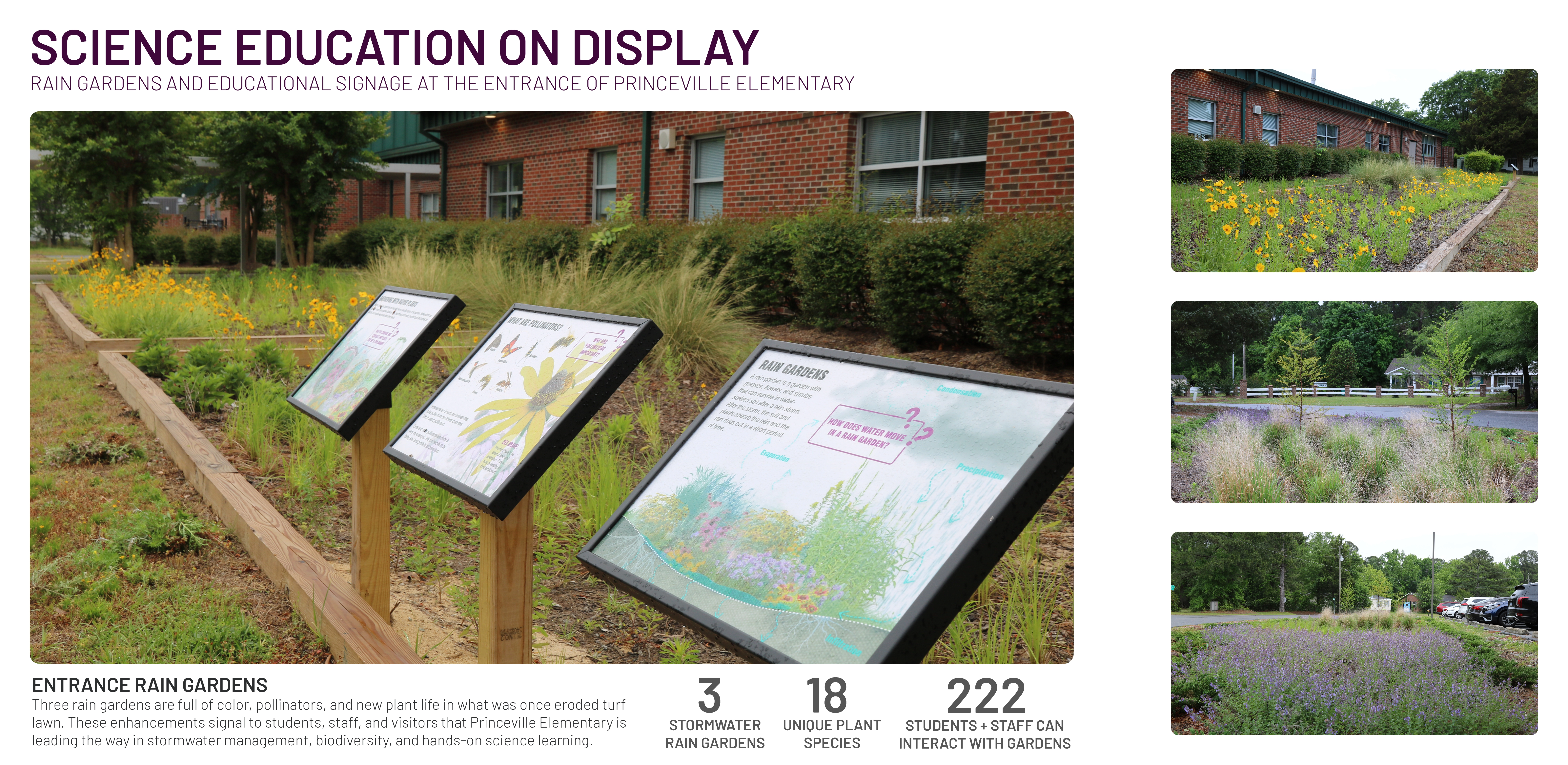 The rain gardens were designed with an emphasis on native plants and pollinators. These areas connect to the STEAM curriculum that enhances learning outcomes tied to natural processes such as photosynthesis, the water cycle, and pollination, while adding a beautiful plant palette to their beloved campus. Educational signs with guiding questions are strategically placed alongside the rain gardens and along the new Princeville Heritage Trail to both inform and engage students and community members about the ecological benefits of the environments around them.