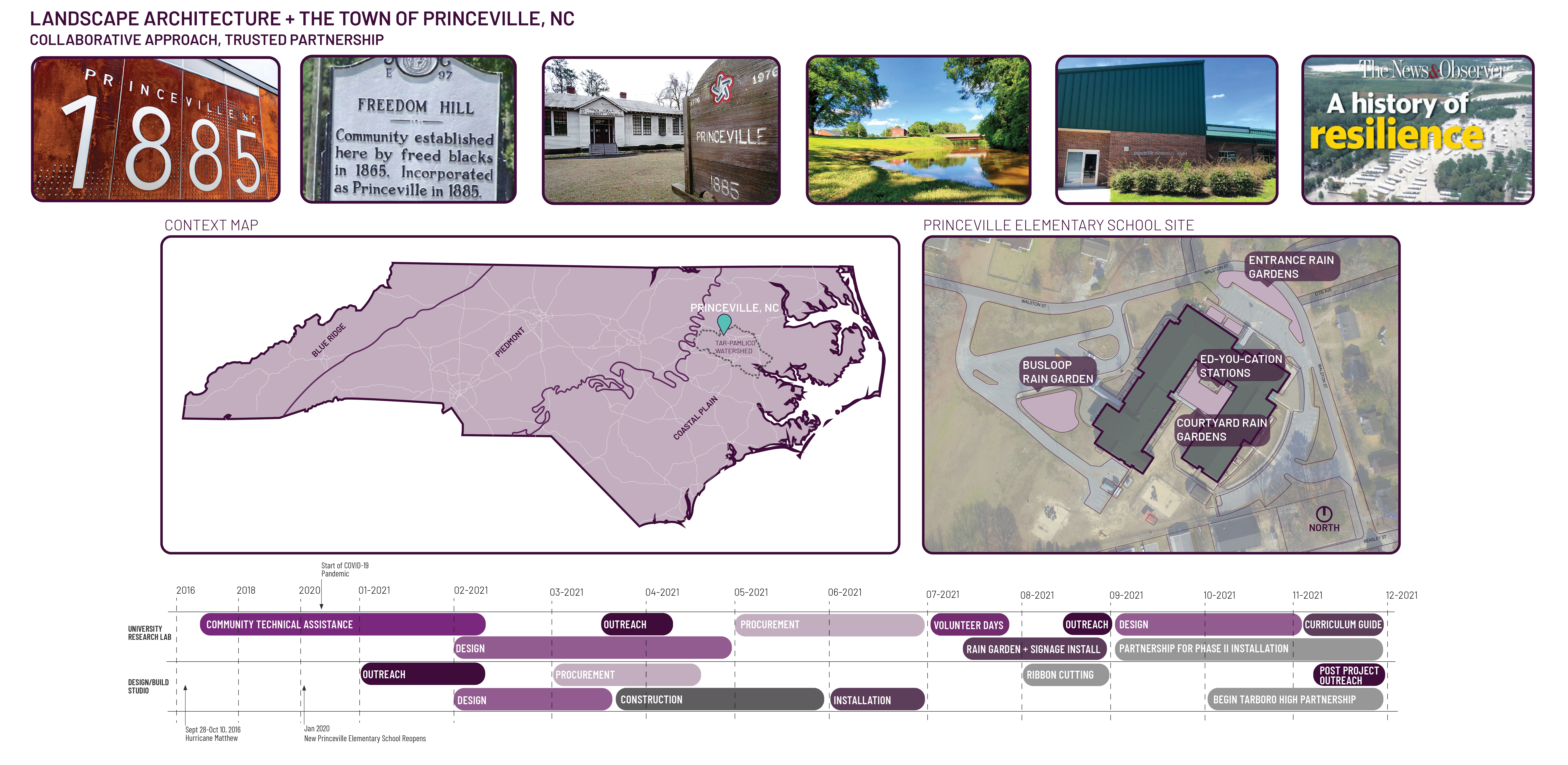 Starting in 2017, a university-led technical assistance lab began its partnership with the Town of Princeville. Through many years of working with residents and town leaders to envision ways to better live with the risks of flooding while enhancing the town’s historic center, a relationship of trust and respect created an ideal foundation for the implementation of this community service project. Using an intradepartmental approach that included the lab, a design/build studio, graduate research assistants, and volunteers from the student chapter of ASLA, this project designed and installed a broad scope of stormwater interventions and outdoor learning environments. The project was delivered at no cost to the community; it was funded by an external grant and contributions from the landscape architecture program. Participating members of the landscape architecture program and their various partners believe that the myriad successes of this collaborative project have and will continue to encourage further engagements and investments in community sustainability and resilience.