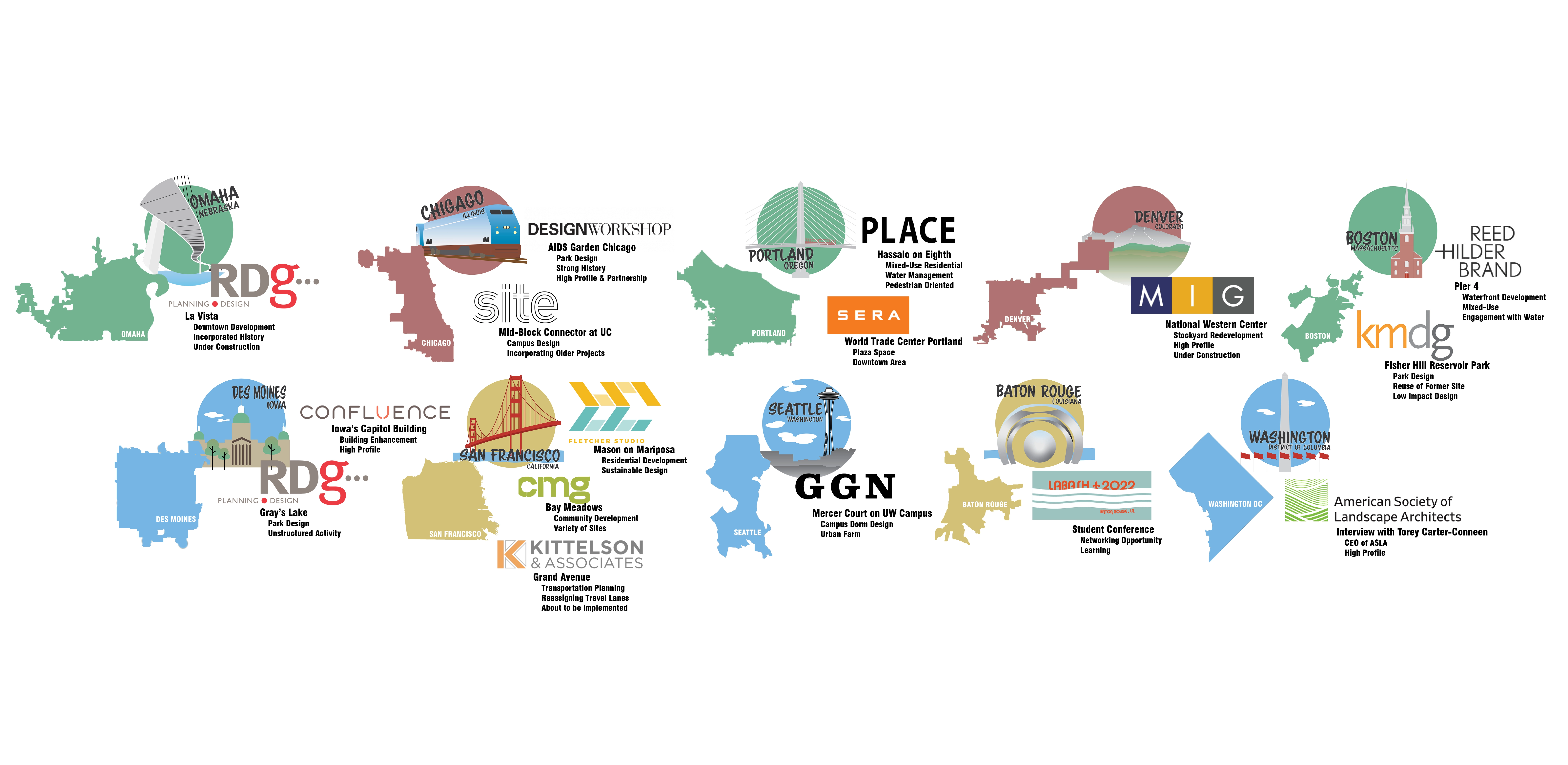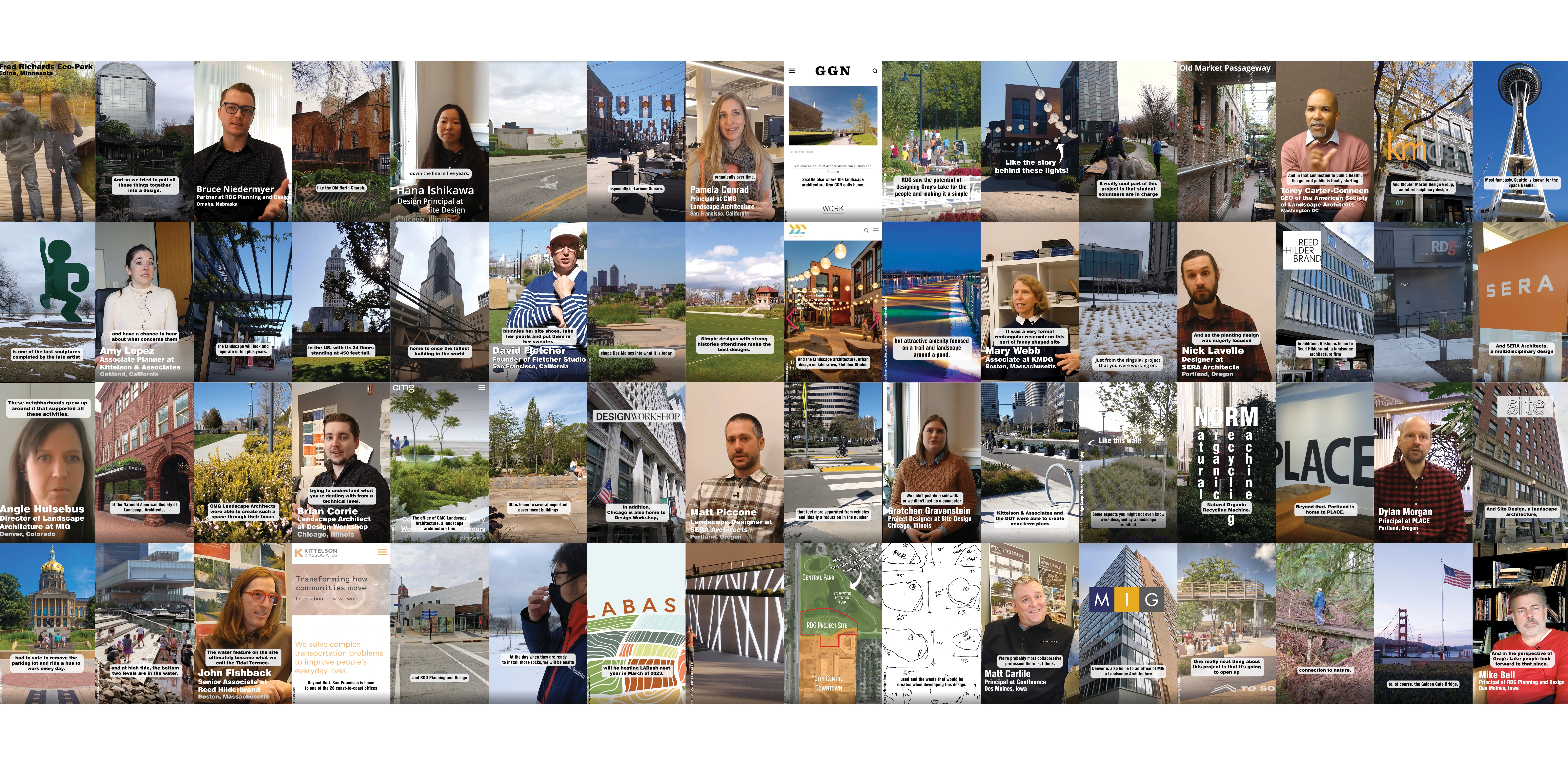Over a span of three months, I conducted twenty-two interviews with people passionate about landscape architecture: landscape architects, designers, planners, and the CEO of the ASLA, in ten cities across the United States. Each interviewee was asked the same series of questions regarding a project they have worked on in the local city. After the interview, if time allowed, we would visit the project site together to record the details mentioned during the interview. If time did not allow, I would visit the site solo. With the videos and interviews recorded, along with supplemental images provided by the interviewee and the firm website, I created 60 seconds or shorter videos highlighting each project. While the interviewees were asked the same questions, each provided a different perspective into their respective projects. Some interviewees chose to focus more on the history and development of the project, while others spoke to the impact the project has made on the community. Each interviewee provided valuable insight into the importance of landscape architecture, supporting the goal of Landscape Travels.