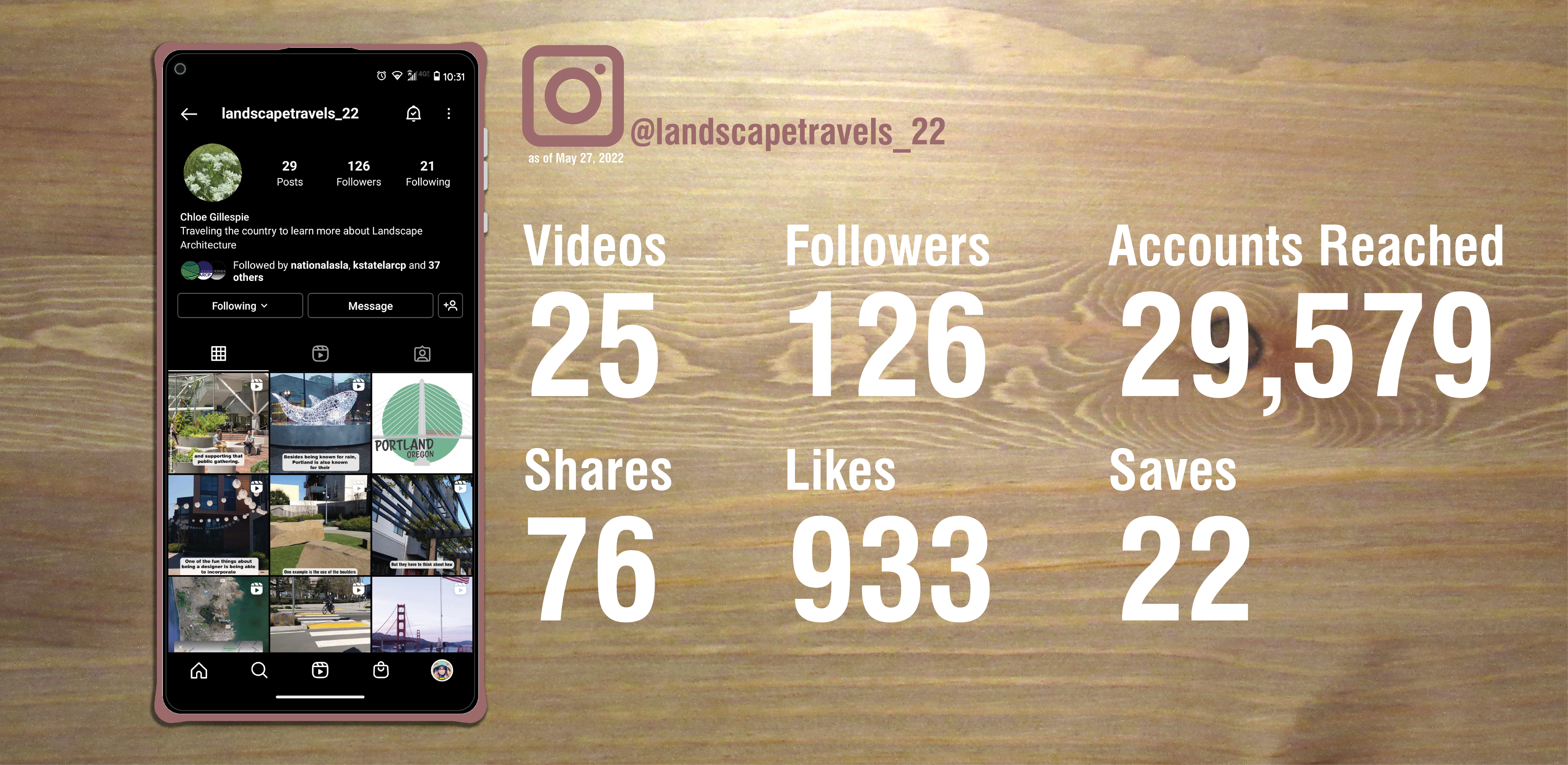 This project began as an opportunity to travel the country to learn more about the landscape architecture profession and became a journey of bringing awareness to the importance of landscape architecture. Through vertical short-form videos specifically curated for social media, Landscape Travels brings viewers along on my journey across the country, introducing them to 22 people engaged in the profession highlighting projects in ten different cities. As of May 27th, 2022, after four months of posting, @landscapetravels_22 has a following of 580 users, with a reach of over 120,000 through Instagram and TikTok.