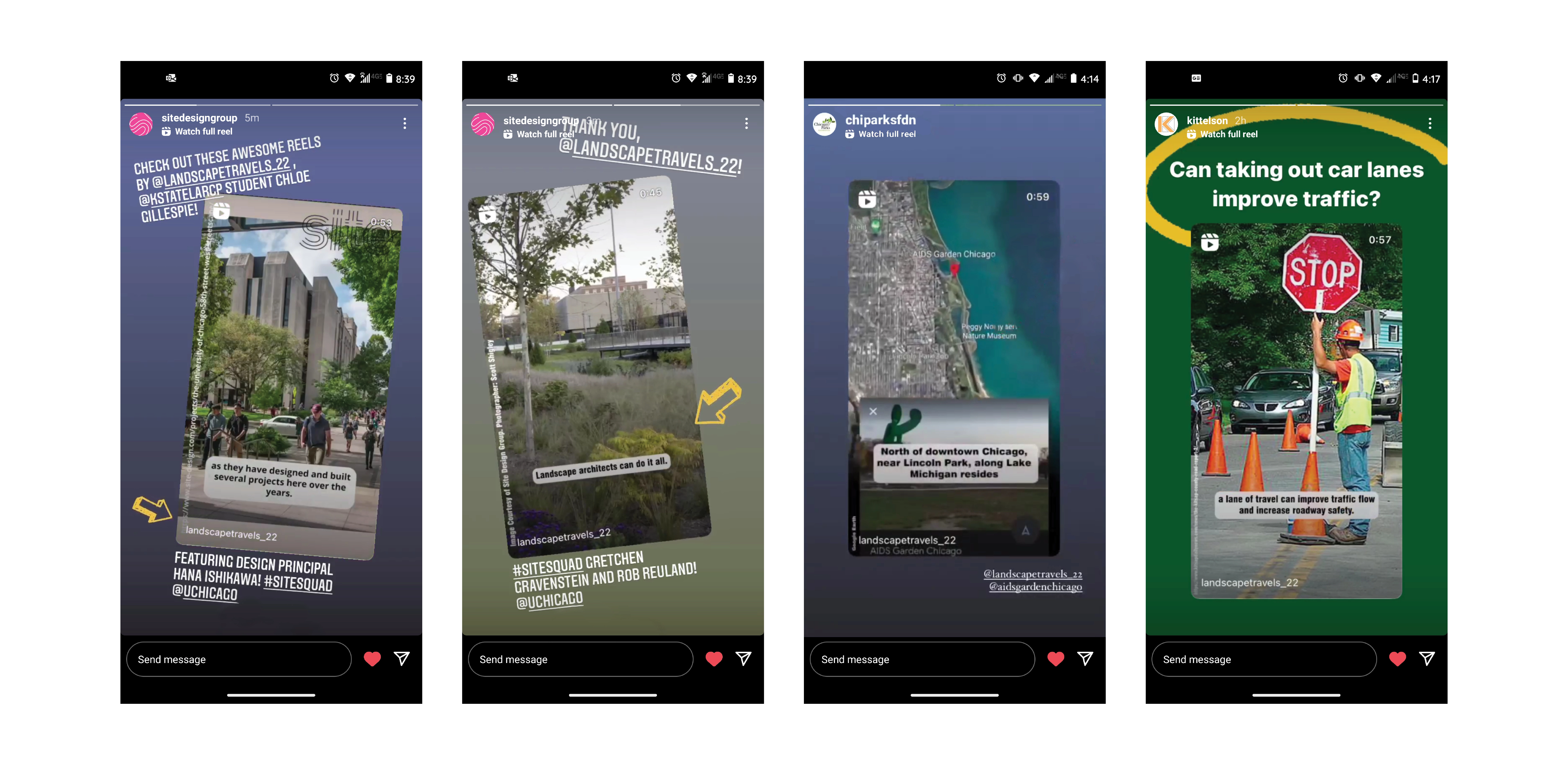 Landscape Travels’ main distribution is through TikTok and Instagram Reels. The same content is posted on both platforms, with the addition of graphic “New Chapter” posts on Instagram when moving to a new city. The 60 seconds or shorter videos match Instagram’s time limit restrictions. @landscapetravels_22 Instagram views averages between 1,000 and 3,000 per video with 20 to 40 likes. Views on TikTok averages 300 to 450 per video and 30 to 40 likes. A high point came when the AIDS Garden Chicago by Design Workshop video received over 99,000 views and 18,000 likes, in less than a month after being posted.