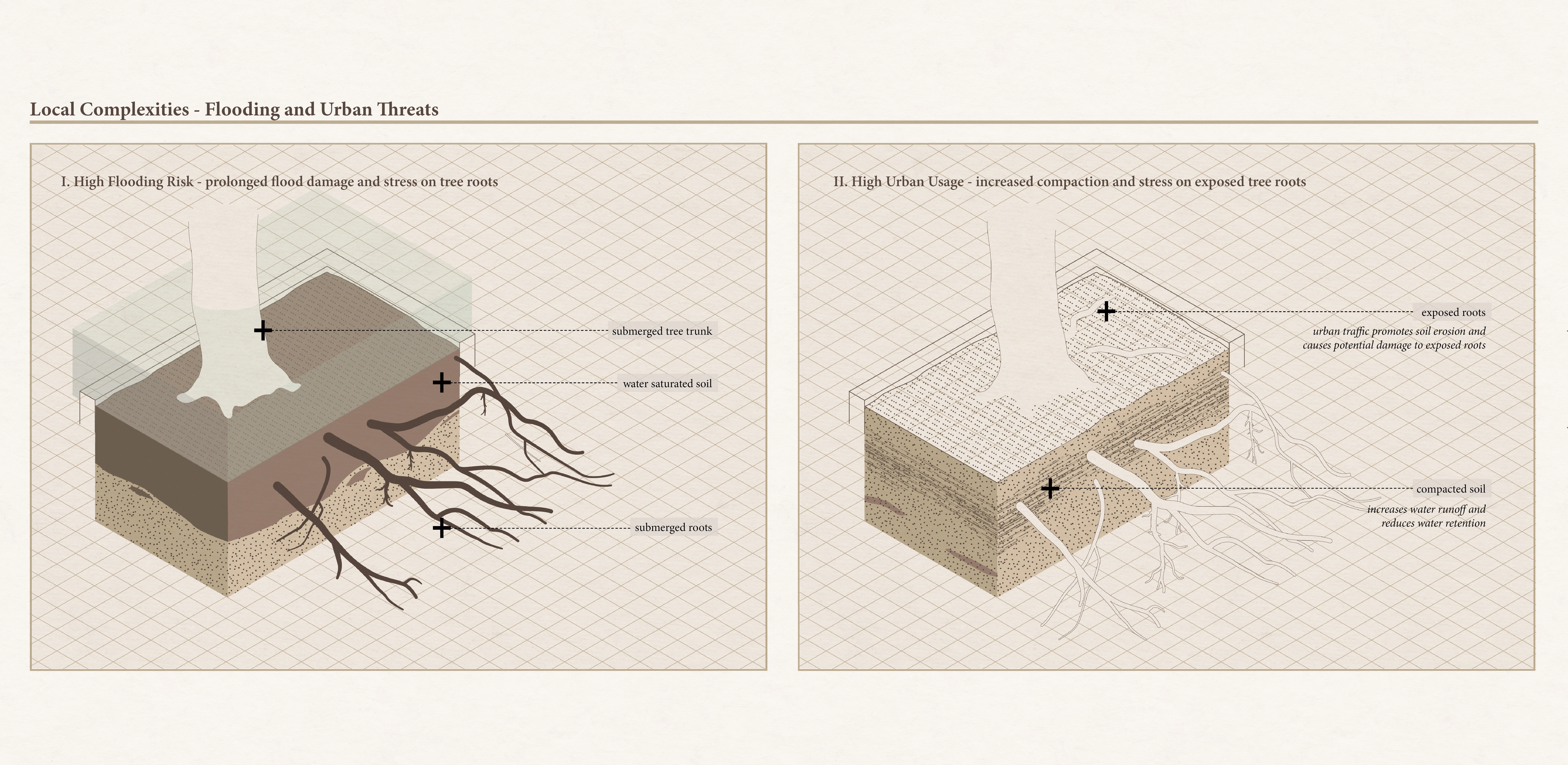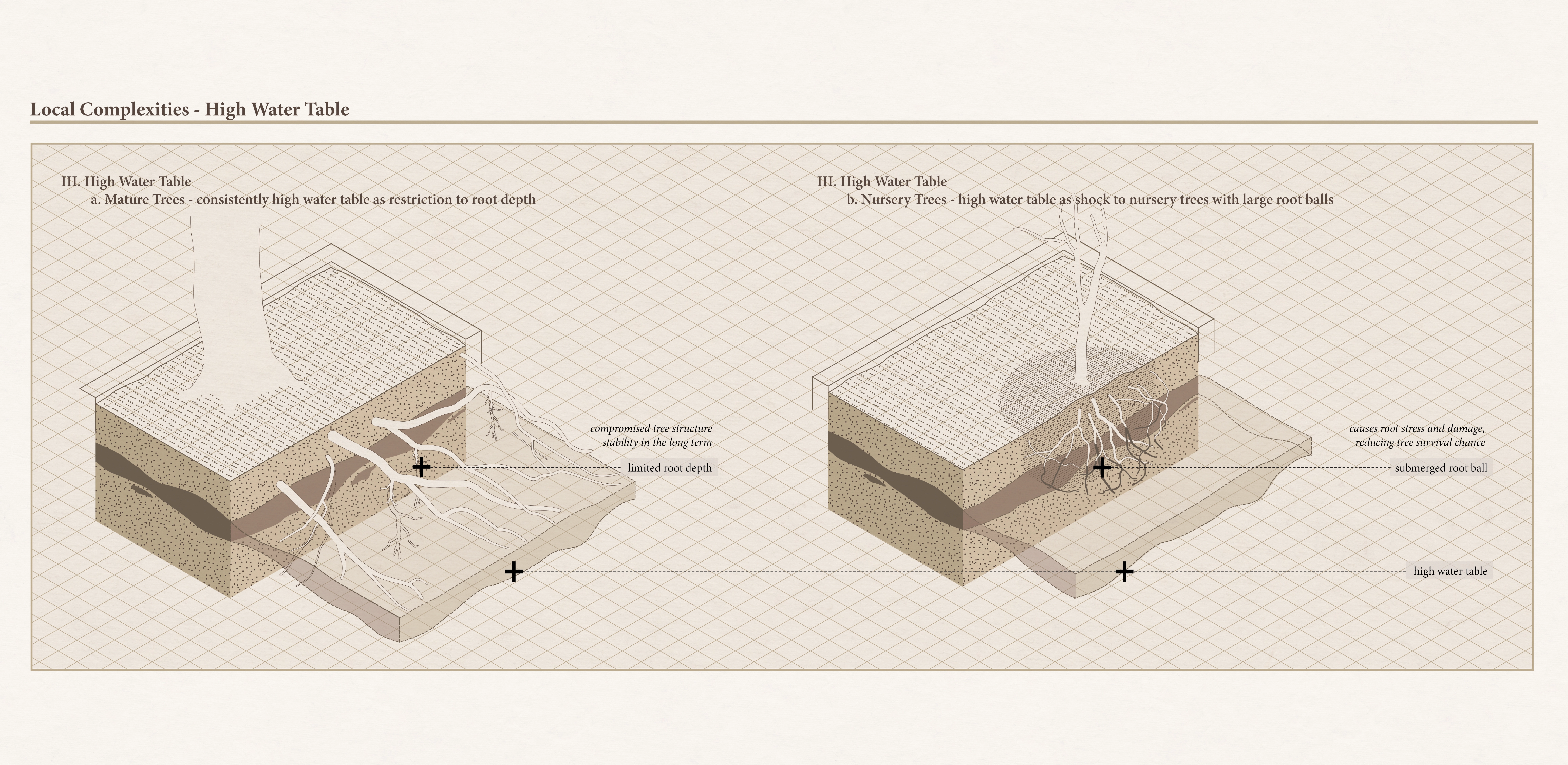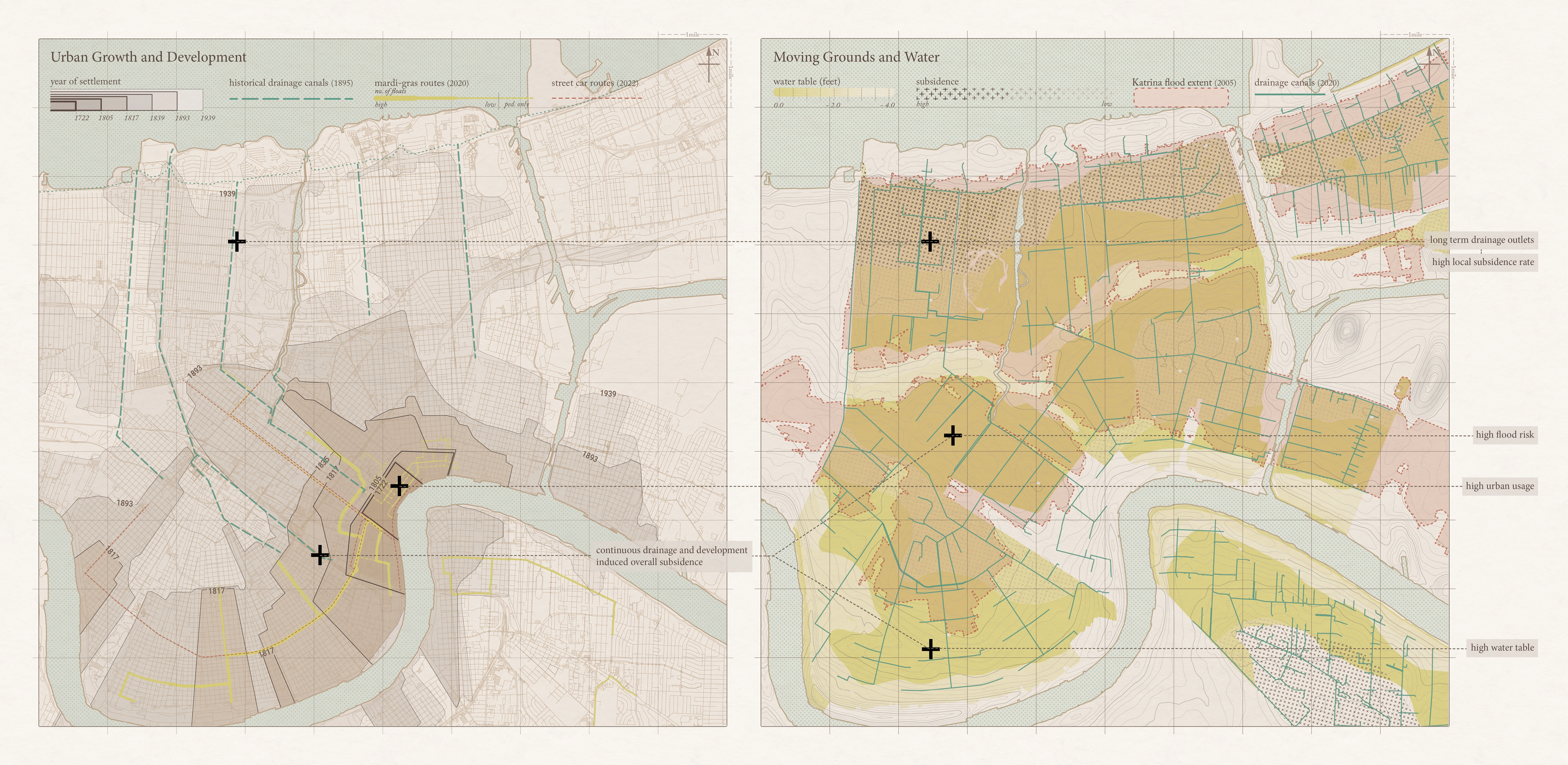 As natural systems, trees are genetically varied and adaptive to the environment. An understanding of the city as mapped data allows us to identify the complex environmental conditions that trees are situated in. The development of New Orleans was made possible by draining the original cypress swamp, but this also caused the topography to sink. Now the city relies on drainage canals to keep rain and stormwater from flooding the city. The land faces varied and intersecting conditions in terms of subsidence, water table heights, and compaction. These conditions allude to different issues including limited root depths, submerged roots, decreased water retentions, and exposed roots.