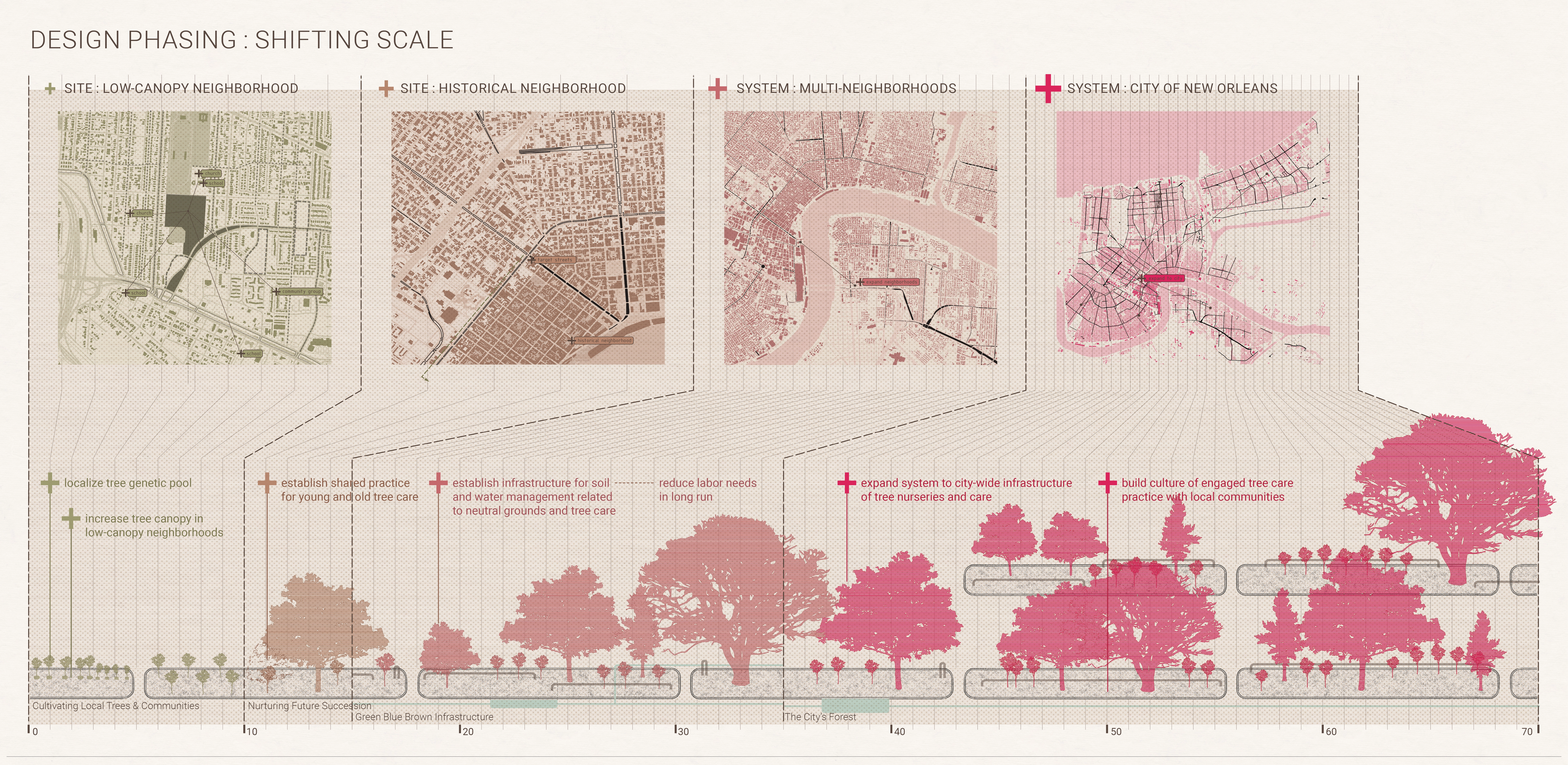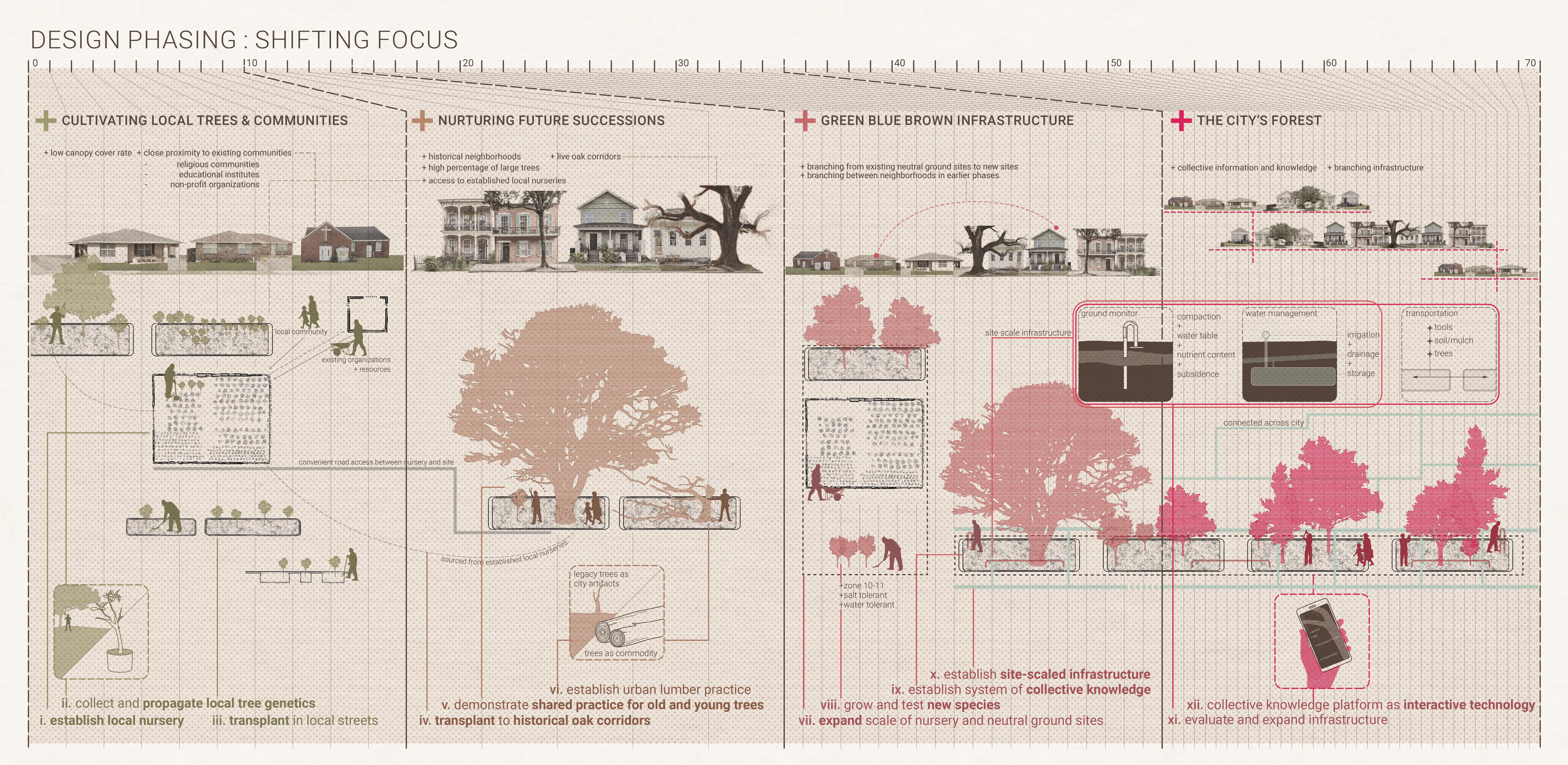 This design is phased to transition from site to system in scale, targeting low-canopy cover neighborhoods and old historical neighborhoods in early phases and targeting climate change and resiliency in later phases. Site scale establishments that cultivate and establish trees and communities grows into infrastructural systems of trees, water, and soil, transforming the neutral grounds into a forested network that includes practices of nurseries and tree care. Water, soil, and transportation becomes engineered and technical infrastructure as calculated and measured mechanisms, whereas tree care becomes systemized local collective knowledge.