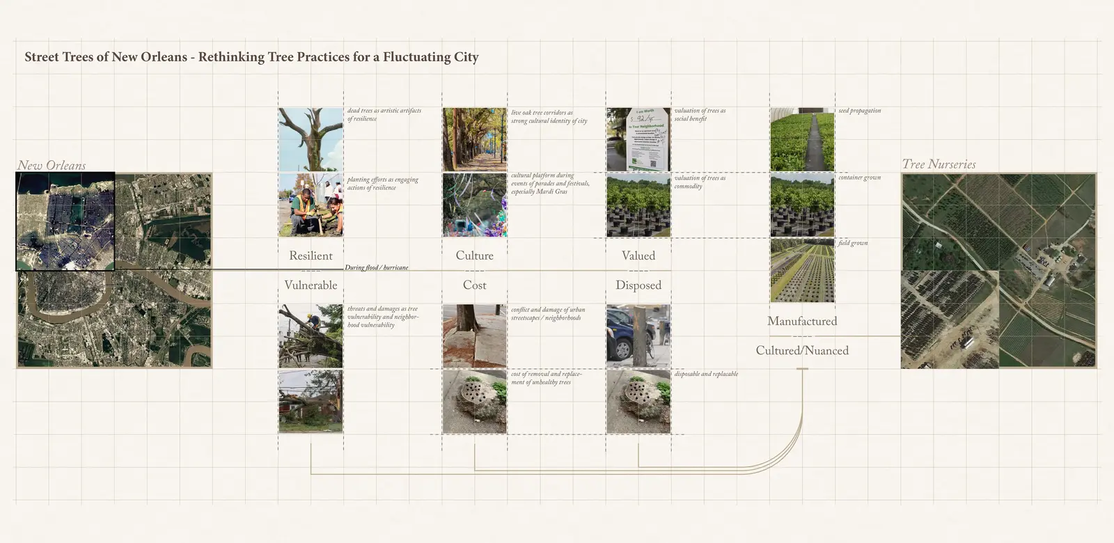 In the city of New Orleans, street trees take on multiple roles as green infrastructure, historical artifacts, and cultural symbols of resilience. While we are generally fond of trees, street trees are commodified and engineered to fit into the needs of an urban landscape. As street trees are ultimately a hybrid system of both the natural and urban, how do we balance between cultivating trees as living systems and maintaining them as engineered systems while generating positive cultural relationships with the urban landscape in New Orleans?