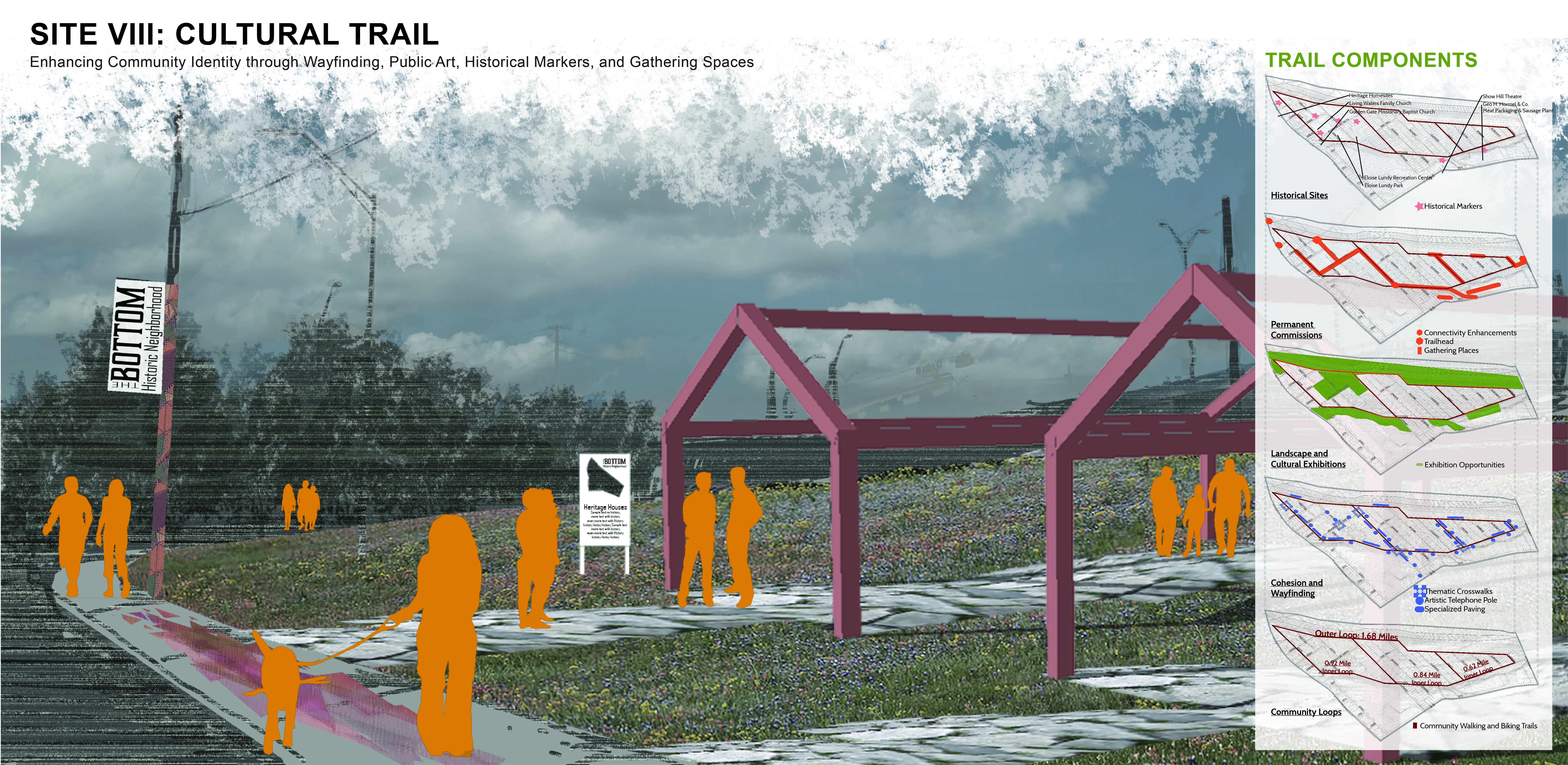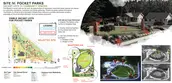 A hillside park beautifies a barren slope, connecting the community with the neighboring high school, integrating leisure and gathering opportunities, and celebrating the local terrain and views. Pocket parks throughout the community process stormwater runoff while providing for much-needed, walkable open space that balances the narrow residential lots. An entry park serves as a gateway specific to this unique community. Artistic and cultural elements introduced throughout the neighborhood as part of a cultural trail celebrate the history of The Bottom while providing room to evolve with the needs and interests of present and future residents. Finally, a community plaza anchors the community, reclaiming part of a nonporous parking lot as greenspace and serving as a social and cultural extension of the historic and incredibly significant Eloise Lundy Park.