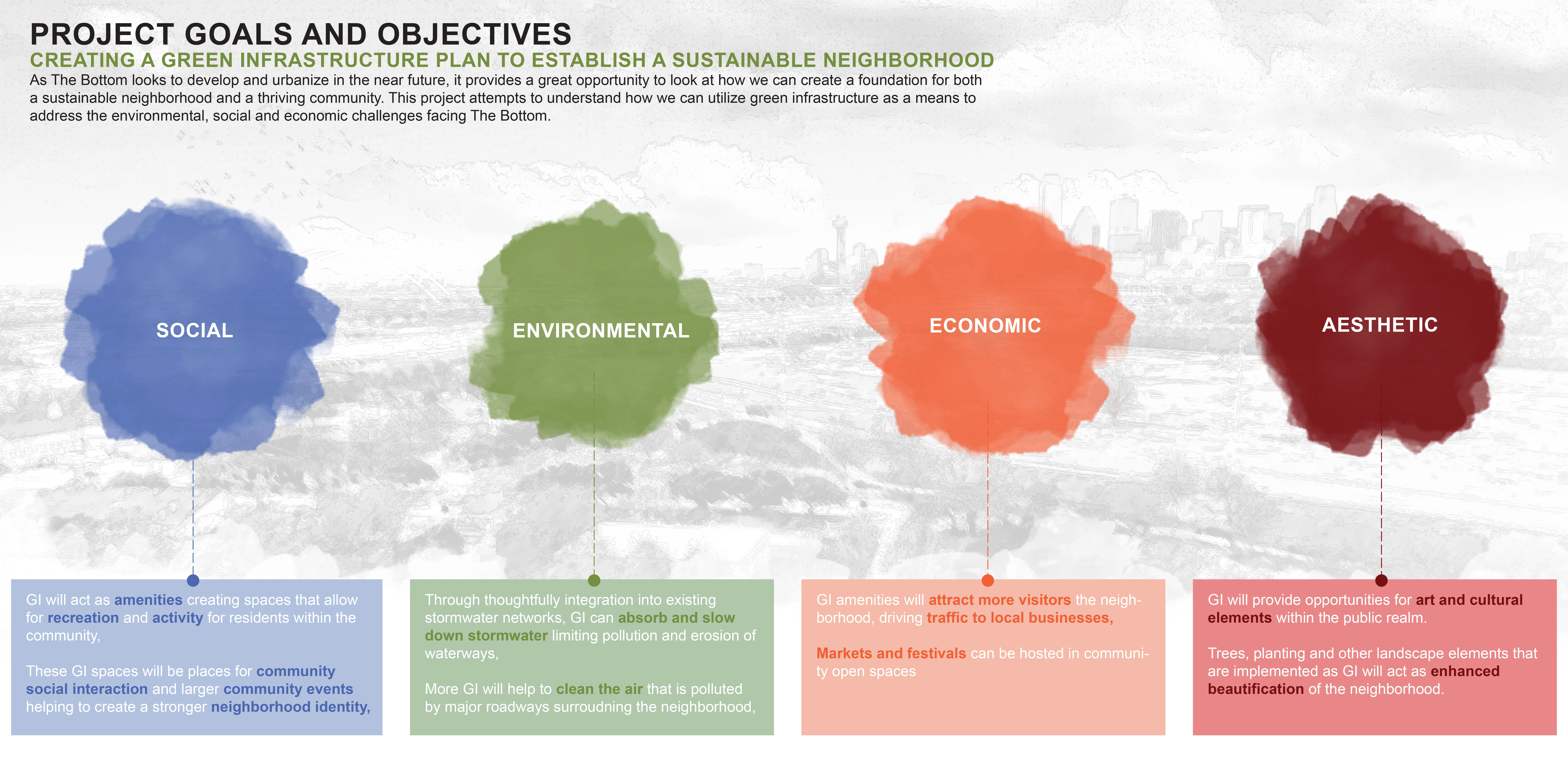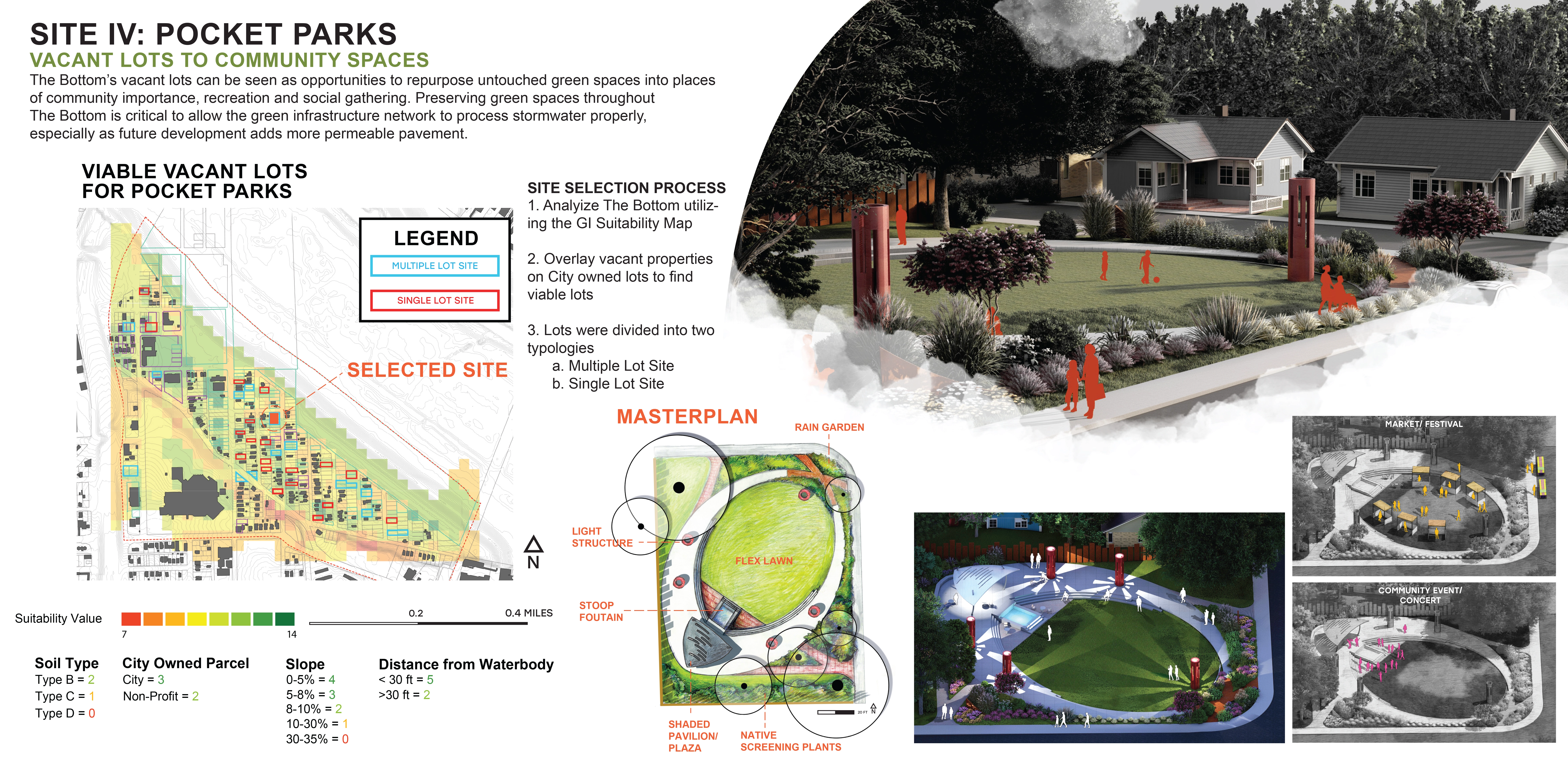 As the climate continues to change and weather events become more severe, managing flooding and stormwater runoff in developing urban environments will become a vital and existential challenge to overcome. By utilizing plants and green spaces to slow down and absorb the runoff (along with the heat and contaminants) into a natural system, green infrastructure is an alternative solution that may be thoughtfully integrated into existing stormwater management systems to sustainably mitigate the effects of runoff and flooding. Research related to the feasibility of this idea was applied in the development of a master plan for The Bottom neighborhood that responds to current stormwater challenges while also addressing social and economic issues resulting from disinvestment and neglect. In creating a plan to support a sustainable neighborhood, it was important to address each of these environmental, social, and economic factors, as they make up the foundation of a thriving community.