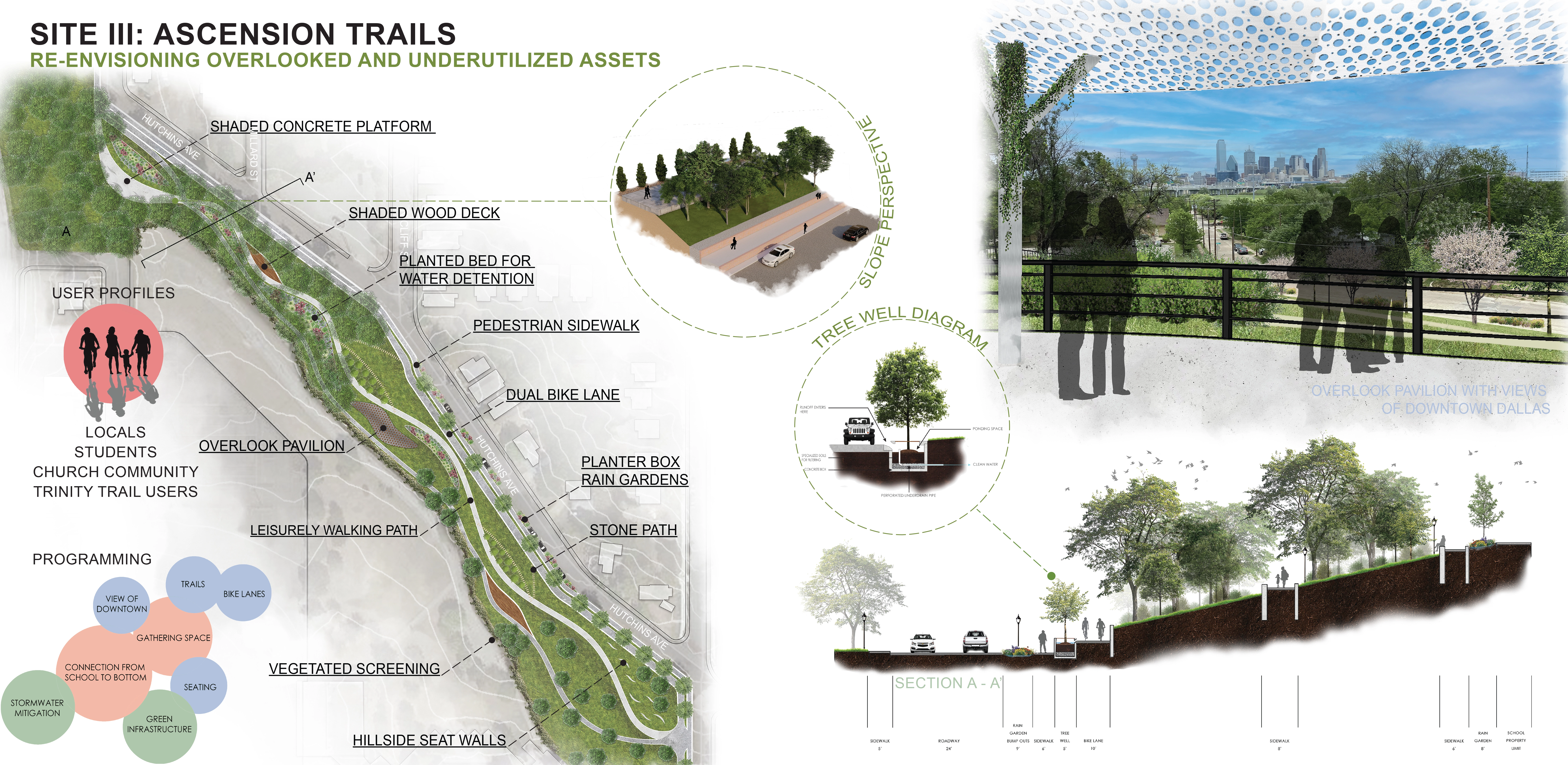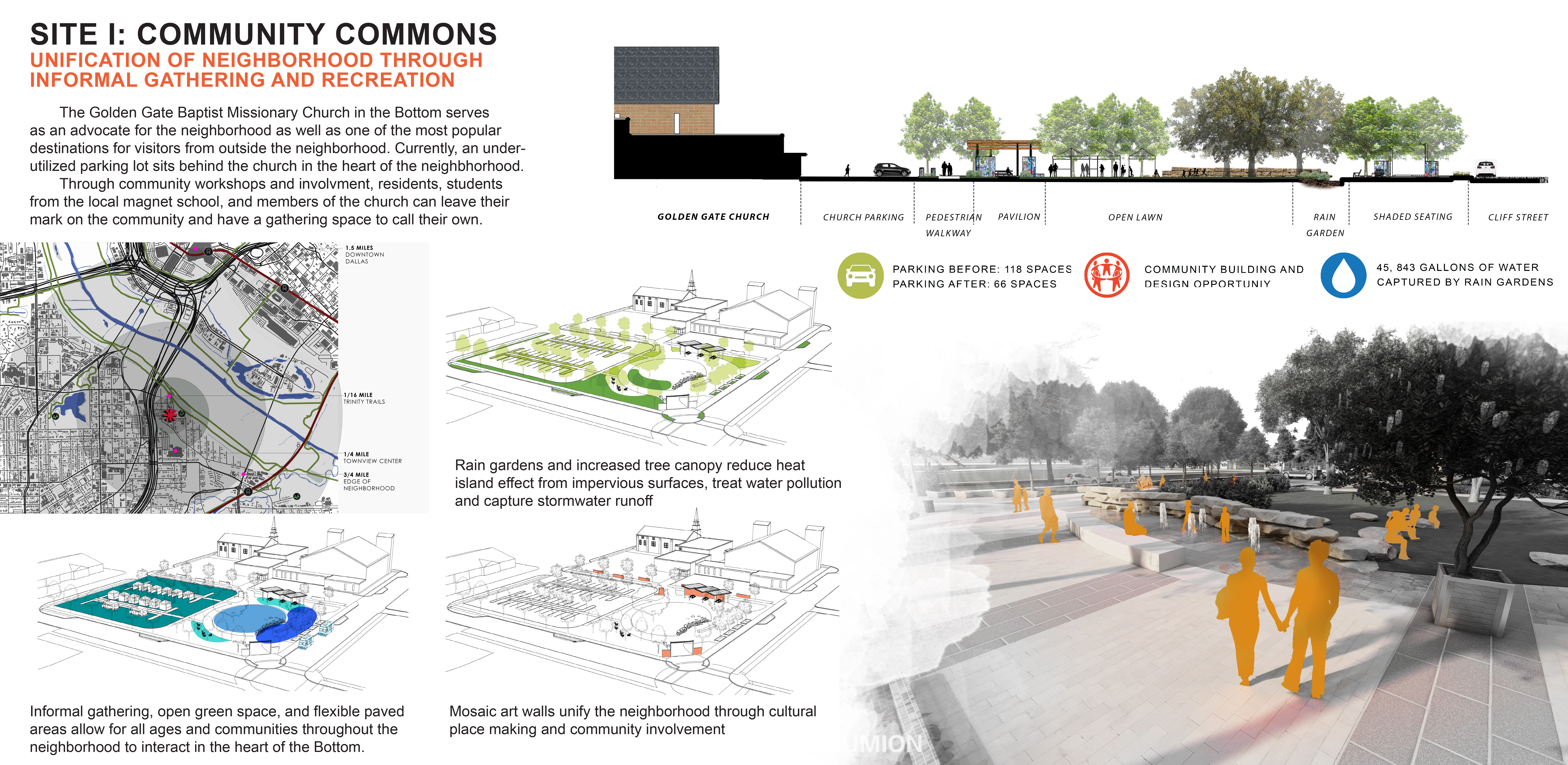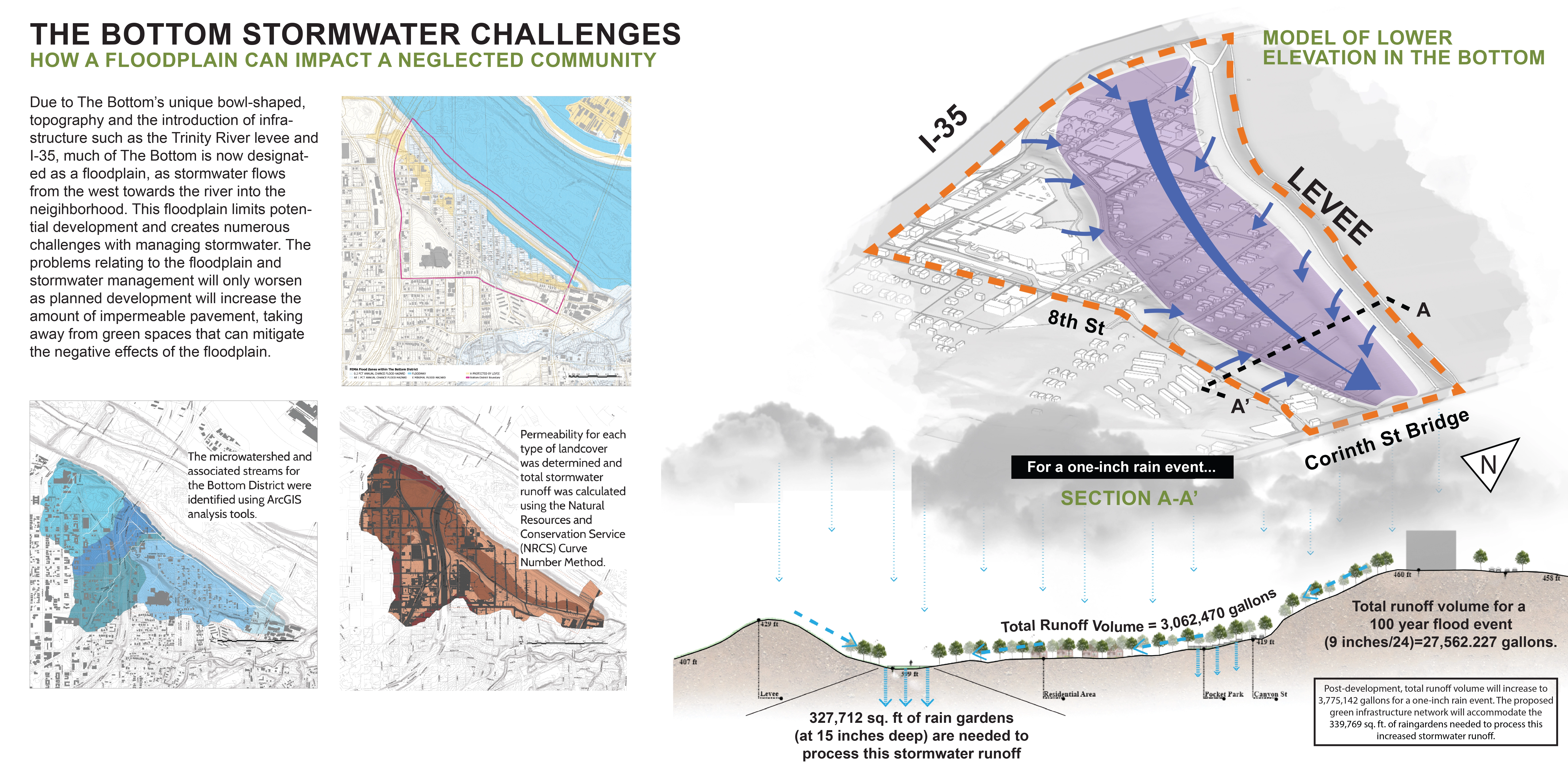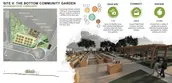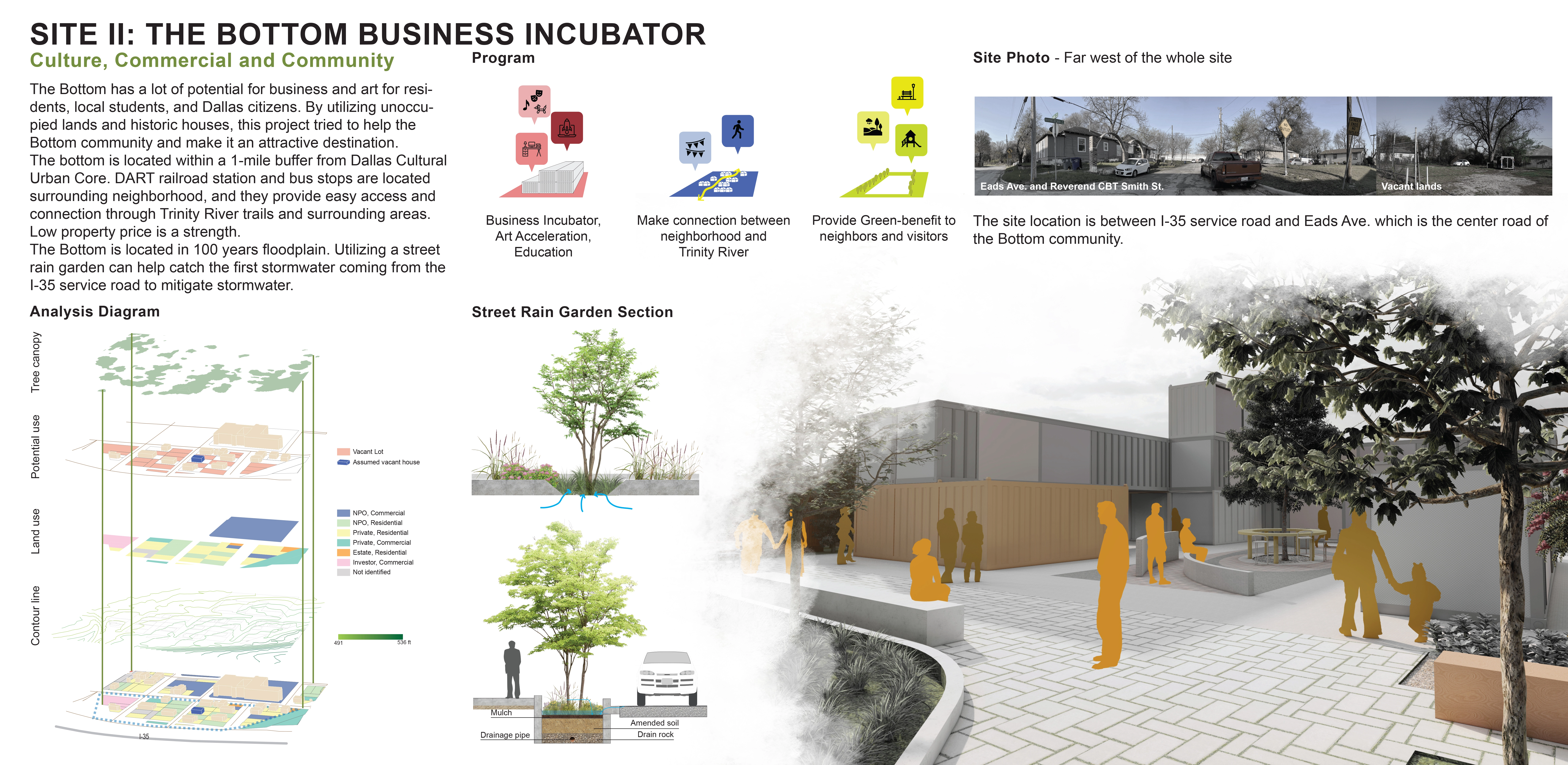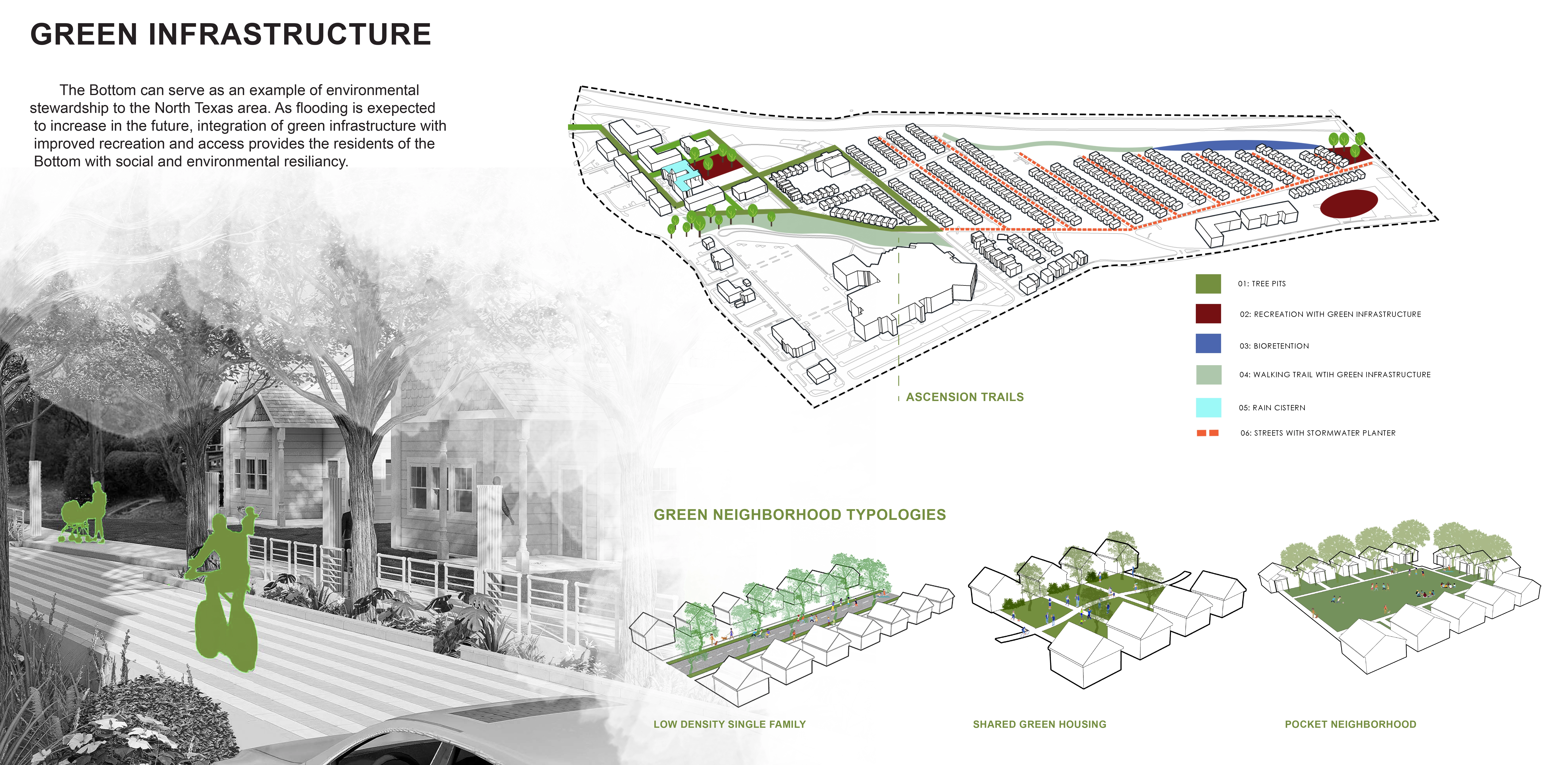 A large section of The Bottom falls into the flood plain due to its unique bowl-shaped elevation, which was created in part through a man-made levee that was built to prevent flooding from the nearby Trinity River. The poverty rate is higher in The Bottom neighborhood as compared to the greater Dallas statistical area, and few opportunities exist nearby for employment. Only a handful of restaurants and convenience stores from which to obtain food are within walking distance. Opportunities exist to connect to networks of public transportation, biking routes, and hiking trails as well as other cultural and recreational opportunities. The master plan responds to these components by aiming to not only utilize a green infrastructure network to minimize the flooding and damage from stormwater runoff in the neighborhood but also take advantage of the green infrastructure as an opportunity to create neighborhood amenities for the residents of The Bottom. Wetland trails, community gardens, and sloped parks are a few of the additions proposed that can both address the issues of stormwater runoff and be used by the community as spaces for economic growth, community events, and recreation.