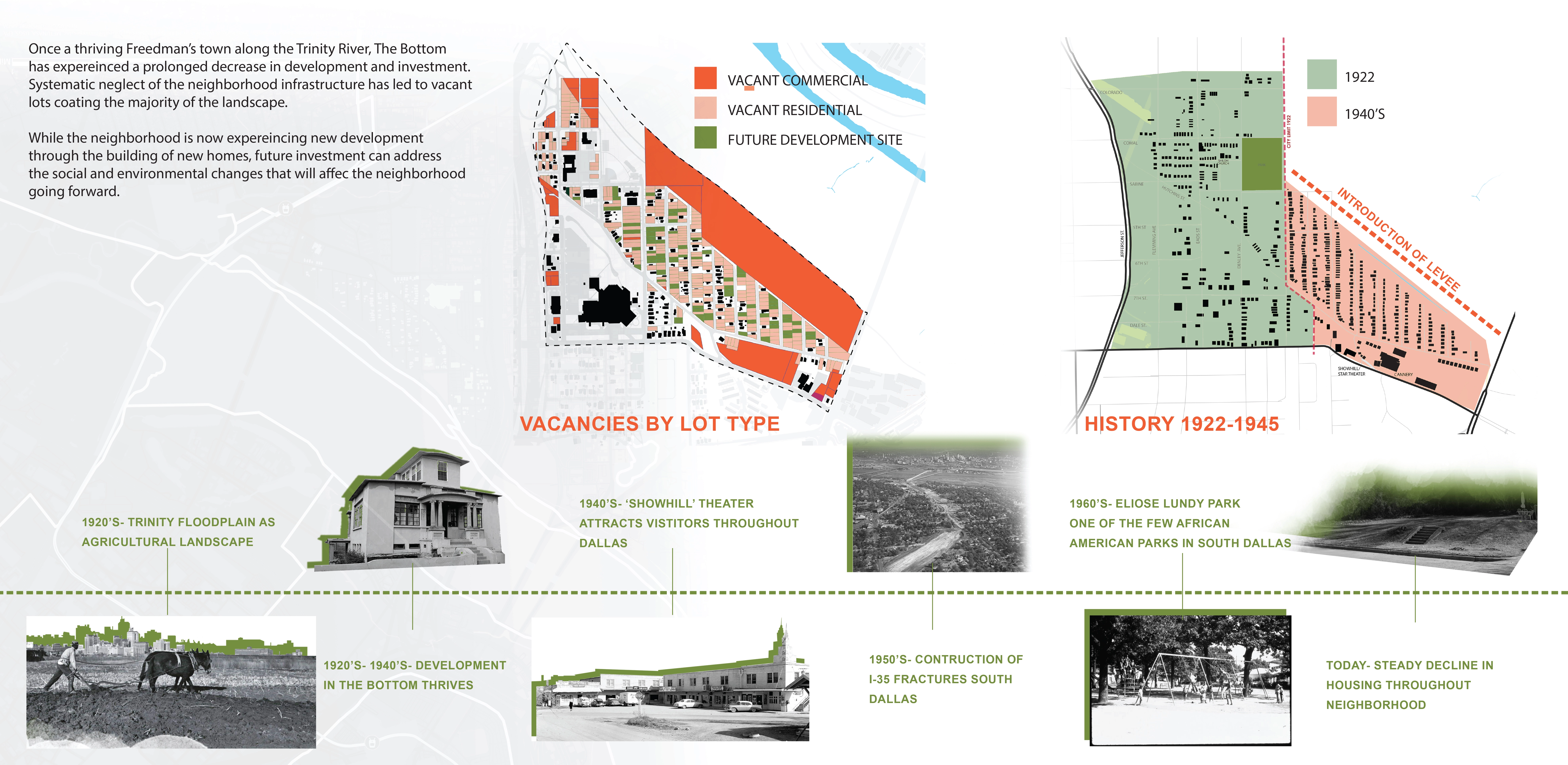 Originally settled in 1845 and later established as a Freedmen’s Town, The Bottom neighborhood was once a thriving, close-knit community occupying 240 acres adjacent to the Trinity River, just over a mile south of Downtown Dallas. Though vibrant businesses, churches, and residences filled the community through the mid-1900s, the neighborhood has since declined, and a majority of the lots not given over to the construction of the Trinity River levees to the north in the 1930s and I-35 to the west in the 1950s now sit vacant—stoops to nowhere with nature reclaiming the land.