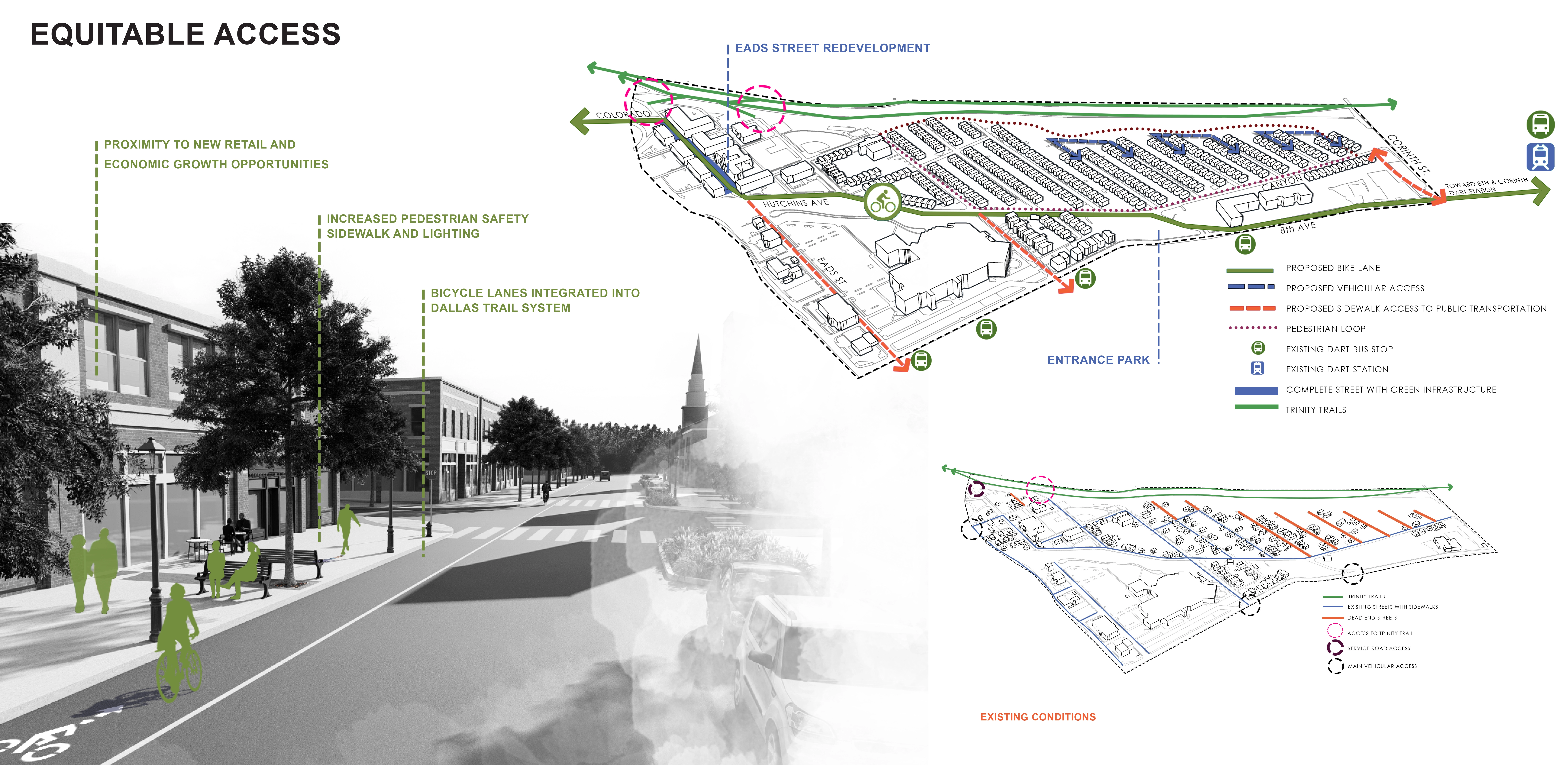 The pillars of environmental, social, and economic sustainability provide an infallible framework for a master plan designed to celebrate the cultural and historical significance of The Bottom, a historic Freedmen’s Town adjacent to the Trinity River just over a mile south of Downtown Dallas. The community’s unique bowl-shaped topography, resulting from natural elevation changes combined with a man-made levy and a barrier created by the I-35 highway corridor, provides for site-specific stormwater and connectivity design opportunities. The master plan implements a green infrastructure network, linking pocket parks, hillside trails, plazas, and green streets into a neighborhood-wide design that successfully mitigates stormwater runoff from the surrounding micro-watershed. Complete streets and a cultural trail inform internal circulation, connect to the greater Dallas community, and link open spaces to provide gathering places for residents and visitors alike. A business incubation center and community garden support local economic opportunities while gateways and signage enhance the neighborhood’s identity. Importantly, the plan provides for growth as The Bottom looks toward the next chapter in its history.
