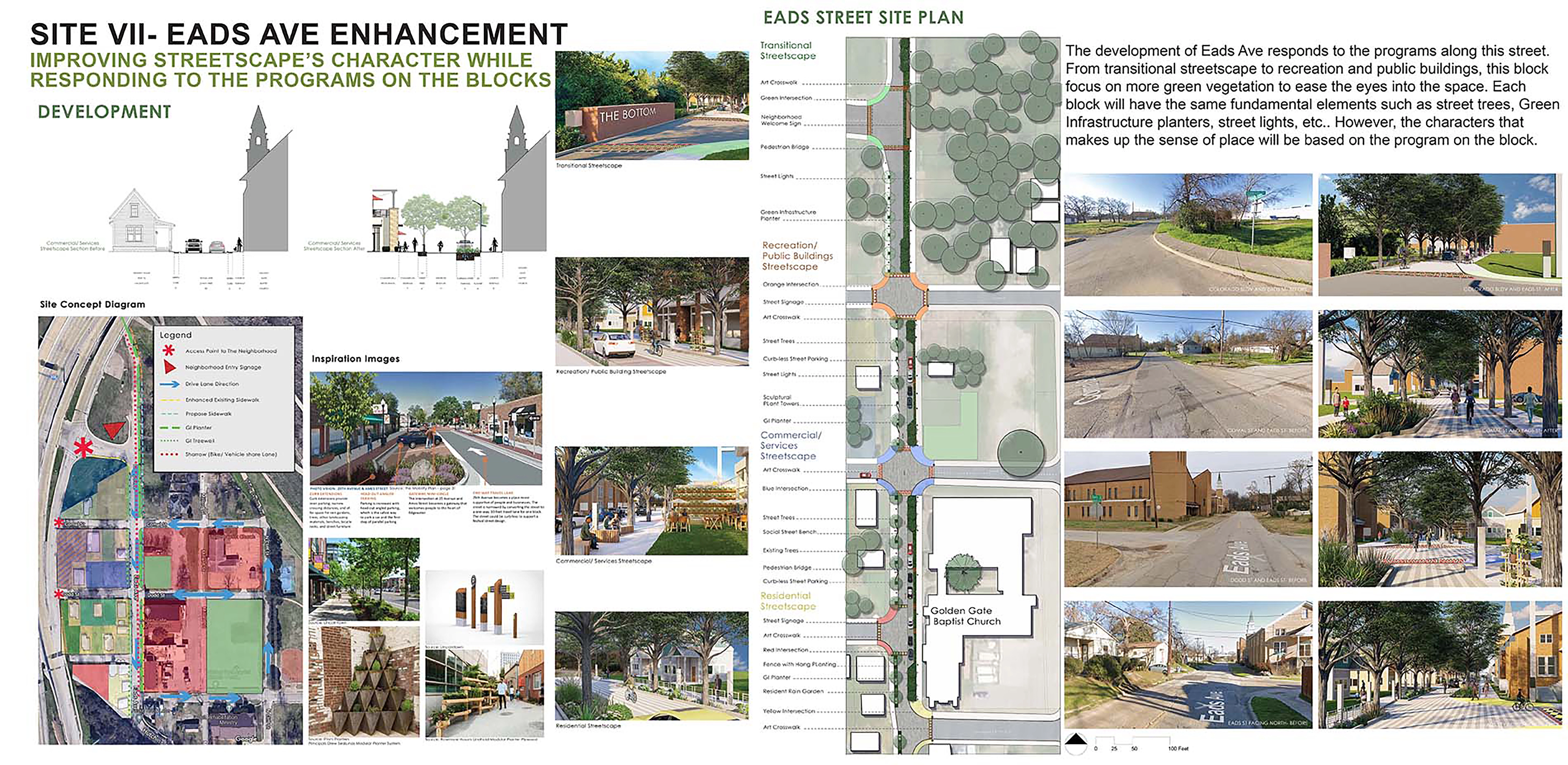 Current reinvestment in the neighborhood through key stakeholders promises an exciting next chapter in The Bottom’s history as the community is reestablished through building nearly 400 new homes and attracting additional residents. As part of this reinvestment, our studio group partnered with The Golden S.E.E.D.S. Foundation, Inc., a local community development corporation serving The Bottom neighborhood, to plan and design spaces that support public amenities and community programming initiatives while incorporating a green infrastructure network into the framework of the neighborhood. The components of this green infrastructure network provide for desirable community amenities while also processing stormwater runoff from the surrounding micro-watershed. Importantly, the overall design features many elements informed by the unique culture and history of the neighborhood gleaned from multiple community engagement opportunities and extensive research.