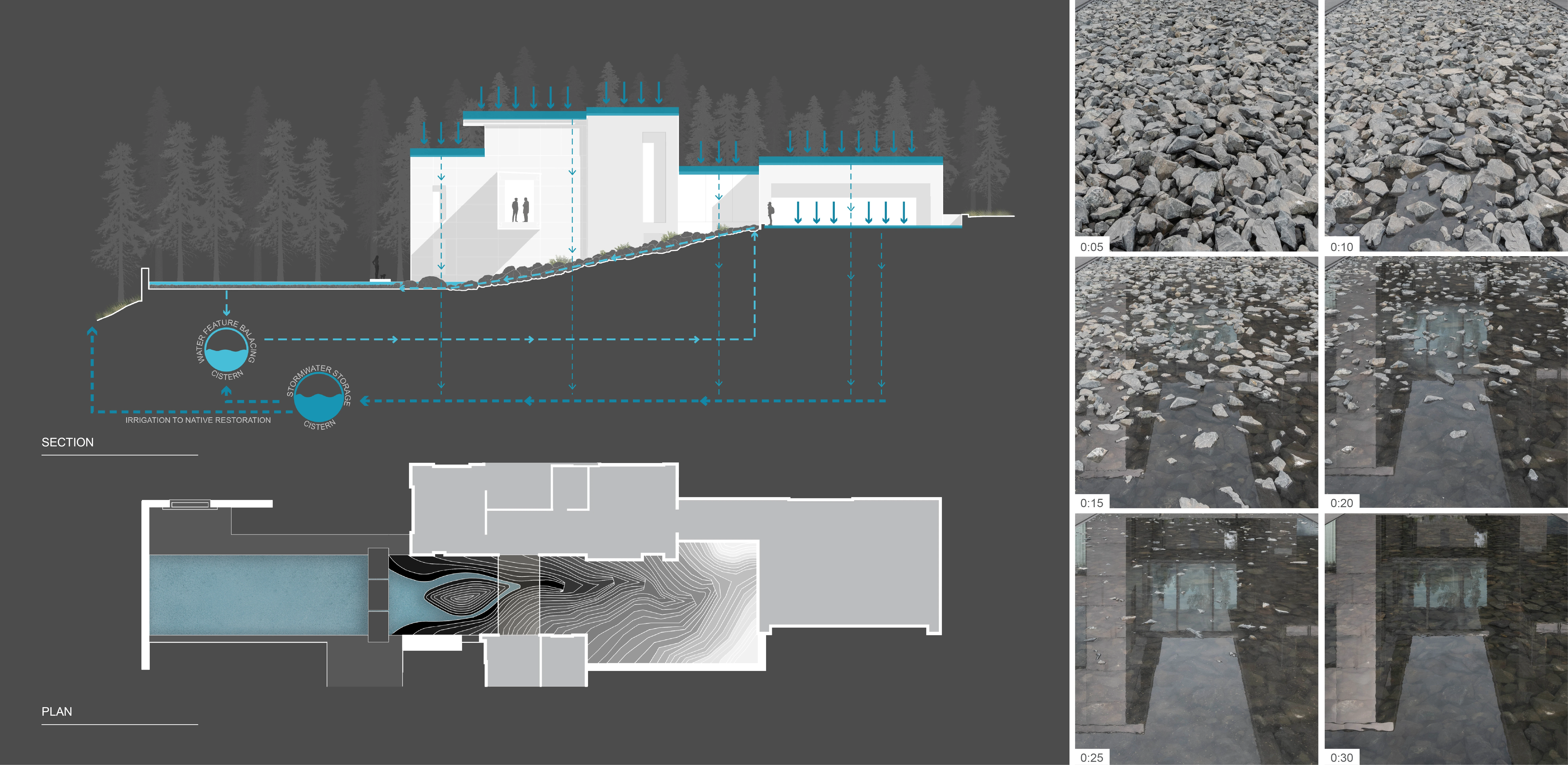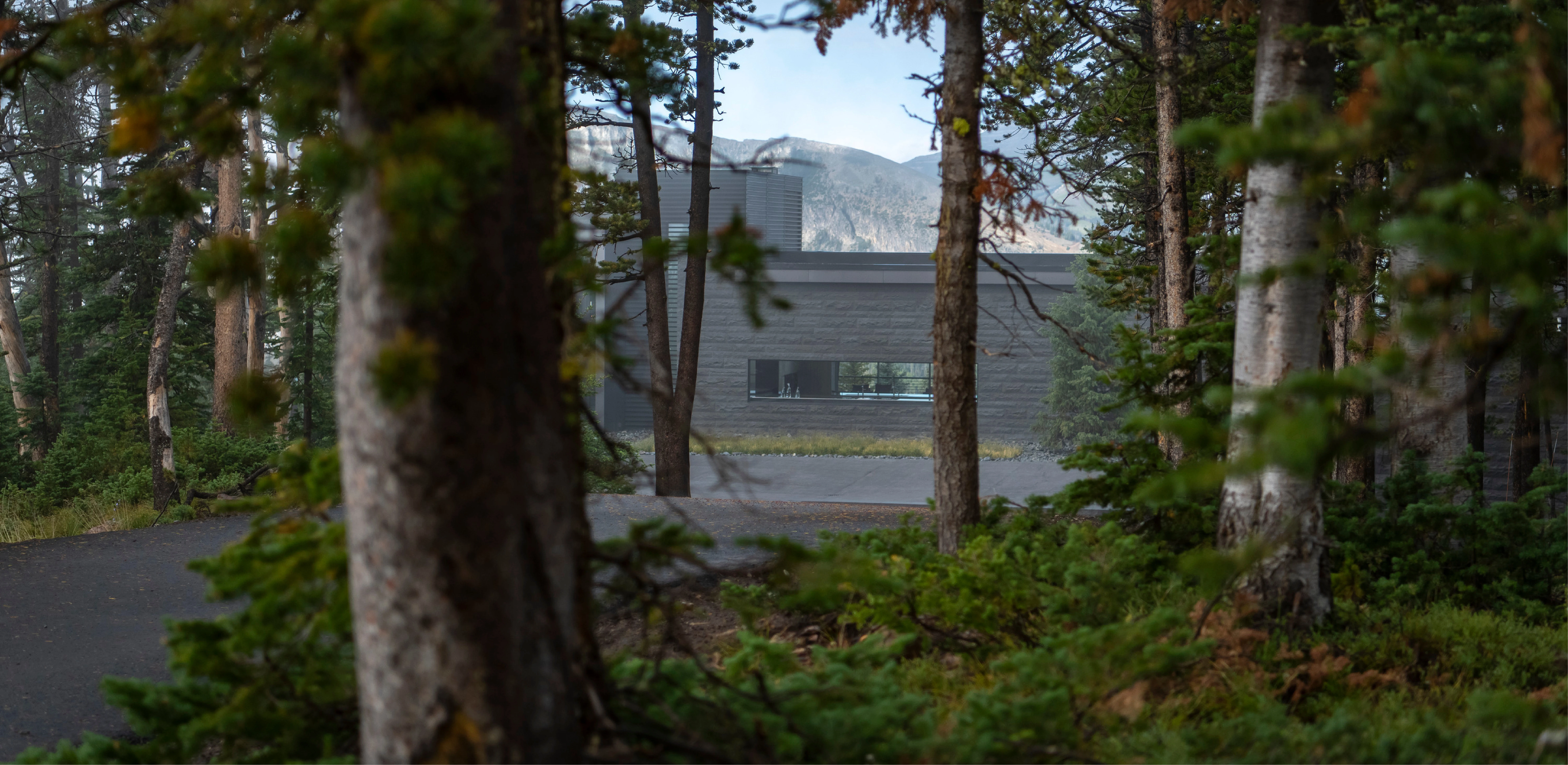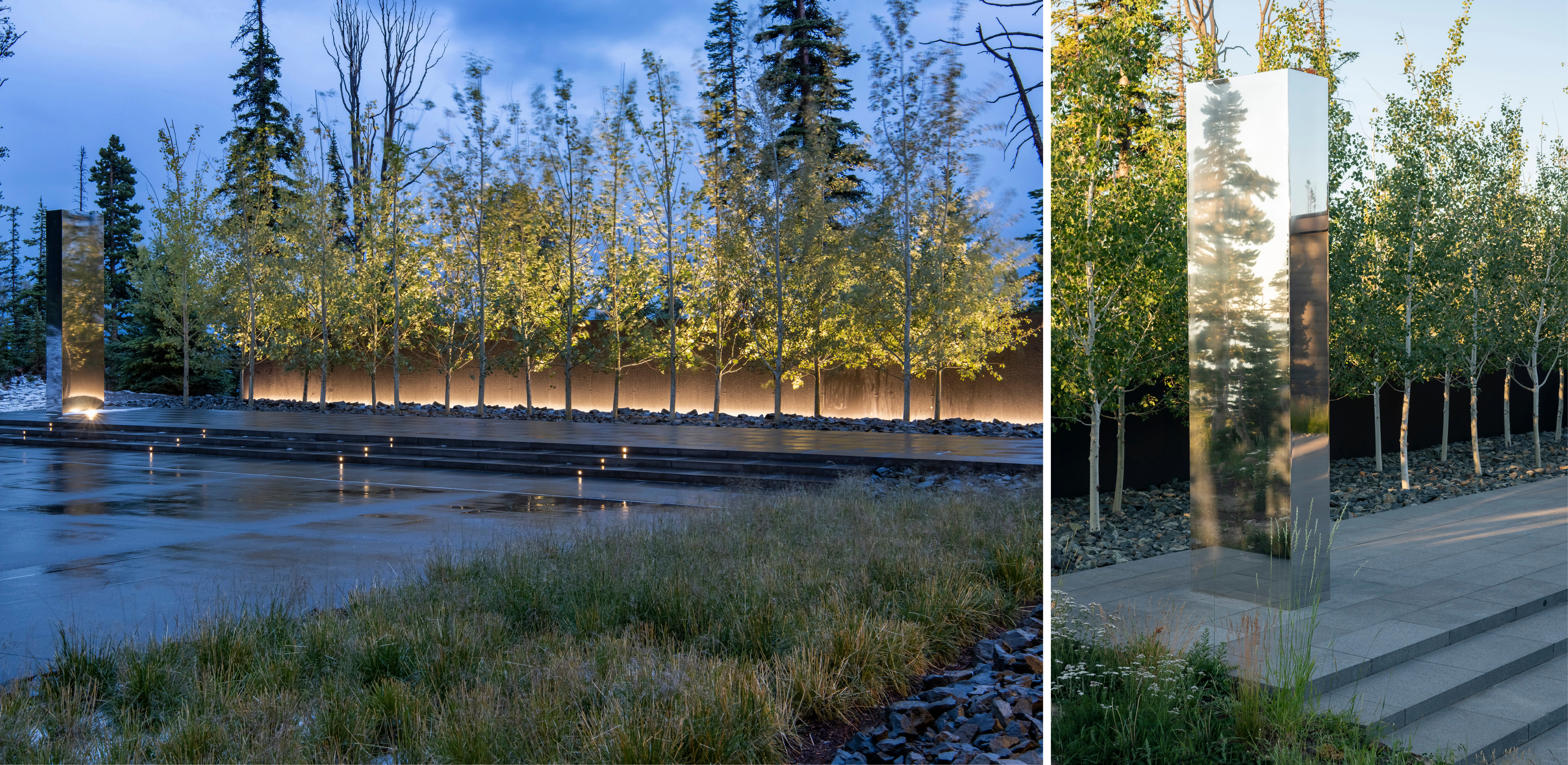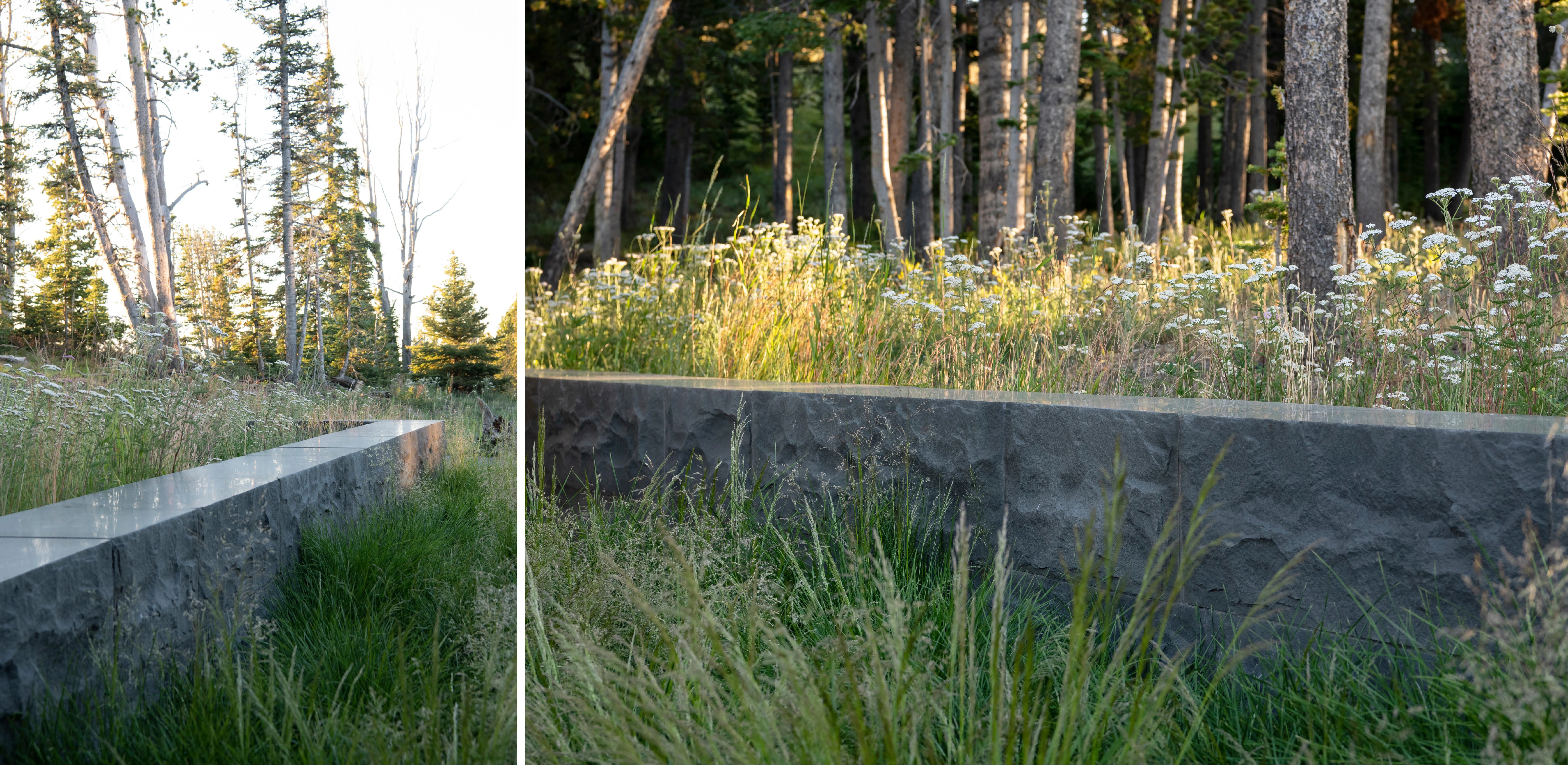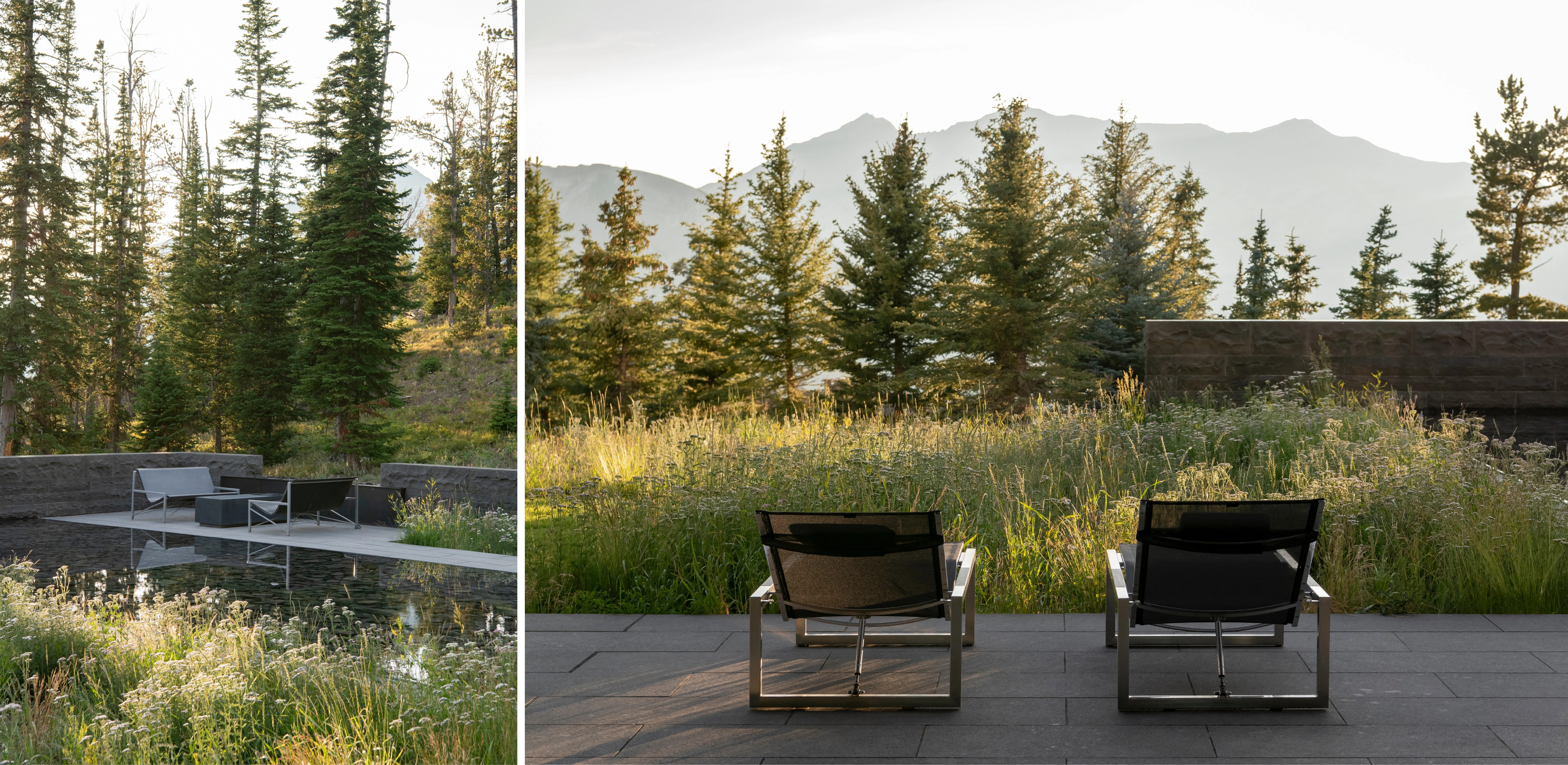 GEOMORPHOLOGY AS STORYTELLING Set on a sparse promontory overlooking Montana’s Madison Range, the 3.5-acre forested site rests within a dramatic landscape shaped by wind, fire, water, and ice. Evidence of such extreme natural forces are discoverable in the backcountry, where rock glaciers—piles of broken and weathered scree rock—scour mountainsides, piling debris in stream beds and alpine lakes. This unique phenomenon offers inspiration for Andesite Ridge, challenging the notion of contemporary landscape design in a rugged environment. INSPIRED BY PLACE Interested in protecting and enhancing the site’s vistas, night skies and wildlife habitat, the owners designed a contemporary mountain home, crisply executed with a nocturnal material palette that purposefully retreats into the coniferous forest. In response, landscape expressions are disciplined, limited to a narrative that extend the visual and functional relationship of the home into the landscape, connecting its inhabitants to the story of this place. PRESERVING THE INTEGRITY OF THE LAND The entry drive gracefully embraces the dramatic contours of the site, its artful maneuvering around mature pines and lichen-covered escarpments slowly revealing filtered views of the rugged mountains and home beyond. Upon arrival, a linear walk – composed of cut pavers and loosely placed native rock – extends from the home’s entry, sheltered by a tightly-spaced grove of quaking aspens that cast an ever-changing play of light and shadow upon the shou sugi ban walls of the home. TRANSCENDING ART AND FUNCTION Traversing beneath a glassy bridge linking public and private areas of the home, a stream—the central garden element that metaphorically abstracts and celebrates the ephemeral nature of snow-fed creeks and lakes as a performative art installation—accommodates onsite water harvesting, stormwater management and fire suppression needs. Emerging as a small spring, water spirits its way through broken rock fragments, creating an audible spectacle that permeates interior spaces. Craggy boulders, softened with pockets of creeping groundcover, appear intermittently, their organic jagged forms set in poetic contrast to architectural stone walls. Below, water diffuses across a rugged delta and into a plane of still water, reflecting adjacent meadowlands and theatrical skies. Recycled water, collected from spring meltwater and rainwater runoff, is stored in a series of underground, fire protection cisterns, and allowed to periodically recirculate – transforming a dry talus bed into a glassy surface in 30-minute intervals, and then drained to reduce evaporation. ENCOURAGING NATURAL PROCESSES The design realizes a commitment to protecting and enhancing the natural beauty of the site while addressing critical environmental issues facing the Northern Rockies, including forestry and wildfire management, water conservation and ecological disturbance. While avoiding impact to keystone species that offer high nutritional value as migratory habitats, aggressive clearing of deadfall introduces light and moisture to foster regeneration. Reconstructing 27,000 square feet requires irrigation only until establishment and mimics existing conditions with native grasses and wildflowers that complement the modern lines and tones of the architecture. Since construction, indigenous wildlife has returned with a robustness that belies the fragility of its alpine environment.