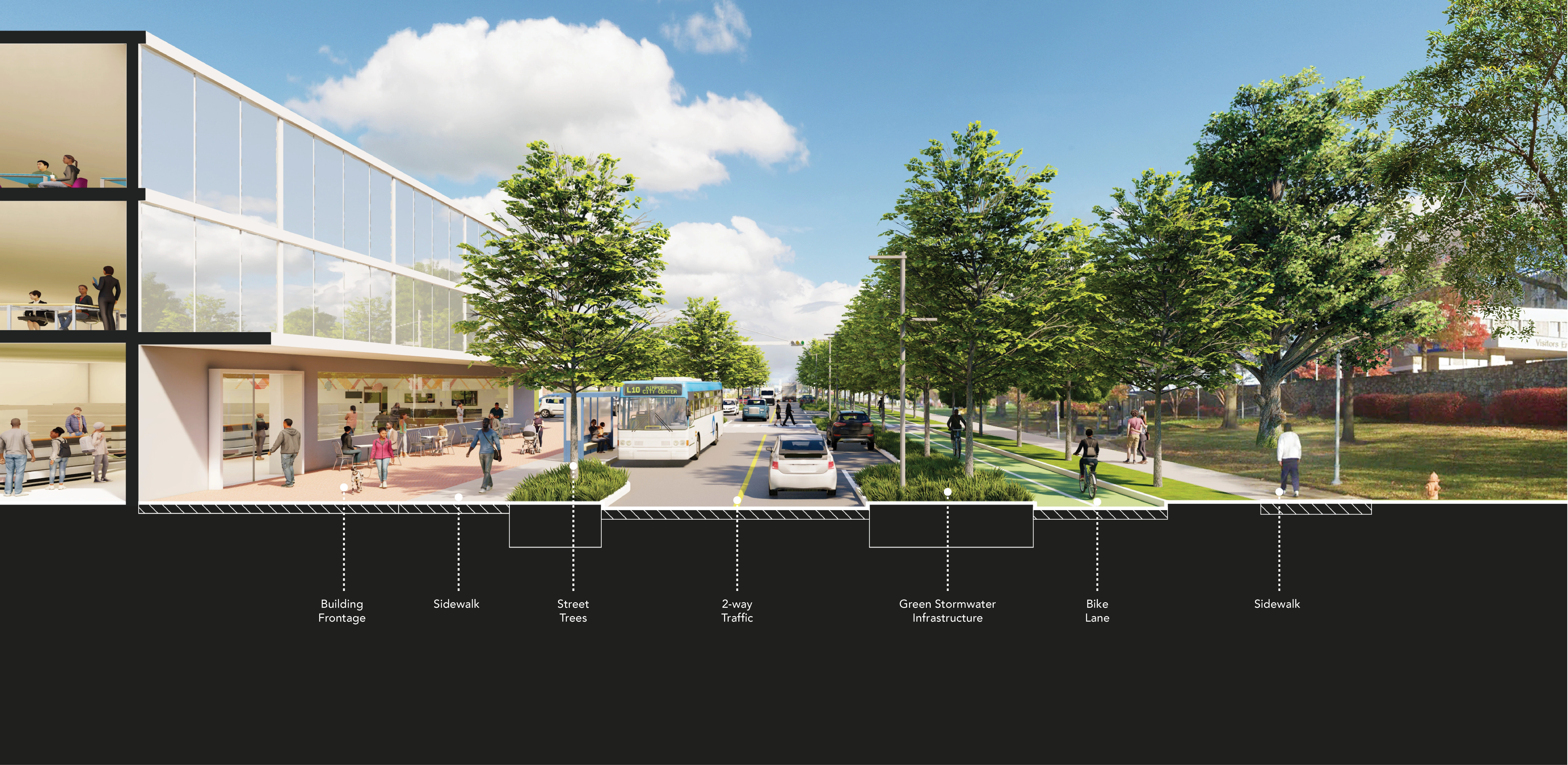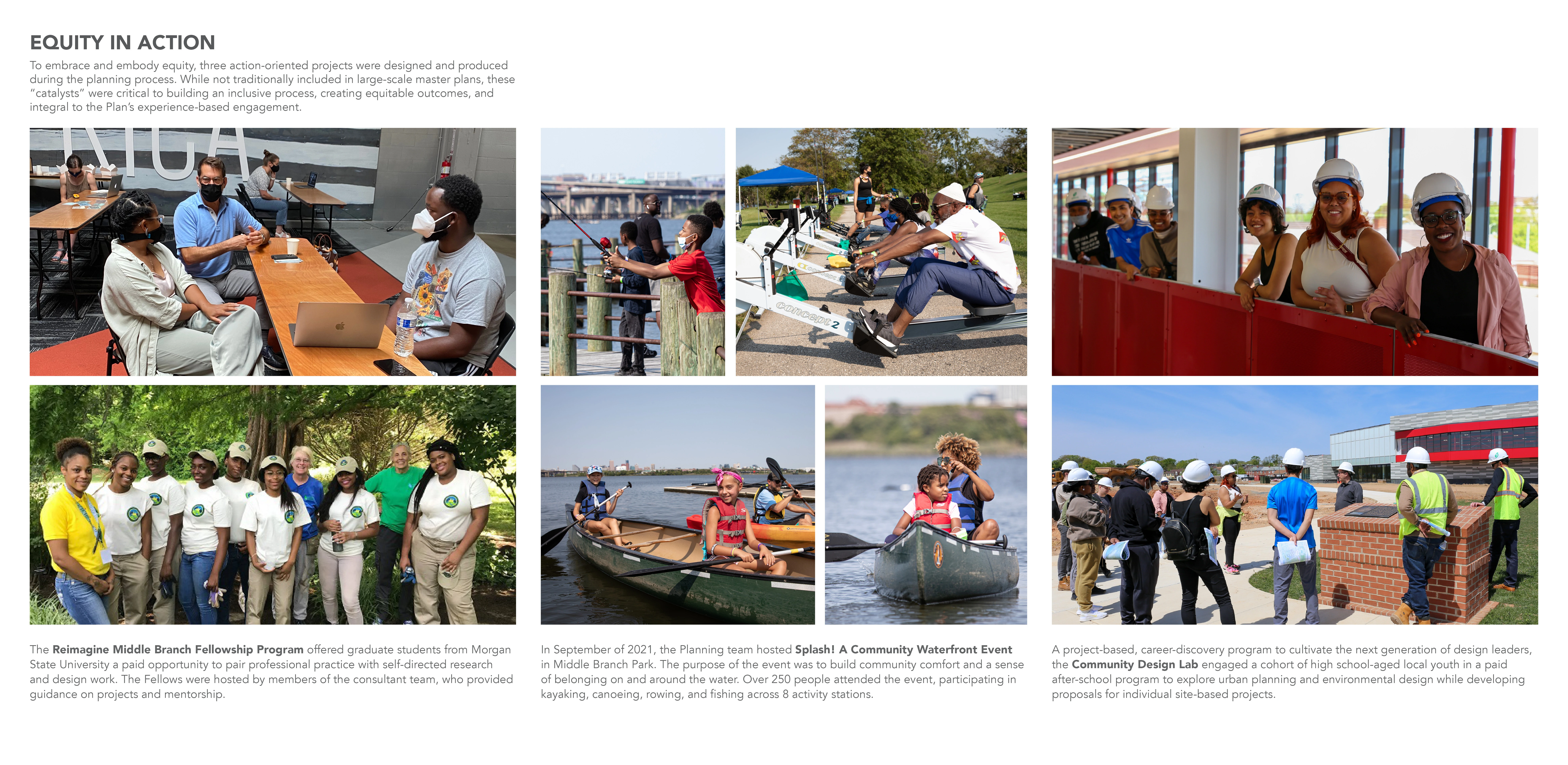 The Reimagine Middle Branch Plan presents a powerful, long-term vision to connect South Baltimore communities with one another and their waterfront. The Plan’s study area includes 11 miles of shoreline, 598 acres of parkland and 19 neighborhoods across South Baltimore. Communities there live near or adjacent to one of the Chesapeake Bay’s most neglected shorelines and are often separated from their waterfront by transportation infrastructure or industrial land uses. Amplified by the challenges of climate change and systemic racism, environmental injustices here diminish quality of life, especially for working-class residents of color. Fundamentally about equity and justice, resilience and health, the Plan imagines a holistic transformation of place supported by new jobs, wealth generation and quality of life amenities that extend beyond the built environment. Equity Frameworks Four “Equity Frameworks” (Restore the Shoreline, Transform Barriers into Connections, Create Active & Inclusive Parks and Support Communities with Equitable Development) structure the Plan’s design vision. The equity frameworks translate community input into design, programming, development and policy recommendations to be implemented over the next two decades. Investments that include living shorelines, complete streets, recreational trails, park amenities, piers and boardwalks are concentrated in the neighborhoods which have experienced acute disinvestment. Economic development and education initiatives are integrated with public realm improvements to catalyze a holistic transformation of place. Nature-Based Solutions A deep dive into the shoreline framework illustrates the depth, detail and level of resolution achieved: Over time, the Middle Branch shoreline has been reshaped and hardened by industry and infrastructure. These changes exacerbate poor water quality and the impacts of flooding and storm surge. The Plan recommends restoring the thick, green and resilient shoreline edge that once defined this Chesapeake Bay tributary. This strategy reintroduces natural systems to improve water quality and ecological systems while fostering interaction between people and their environment on new trails, boardwalks and in education spaces. Constructed wetlands and berms along the shoreline protect critical infrastructure, including a hospital and city-wide power plant, from flooding and storm surge. The implementation of this new shoreline utilizes excess dredge material from the Port of Maryland and catalyzes the establishment of a native plant nursery managed by a local non-profit and staffed by community members to supply native grasses and wetland plants. A Community-Driven Plan Creating this compelling vision was only possible with the creative and expert input of the community. The team reached the public in creative ways, including a mobile project hub that hosted pop-up events and a curated interview series shared on the Plan’s social media channels. To embody equity, three action-oriented projects were produced during the planning process: Splash! A Community Waterfront Event, the Morgan State University Fellowship Program, and the Community Design Lab. While not traditionally included in large-scale master plans, these “catalysts” were critical to building equitable outcomes. With recent approval by the Baltimore Planning Commission, the Reimagine Middle Branch Plan is poised to deliver visionary projects and programs to South Baltimore.