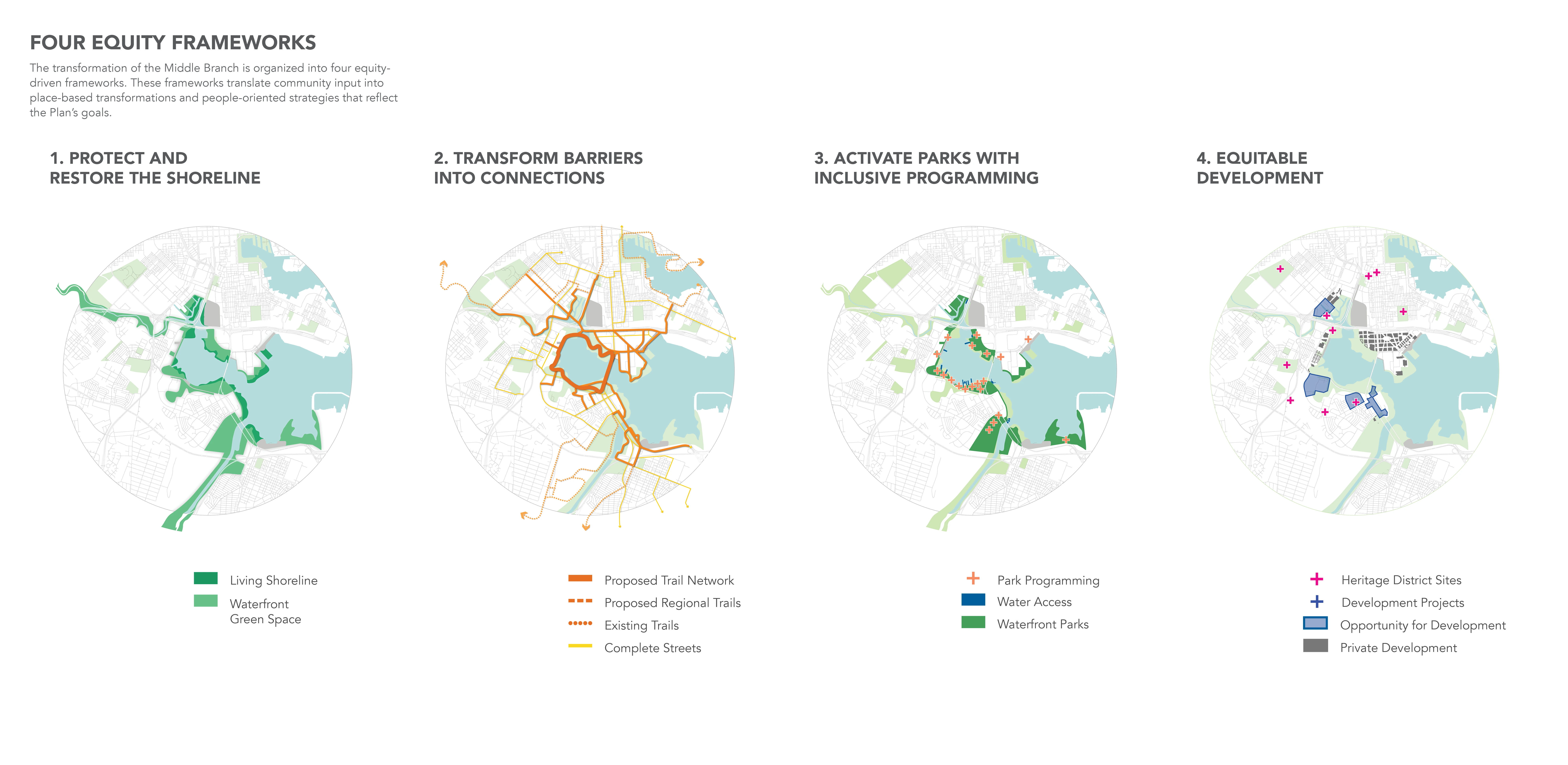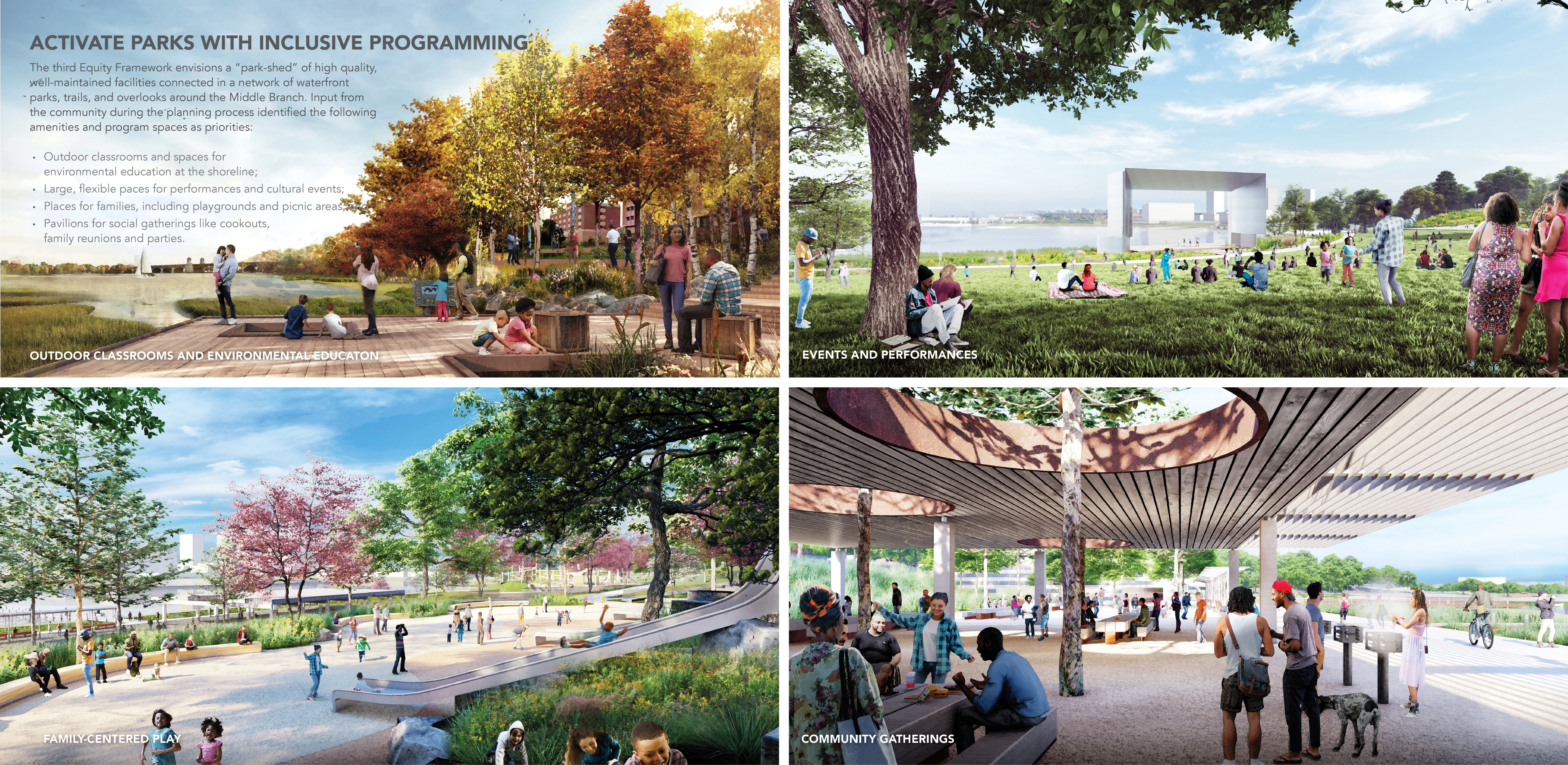 Reimagine Middle Branch is a community-driven initiative to reconnect South Baltimore with a system of world-class parks, trails, programs and economic development plans along 11 miles of the Middle Branch shoreline on the Patapsco River. While the Plan outlines a visionary physical transformation of the Middle Branch, it is also meant to catalyze the intangible transformation of place for one that is equitable and inclusive. To that end, the Plan recommends a series of capital improvements along with public programs, partnerships, policies, job opportunities and equitable economic development initiatives. As a result, this Plan is fundamentally about environmental and social justice, resilience and health.