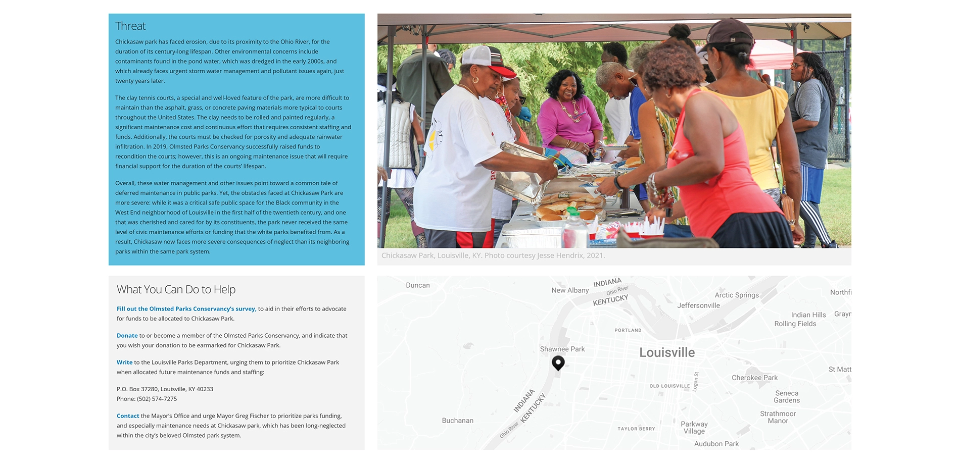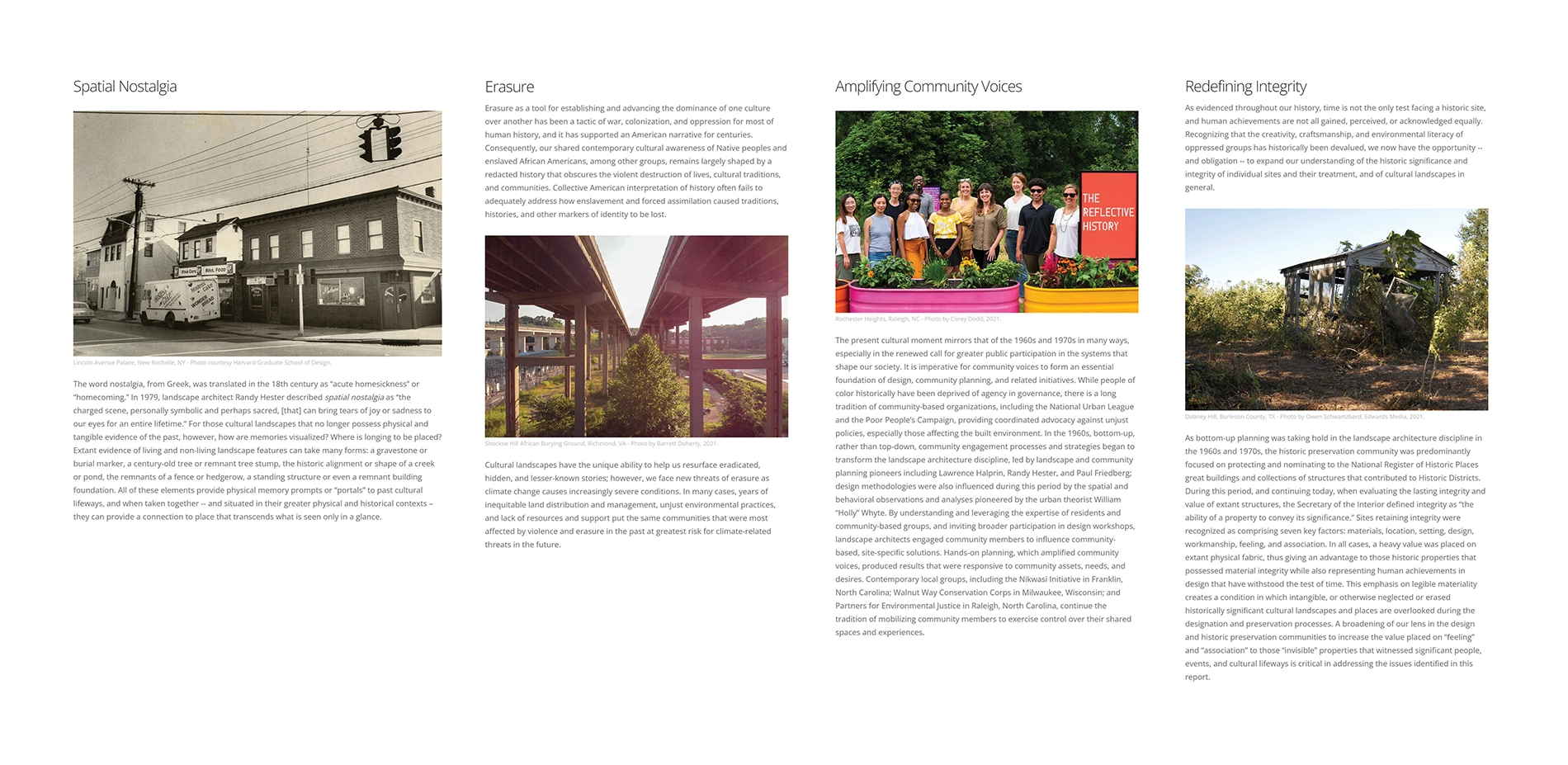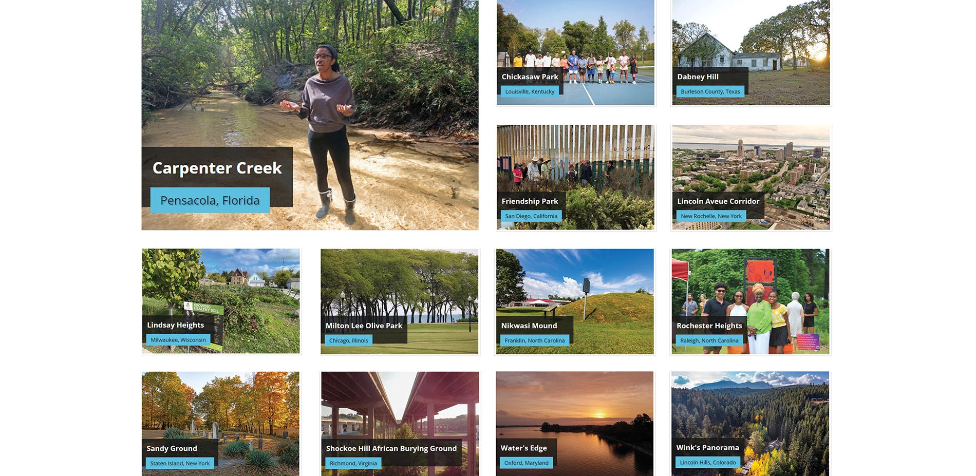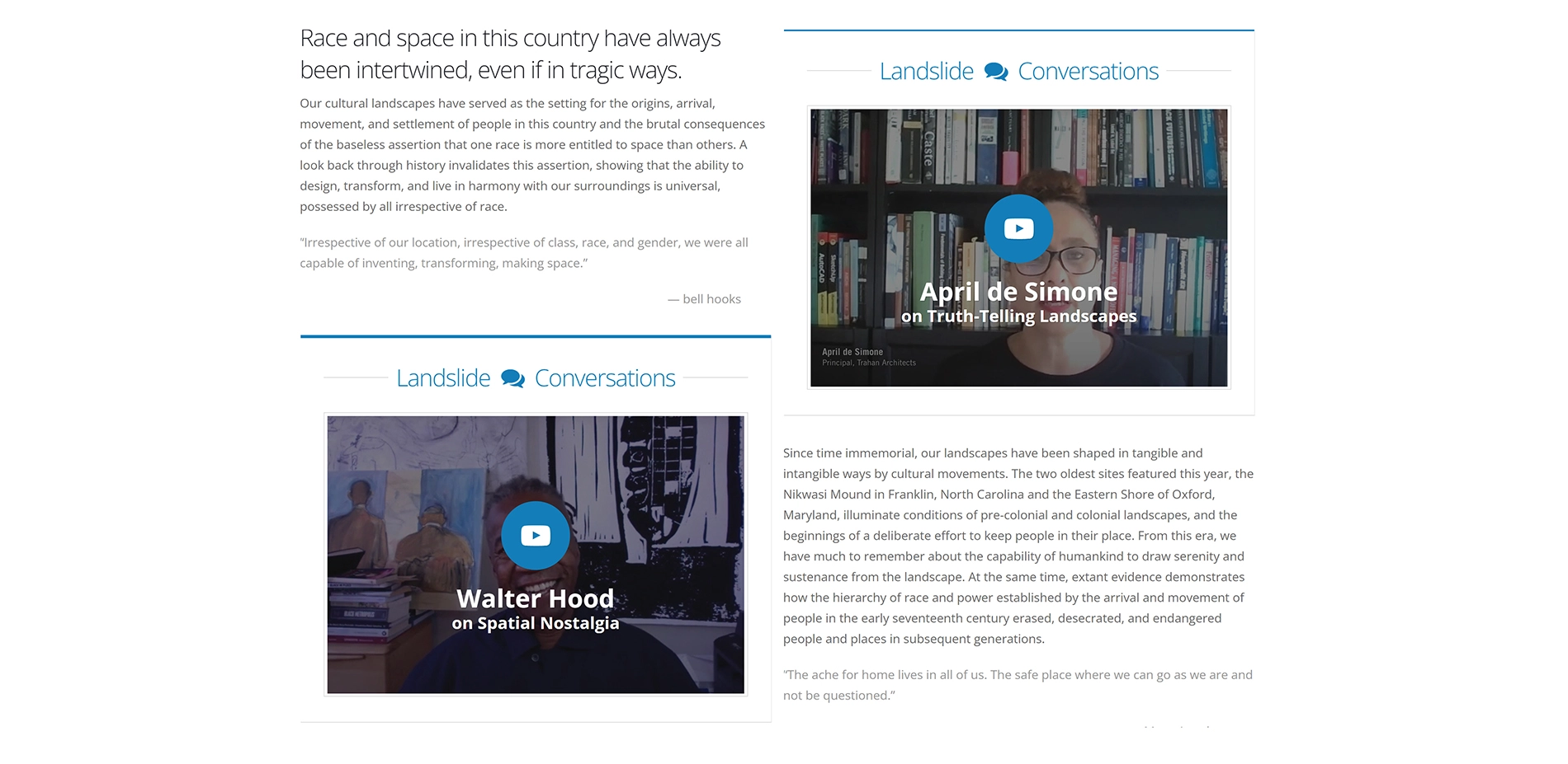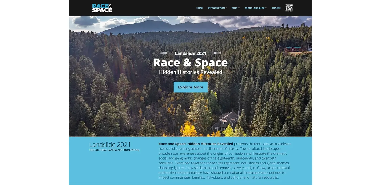 Landslide: Race and Space is a thematic digital report and exhibition about 13 threatened landscapes associated with African Americans, Hispanic Americans, and Native peoples. It includes an introduction detailing the historic relationship between race and space in America, an illustrated history of each site, common inequities and threats, defined as “throughlines,” and individualized calls to action. The digital exhibition also includes richly produced video interviews (2-5 minutes each) with landscape architects, historians, designers, and kin-keepers who offer compelling personal perspectives on the “throughlines” and bring to life each site’s history/significance. This time-sensitive report was produced in only three months in 2021.