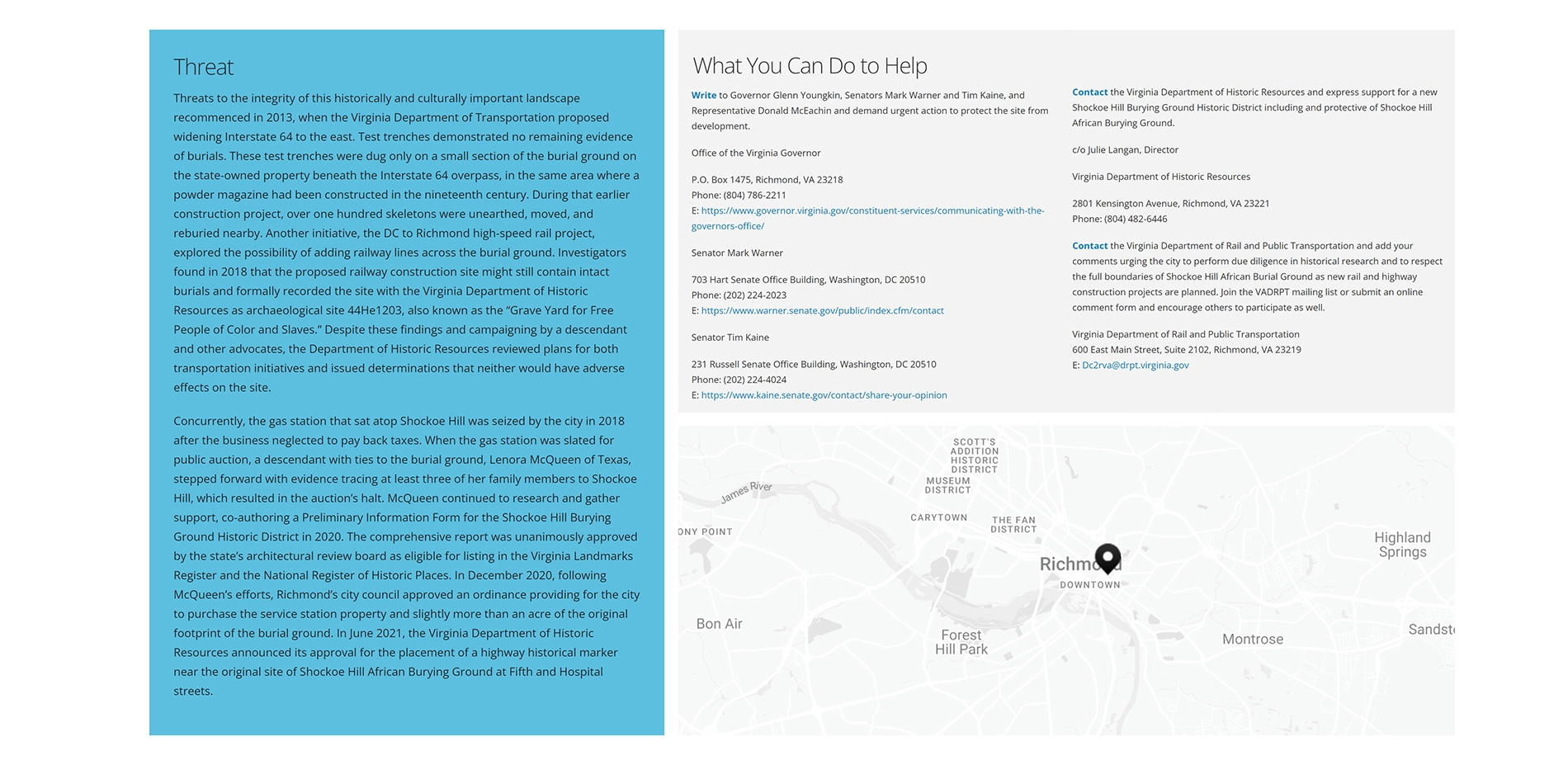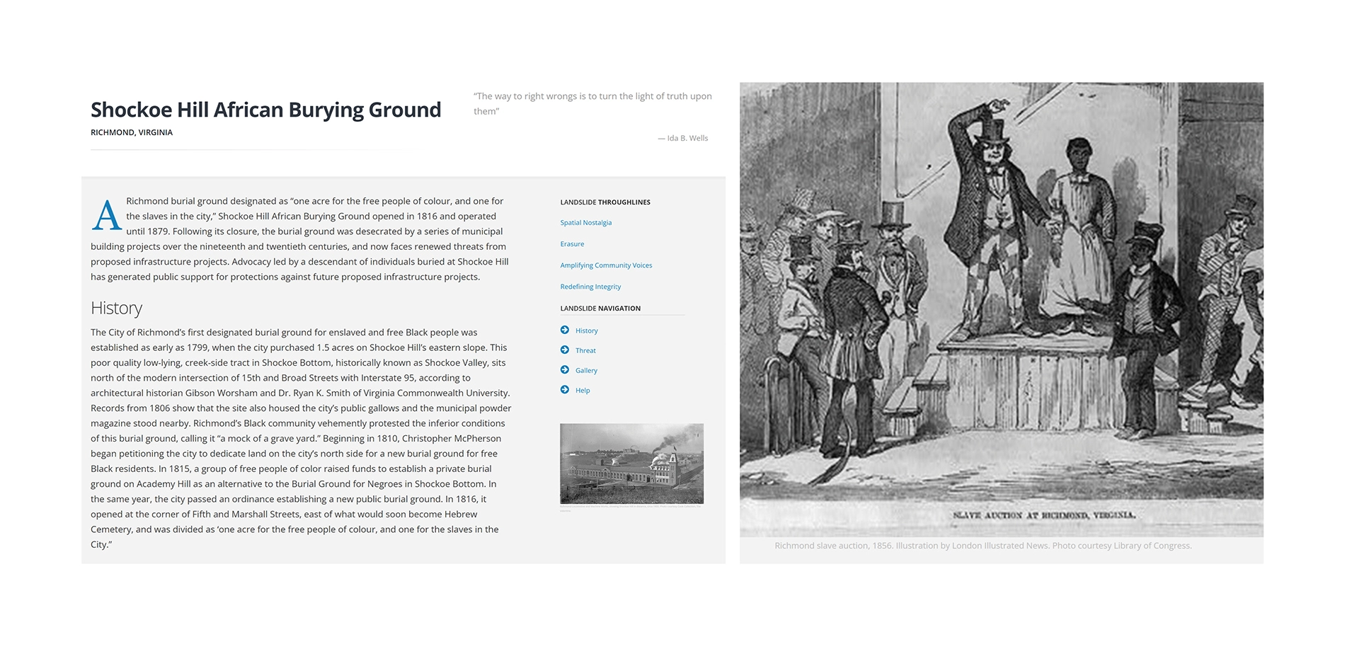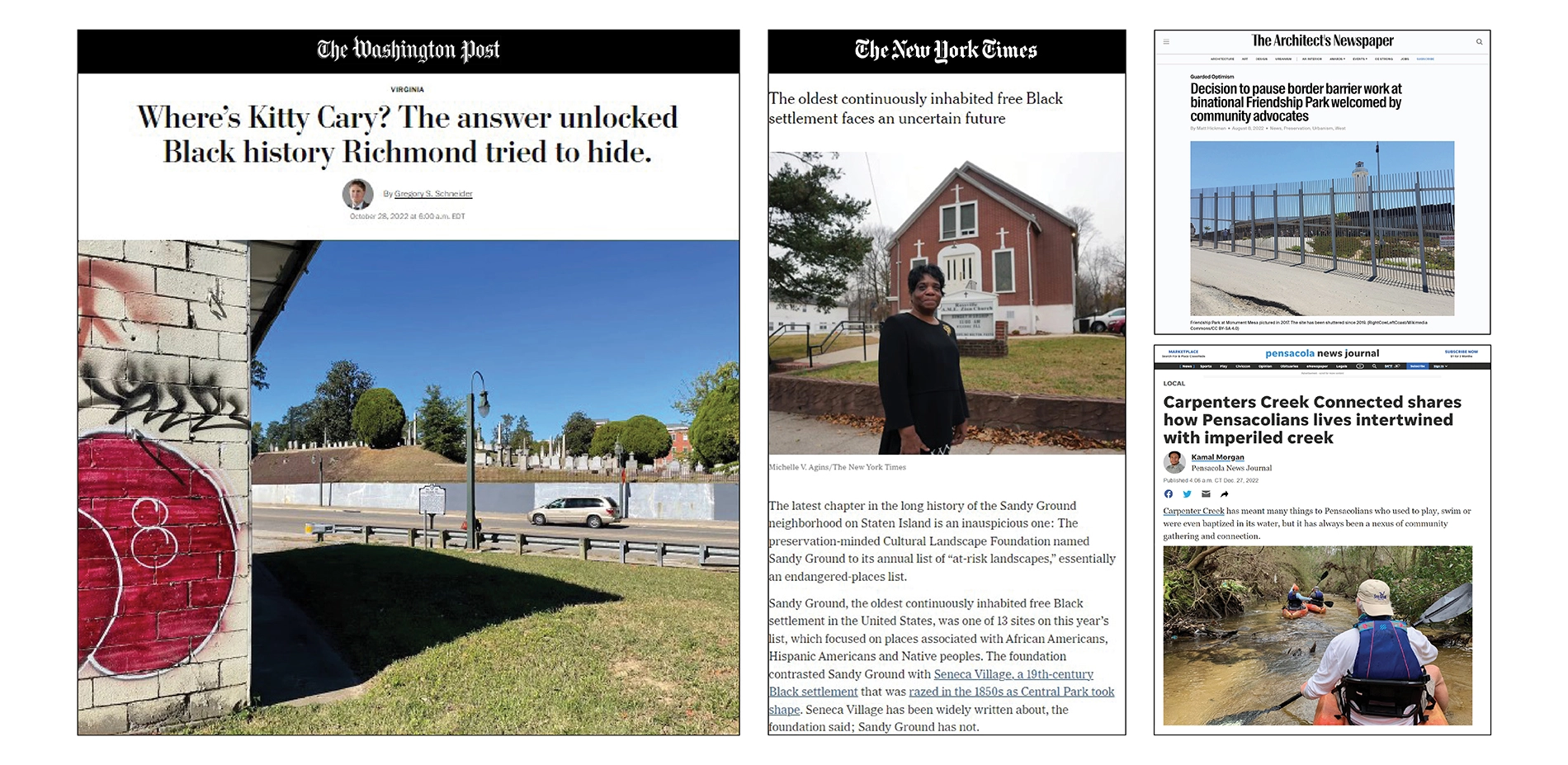 Purpose: The Landslide: Race and Space report and exhibition highlights 13 threatened US cultural landscapes associated with African Americans, Hispanic Americans, and Native peoples. The majority are not nationally recognized for their historical/cultural significance; some have been altered or erased. Landslide includes an introduction detailing the historic relationship between race and space in the US, illustrated site histories, common inequities/threats, defined as “throughlines,” and individualized calls to action. Short video interviews with landscape architects, historians, kin-keepers, etc. also offer compelling perspectives on the “throughlines,” revealing each site’s history and significance. Audience: Landscape architects, students, historians, African- and Hispanic Americans, immigrant communities, Native peoples, women’s history and urban studies, site stewards, policy makers, and the public. Messages: The Landslide sites reveal local stories and global themes, shedding light on how settlement and removal, slavery and Jim Crow, urban renewal, and environmental injustice have shaped the land and continue to impact cultural lifeways and natural resources. Critical to the examination of each site are 4 shared commonalities or “throughlines”: [1] “spatial nostalgia,” for those cultural landscapes that no longer possess physical/tangible evidence of the past; [2] “erasure,” as a tool for establishing and advancing the dominance of one culture over another; [3] “amplifying community voices,” calls for greater public participation in shaping our society; [4] “redefining integrity,” historic site designations informed by the Secretary of the Interior’s limited definition of integrity as “the ability of a property to convey its significance.” One featured site, Richmond, VA’s Shockoe Hill African Burying Ground was, in the 19th century, the nation’s largest burial site for free and enslaved people of color, with over 22,000 interments. It has suffered more than a century of abuse and erasure. Now high-speed rail linking Richmond and Washington, DC could go through remnants of the site. The site entry includes a 5-minute video narrated by advocate Lenora McQueen whose fourth great grandmother, Kitty Cary, was an enslaved woman buried at Shockoe in 1857. All 4 throughlines are present at Shockoe. Impact & effectiveness: Landslide was the focus of a sustained, comprehensive strategic media campaign that yielded national coverage (e.g. the New York Times, Washington Post); local/regional coverage associated with specific sites; industry publications (feature stories in Architect’s Newspaper, Landscape Architecture, etc.). The interest generated by Landslide led to the creation of a series of free, online Race and Space Conversations, featuring landscape architects and others, that attract more than 500 virtual attendees per event. The report also led to a dedicated advocacy campaign by TCLF resulting in Shockoe Hill’s listing in the National Register of Historic Places in July 2022. Distribution: A comprehensive, sustained strategic media strategy (see impact & effectiveness), inclusion in bi-weekly e-newsletters and dedicated e-blasts reach more than 31,000 recipients, TCLF’s YouTube channel, Landscape Architecture Magazine ad, and more.