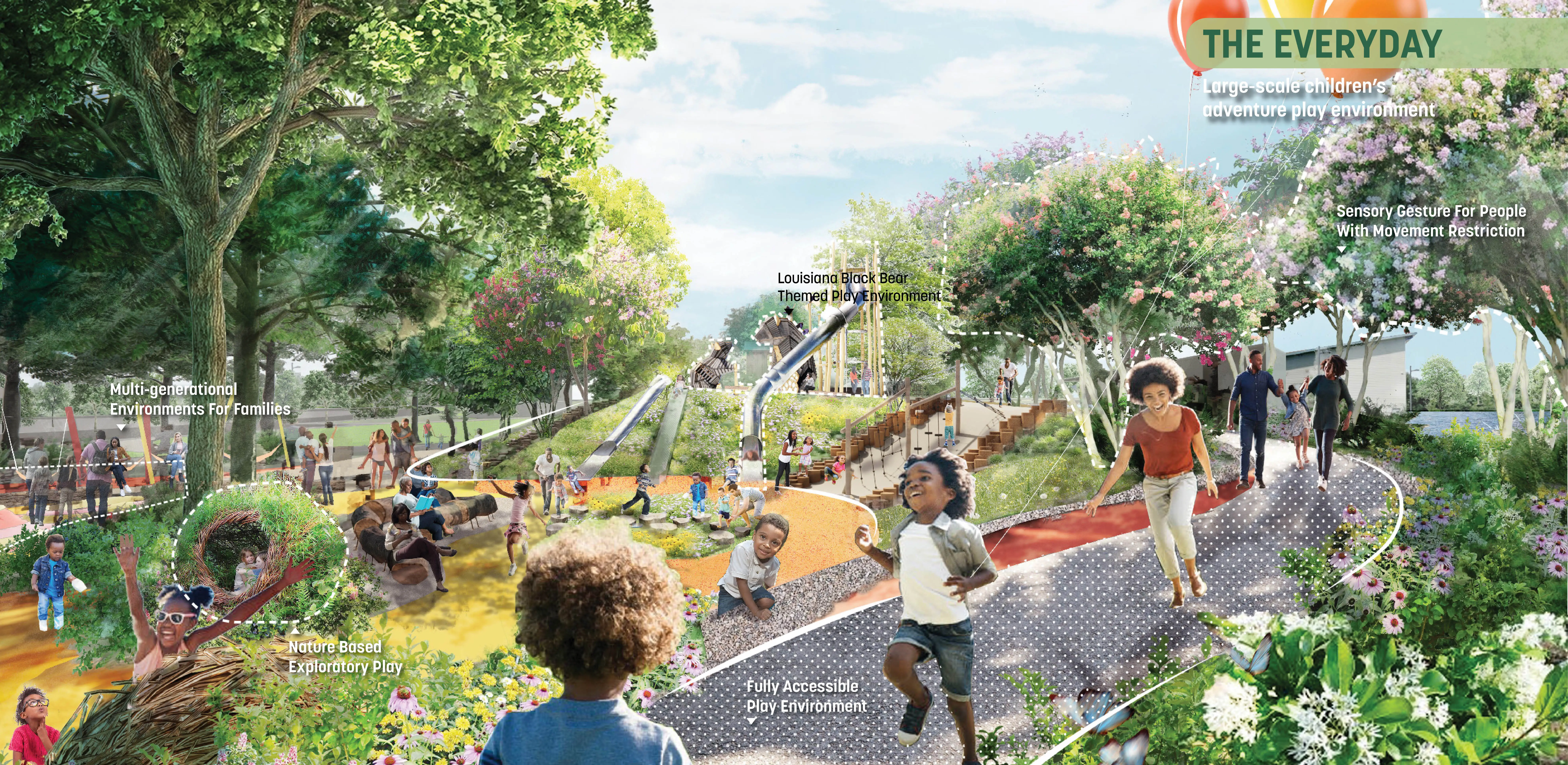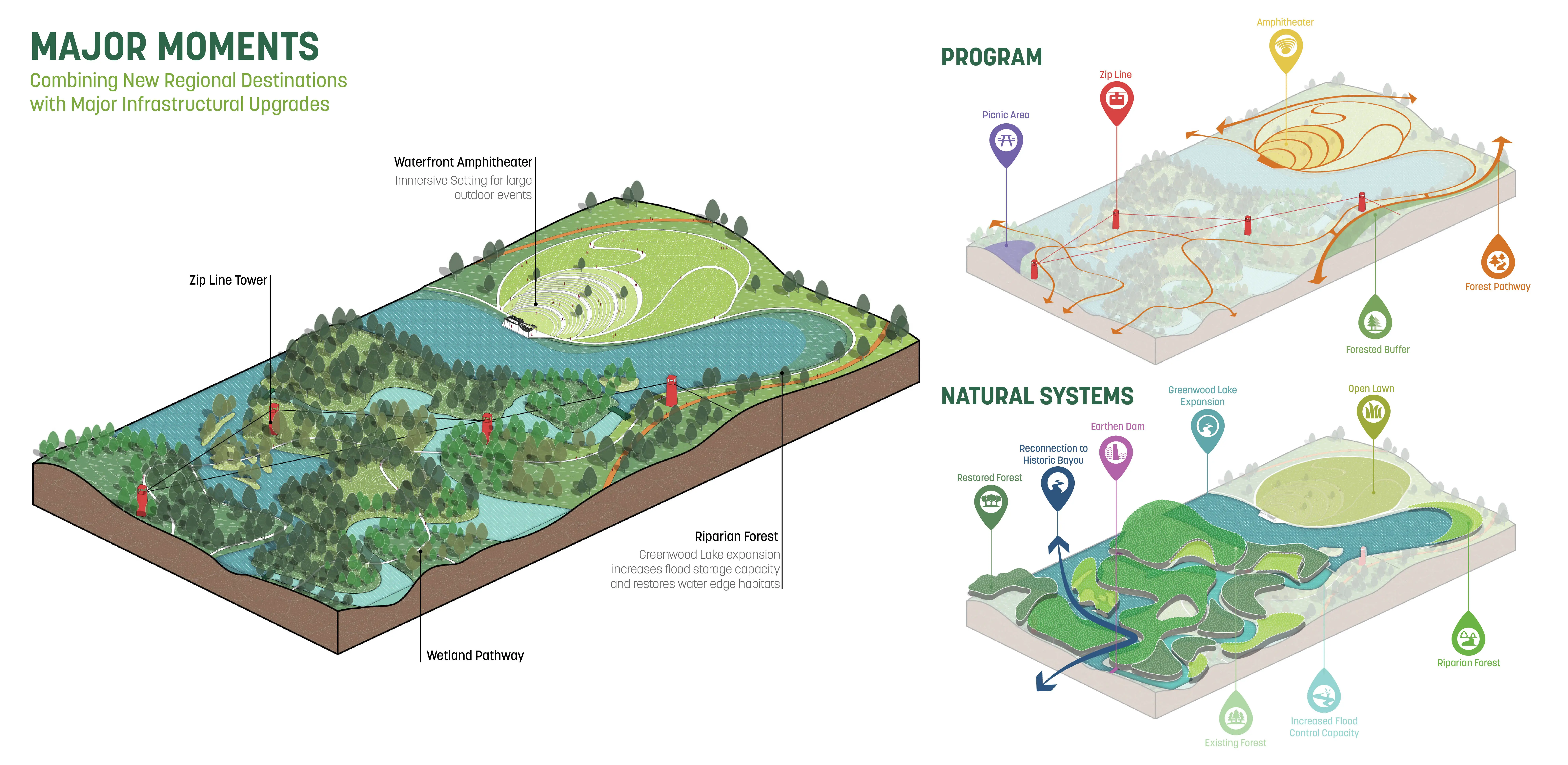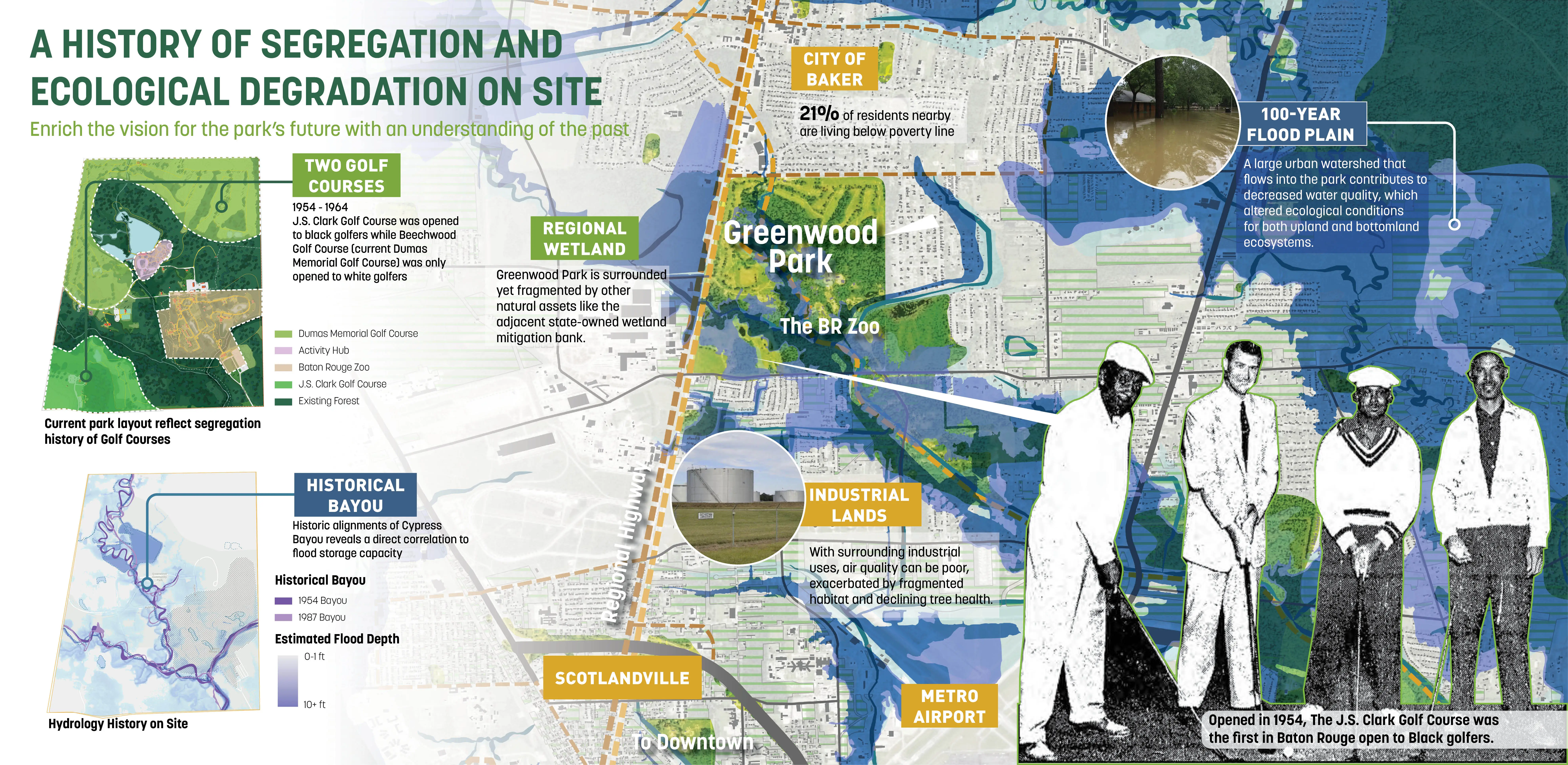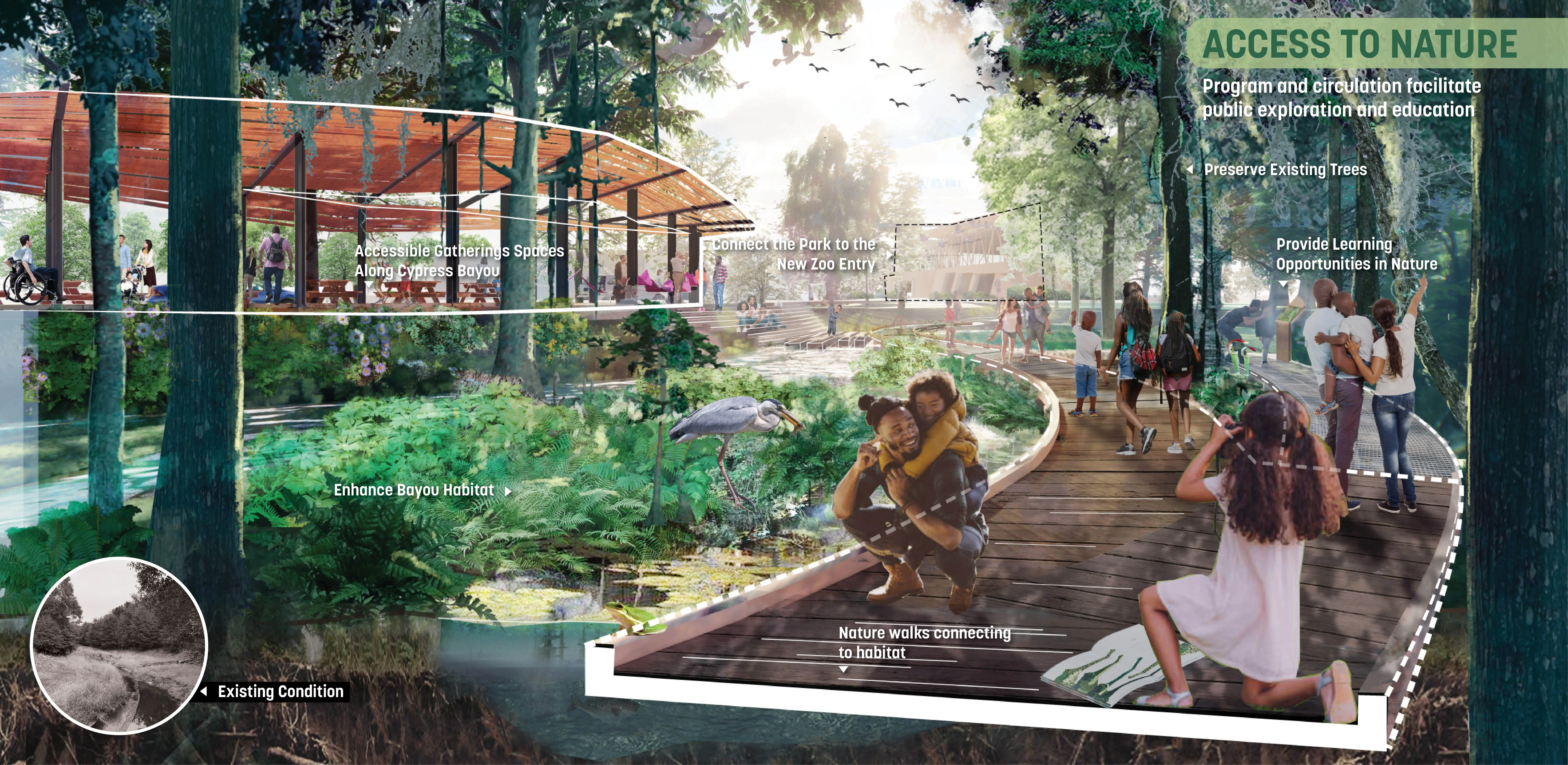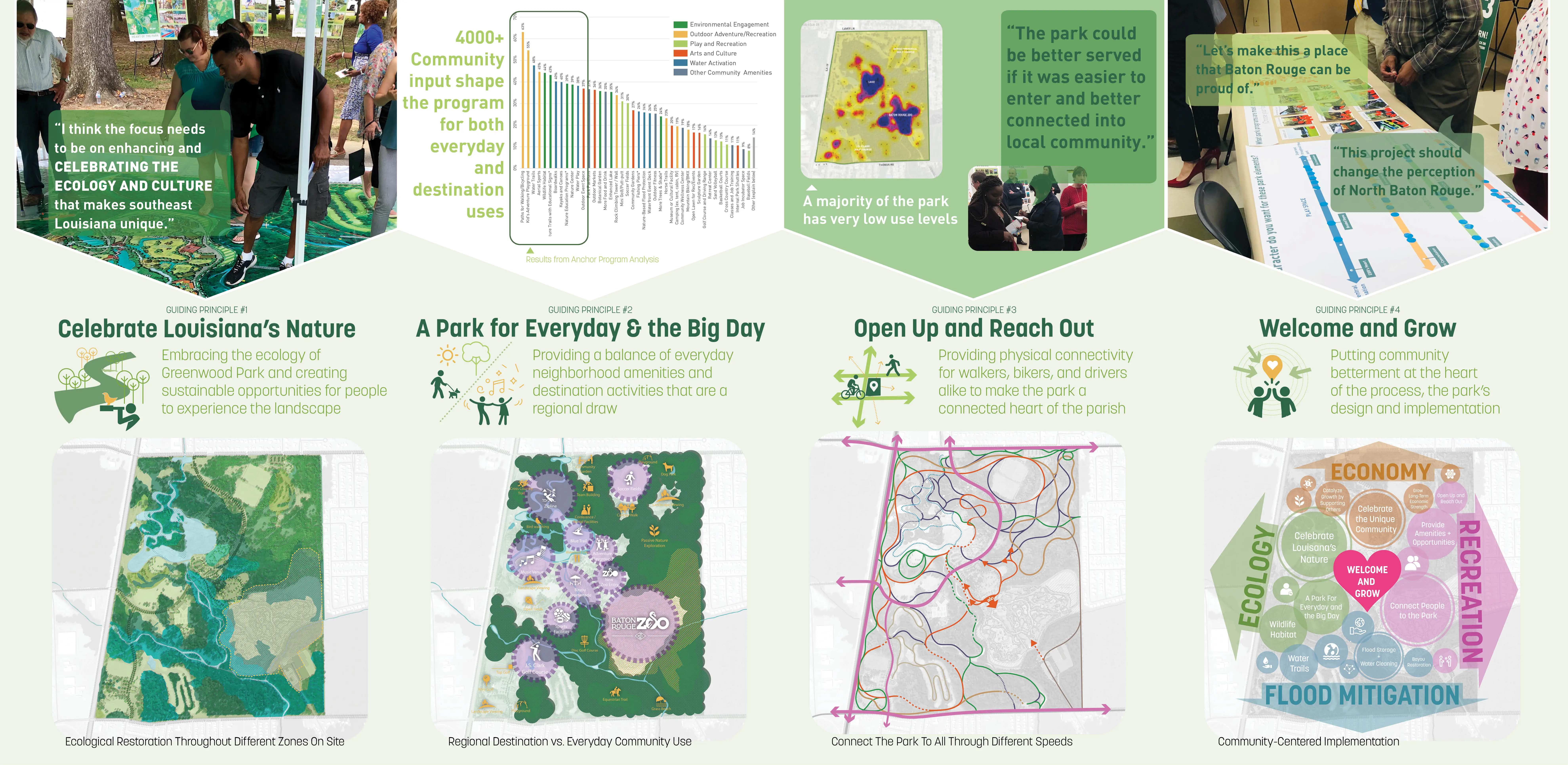East Baton Rouge Parks & Recreation Commission (BREC) had years of turmoil after some called for the Zoo to be relocated south of the parish, an overwhelmingly white area. As BREC entertained the idea, public outcry came from North Baton Rouge (NBR), a predominantly Black community. With support from local and state leadership and BREC we decided to keep the Zoo in NBR’s own Greenwood Park and embark on an ambitious master plan to heal historic patterns of disinvestment. After a year of intense community engagement and design, the front page of the paper quoted one of BREC’s former opponents: “It’s like a dream.” Rooted in Input & Analysis The team employed a methodical approach to build trust, collaborate with community leaders, and gather input from multiple stakeholders. A rigorous analysis of natural systems, economic performance, user patterns, and infrastructural integrity led to 4 guiding principles: Celebrate Louisiana’s Nature, A Park for Everyday & the Big Day, Open Up & Reach Out, and Welcome & Grow. A Constellation of Amenities The plan creates a neighborhood amenity that provides everyday activities for the residents of NBR and the surrounding region. It offers a dynamic set of spaces: an indoor/outdoor sports & recreation center, adventure playground, 6,000-person outdoor event space, woodland retreat & conference center with adventure course, multi-purpose fields, community gardens, cross-country trails and more. A network of trails and nodes nestle into the site support contemplative moments for groups of all sizes. The plan introduces revenuegenerating and free programs that foster a more sustainable and accessible operating model. A key component of the plan is reorienting the front entrance of the Zoo to open into the heart of the park, which reduces impacts on the site ecology and utilizes shared infrastructure. Embedding Resilience The bayous throughout the site were channelized to facilitate flood waters, cutting off natural hydrologic functions and resulting in invasive species. Additionally, a large urban watershed north of the park degraded the site’s water quality and, with virtually no flood-time benefits downstream, came to life in the devastating 2016 1,000-year flood. We used the park as a model for upstream stormwater management. Through a series of new channels that trace the patterns of the original bayous, the plan recharges historic meanders, lengthens the run of the bayou, and creates spillover areas. This reduces downstream flood waters while treating 100% of stormwater through natural processes. The site boasts hundreds of acres of swamp and forest. Over time, they were fragmented and overrun with invasive species. The plan uses natural processes to manage this: natural flooding, prescribed burns, and clump reforestation will restore nearly 150 acres of managed turf grass. The design also restores hilltop meadows formed by the spoils of the new bayou and flood storage work, referencing indigenous mound builders and providing habitat for insects and birds. Community First For the project to confront racism and disinvestment throughout its implementation, it's critical that the record-breaking investment into Greenwood Park has positive impacts for NBR. The plan’s Community Benefits Program defines strategies to mitigate displacement and other effects of green gentrification. At all stages, the project is committed to reconciling historic patterns of disinvestment in the community.