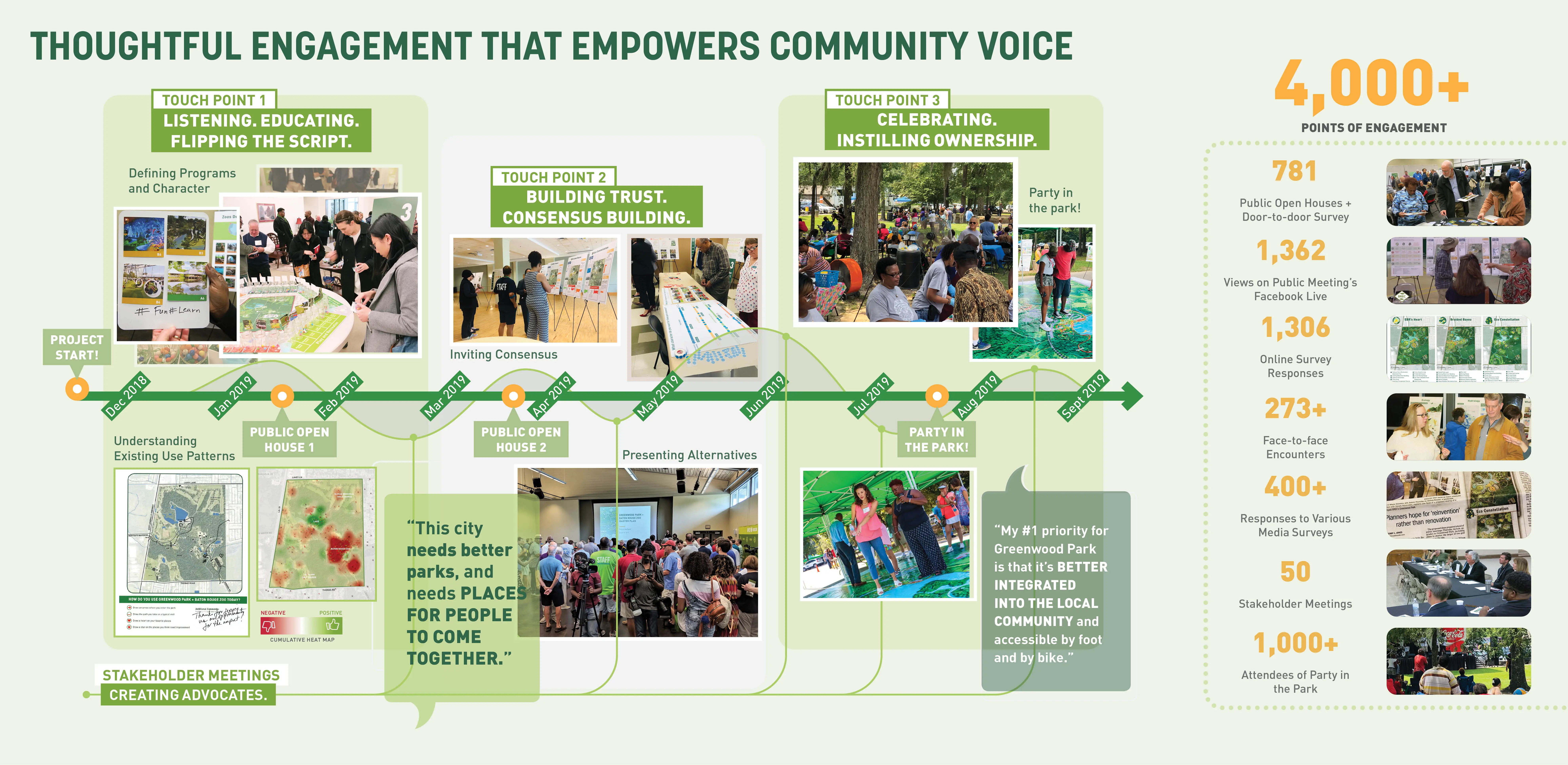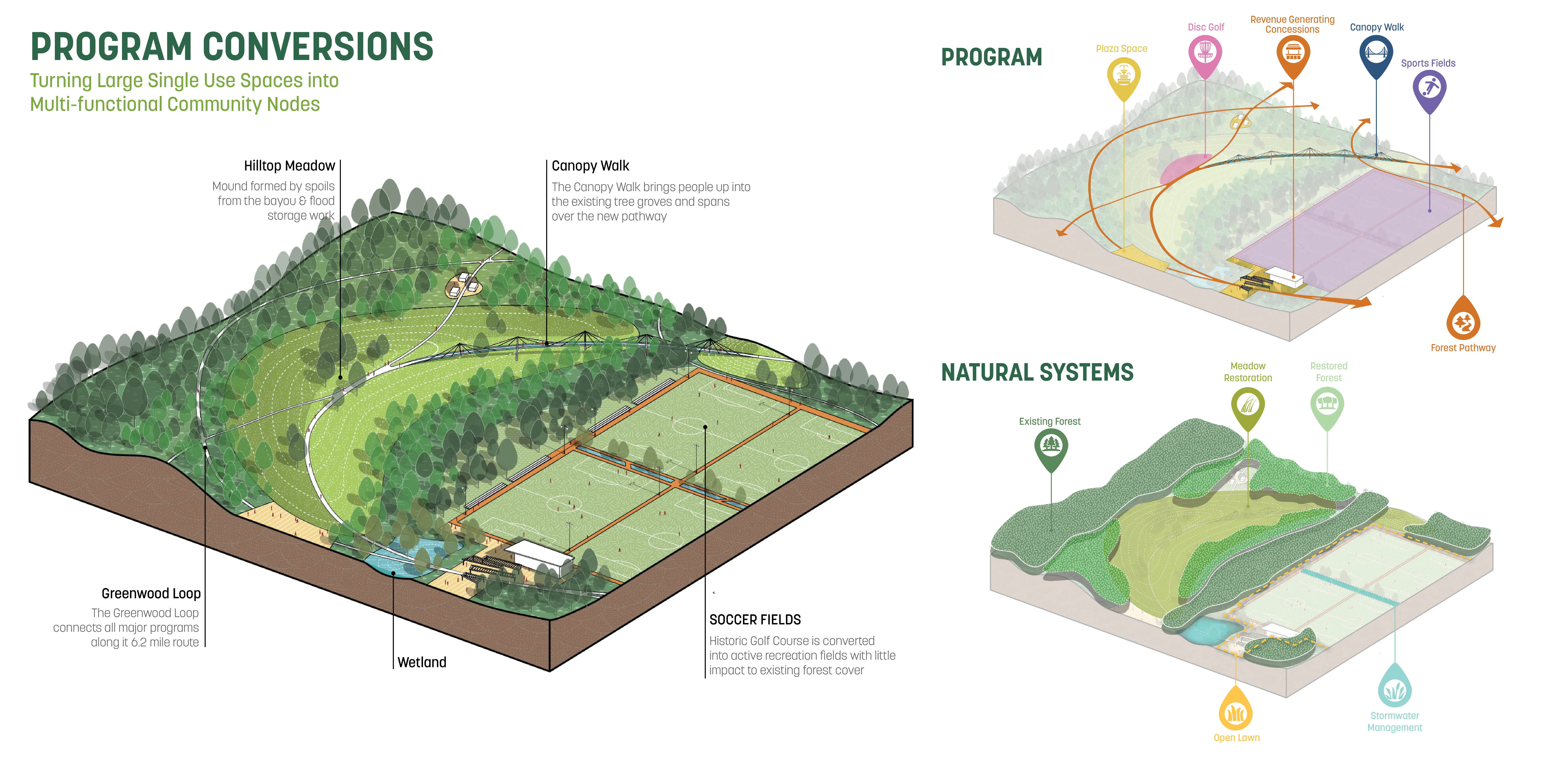 The Master Plan for the 660-acre Greenwood Park lays out a constellation of cultural and recreational programs that connect seamlessly into a network of preserved and restored ecologies. The plan simultaneously provides community value through flood protection, improved air quality, increased habitat, and reduced maintenance demands. The process brought together over 5,000 citizens, the largest outreach in Baton Rouge’s history, to have a conversation about race and disinvestment in this historically underserved low-income neighborhood. Building alignment and trust in a contentious context, the implementation-minded proposal is complemented by a community impact plan that focuses on equitable development to reverse decades of disinvestment.