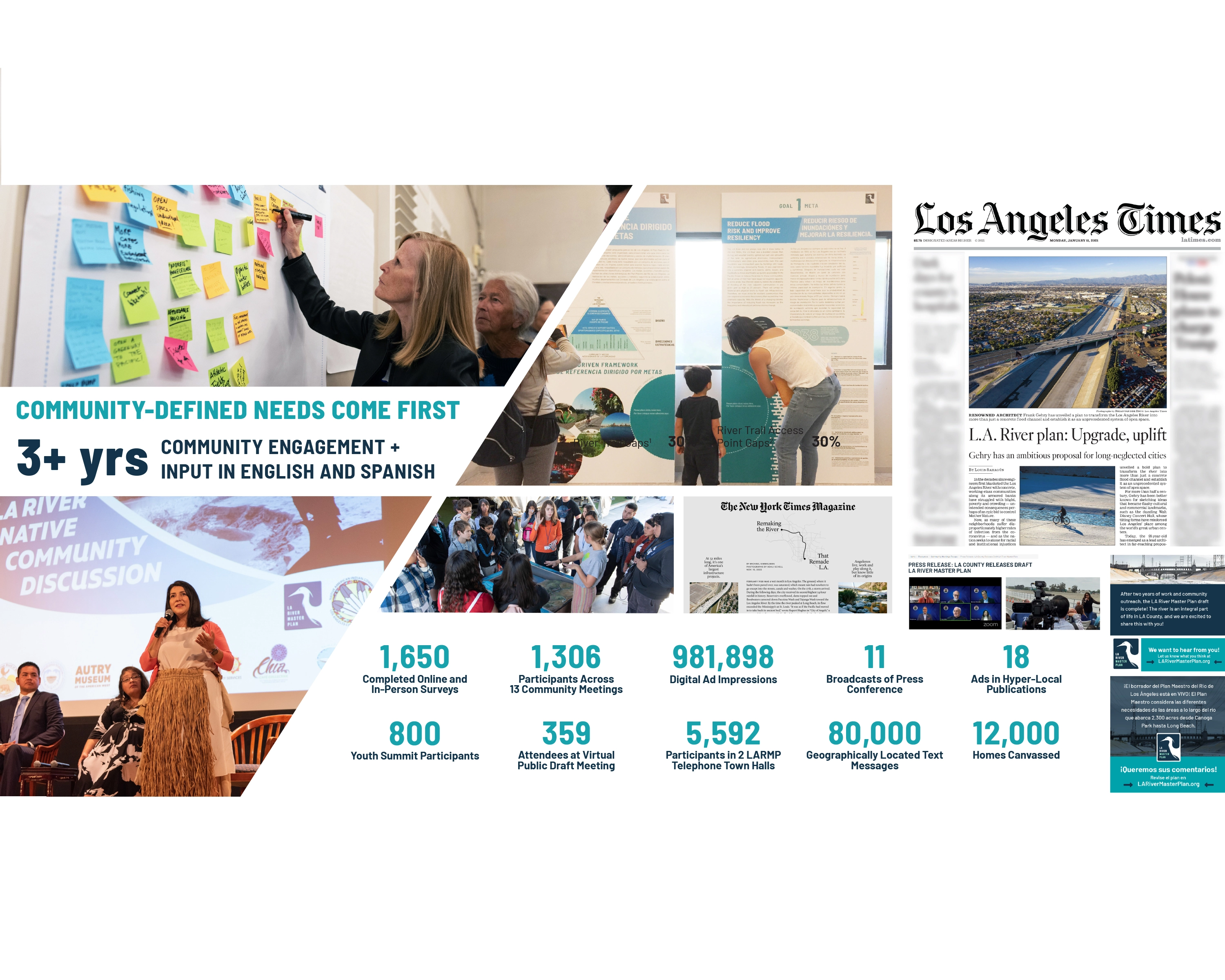 Nearly one million people live within one mile of the LA River. Famous for its concrete-lined channel and maligned as single-purpose infrastructure dividing communities, the river is reimagined in the LA River Master Plan Update as an integral part of daily life that addresses the interconnected needs of people, water, and the environment. Communicating and enacting this shift required innovative, multilingual, multi-generational, and hyper-local outreach to long-overlooked communities along the river.