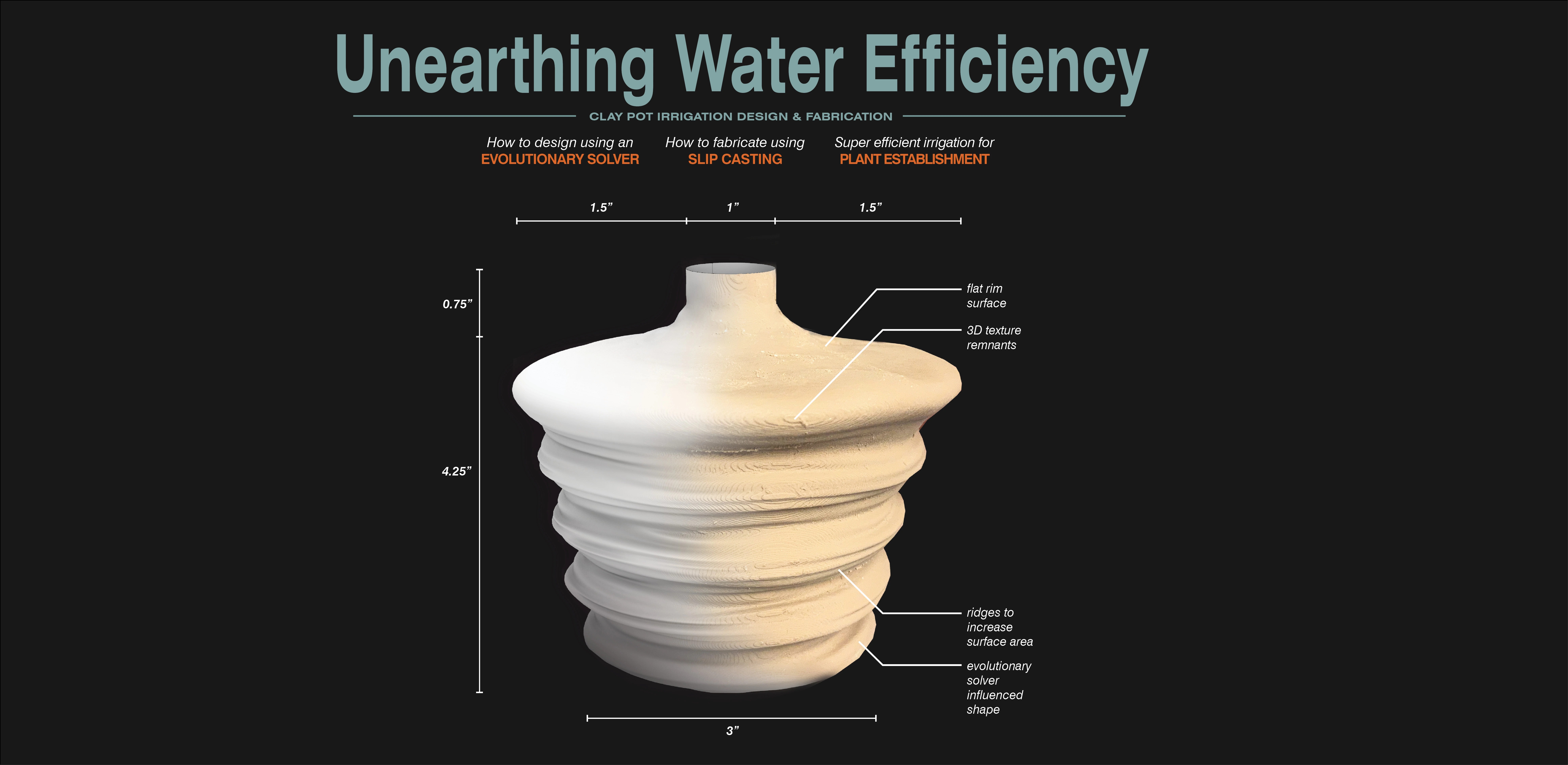 This project explores a vernacular technology in the face of climate change, focusing on the efficiency of buried clay pot irrigation systems. These self-regulating systems reduce water use by 90% and promote plant survival during droughts. Leveraging 3D printing and algorithmic design, this project iteratively designs optimal forms considering water distribution, volume, and structural integrity. Computational modeling incorporates micro-climate variations for dynamic clay pot irrigation lay