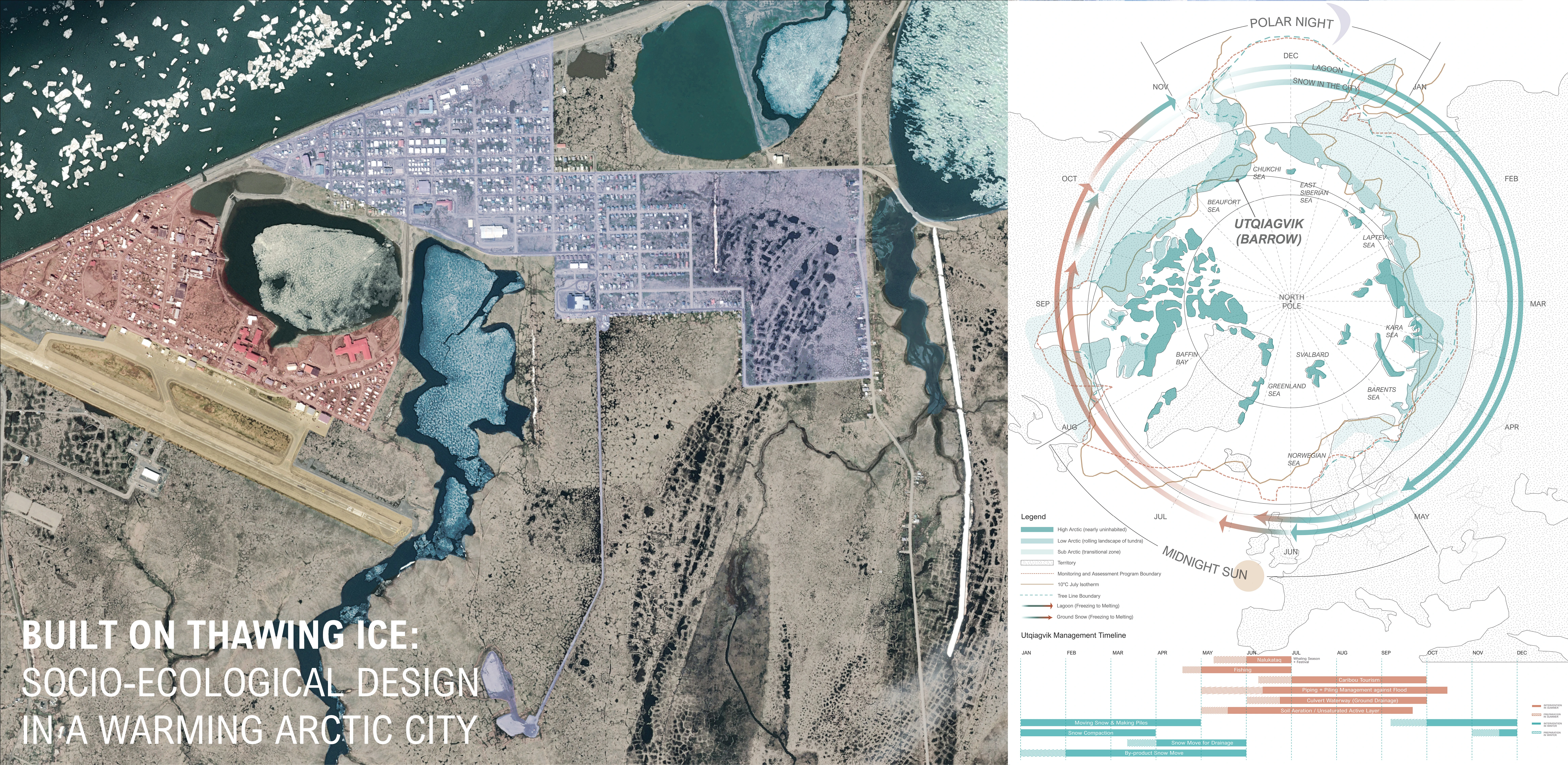 The Arctic is warming four times faster than the rest of the world. Utqiagvik, AK is increasingly affected by thawing ice-rich permafrost that destabilizes the environment, infrastructure, and cultural practices. This project highlights the critical role of water—snow, ice, and meltwater—in shaping public space, maintenance, and the future development in Utqiagvik. Born from community engagement, data analysis, and field work, two-site specific designs propose maintenance strategies and ecolo