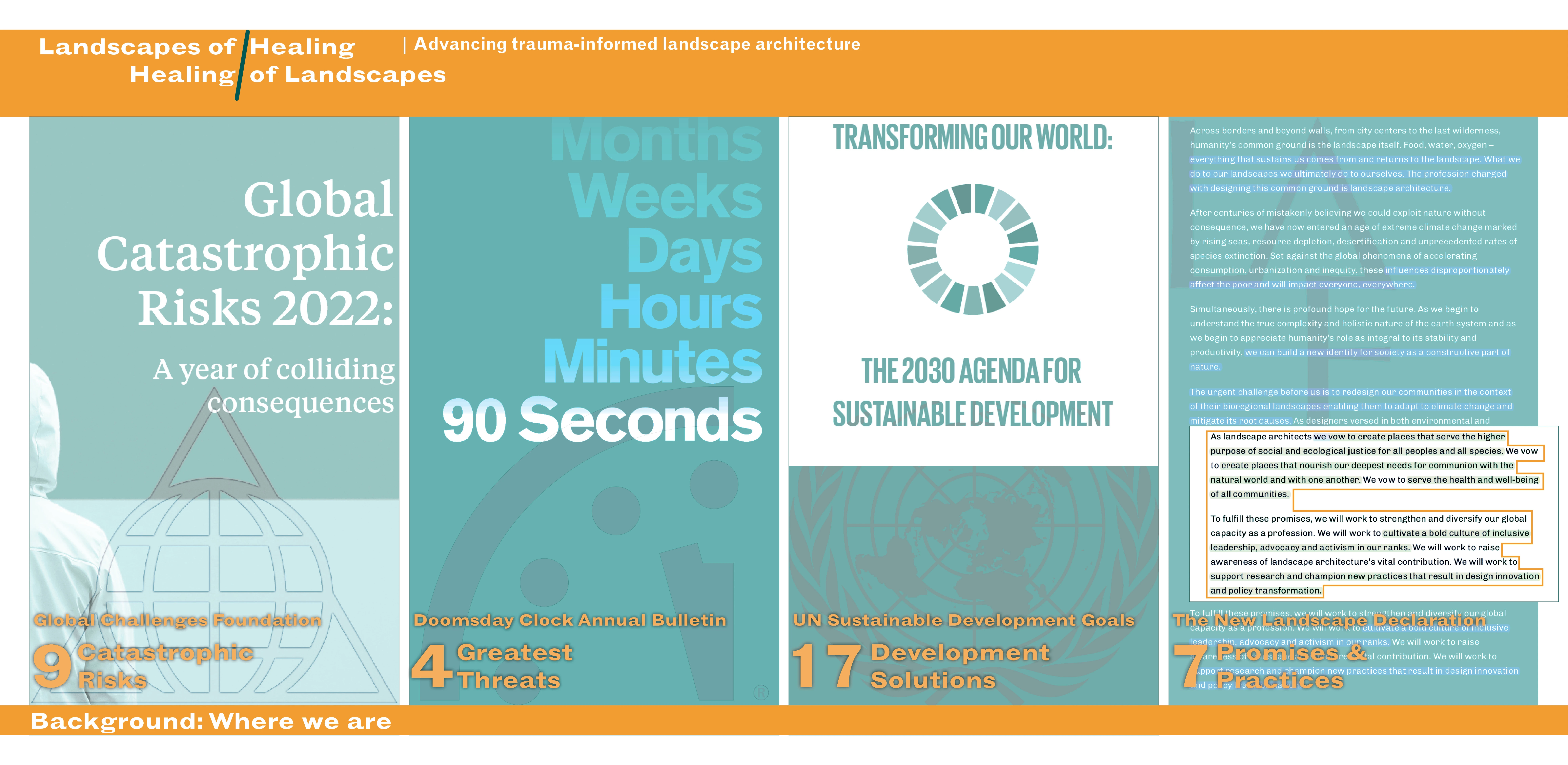 Communities are challenged with climate change, habitat loss, and social conflicts resulting in trauma experienced by individuals and held in the land. Traumatizing land use causes physical, ecological, or contextual damage to landscapes. Sites cannot be healed without understanding and rectifying the trauma imposed on the land. This research explores the site elements that are essential to understanding landscape trauma. It also examines how a revelatory site inventory can produce trauma-inf