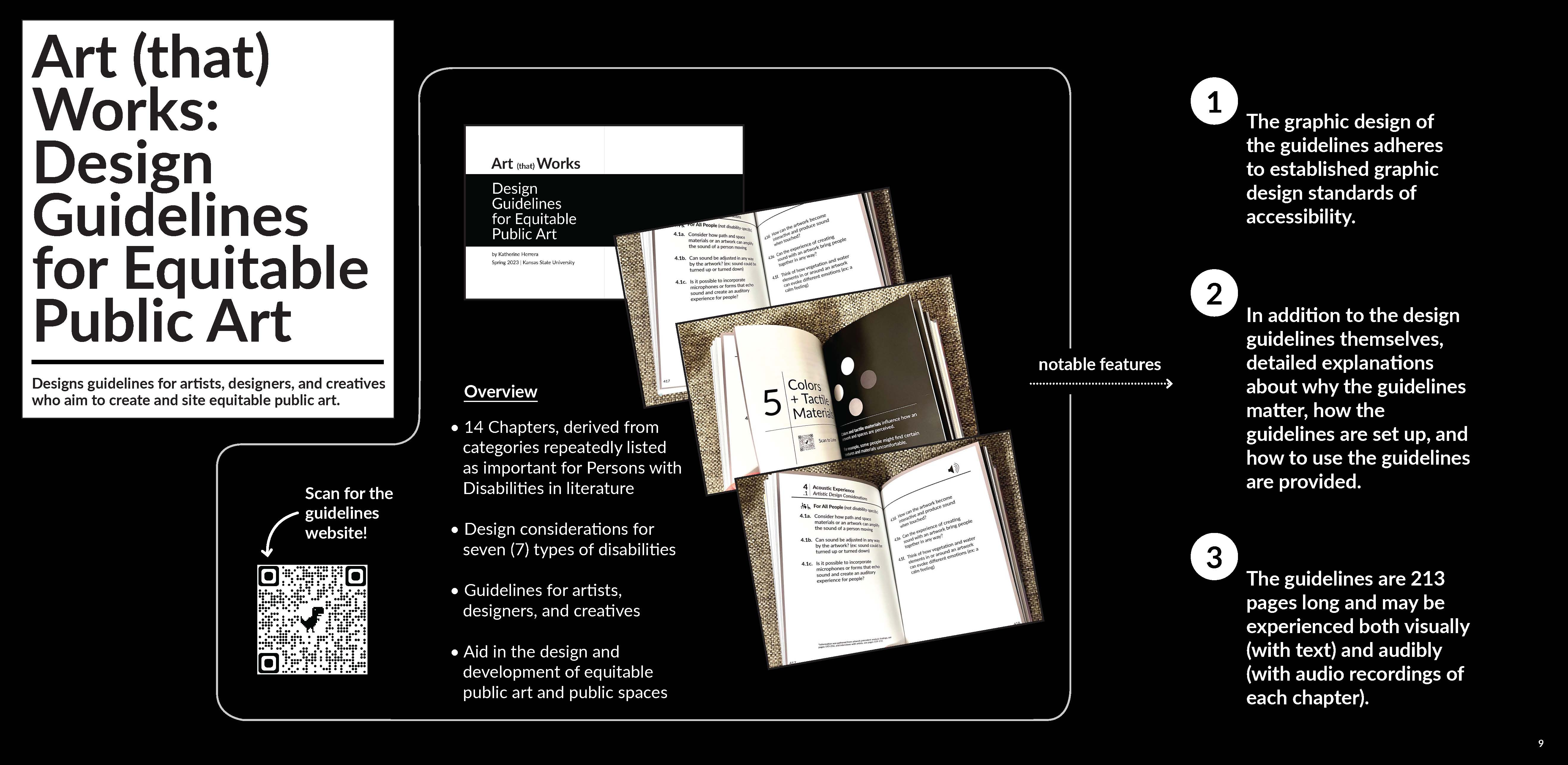 Combining my interests in public art, social justice, and landscape architecture, Art (that) Works: Design Guidelines for Equitable Public Art is a one-of-a-kind, comprehensive guide for artists, designers, and creatives who aim to create and site equitable public art in public space. The guidelines are 213 pages of design considerations, informed by original research, including global interviews with artists and site designers, precedent analyses of interviewees' work, and a literature revie