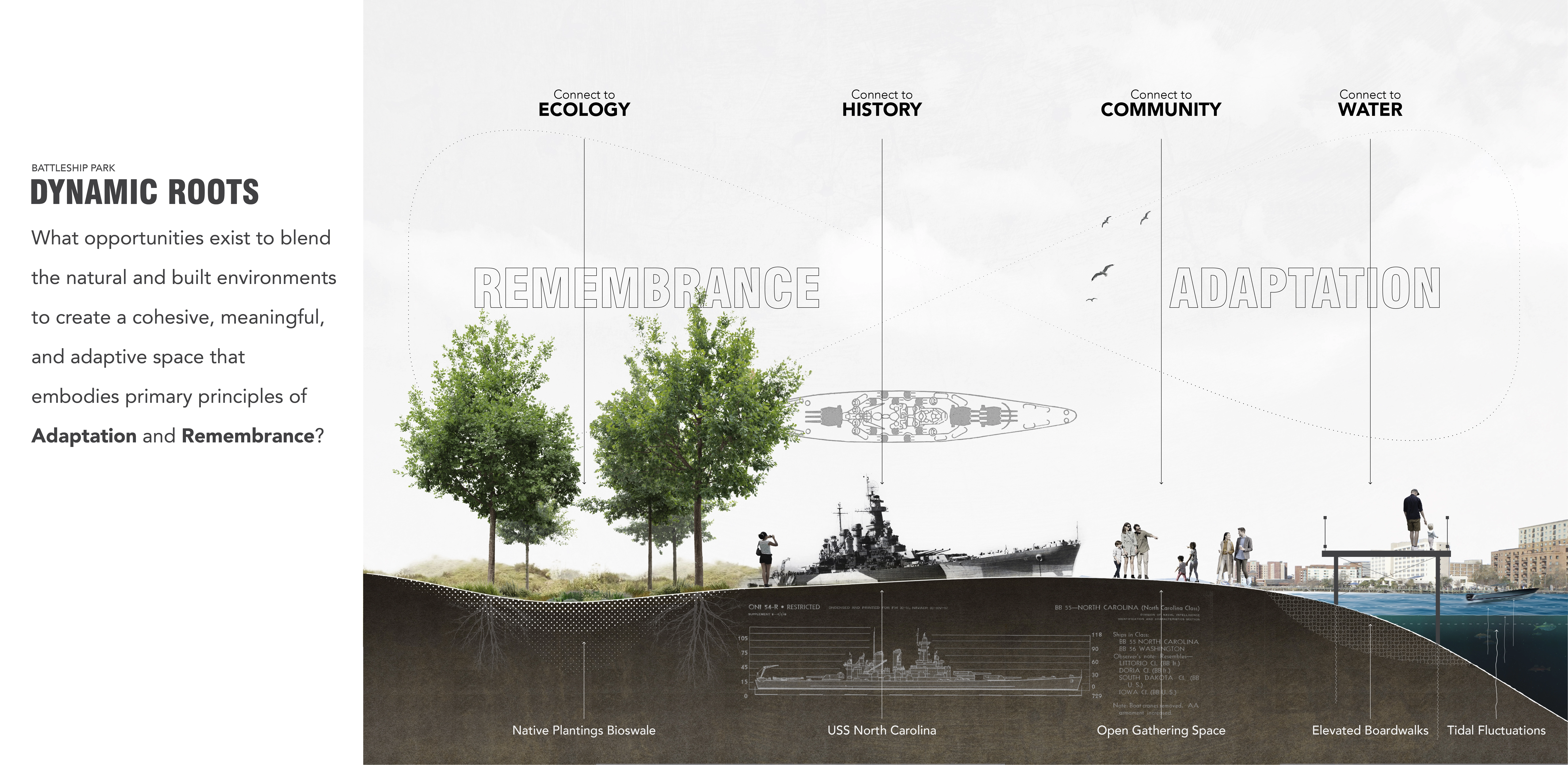 Dynamic Roots reimagines Wilmington's Battleship Park, merging innovative design, collaborative work, and a deep reverence for the site's historical and ecological context. Crafted by a trio of diverse design students, the project skillfully integrates various disciplines. Working with park staff and design professionals, the design simultaneously honors the park's heritage and addresses climate change. Dynamic Roots enhances the public space, offering a sustainable, accessible environment th