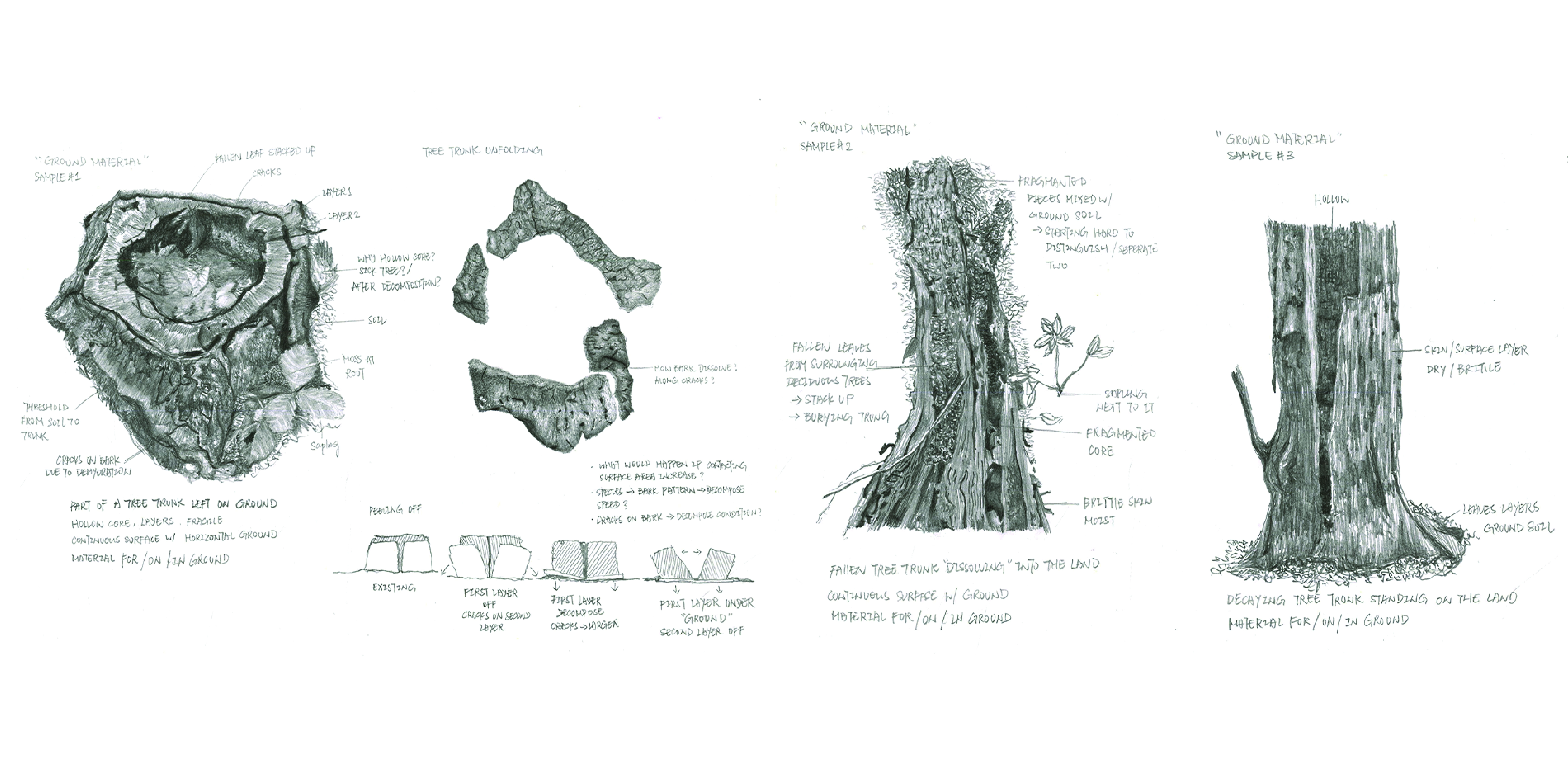 Experienced the opposite settings of fallen trees in Hong Kong (urban city) and deadwood on Observatory Hill (forest) in Charlottesville, acknowledging the misconception of deadwood being perceived as destructive, the project aims to redefine decomposition as a joyful process and refine the general impression people have to deadwood. People are invited to witness the death of trees, to see, to touch, and to engage with this slow, quiet, yet elegant process. The design manipulates landfor