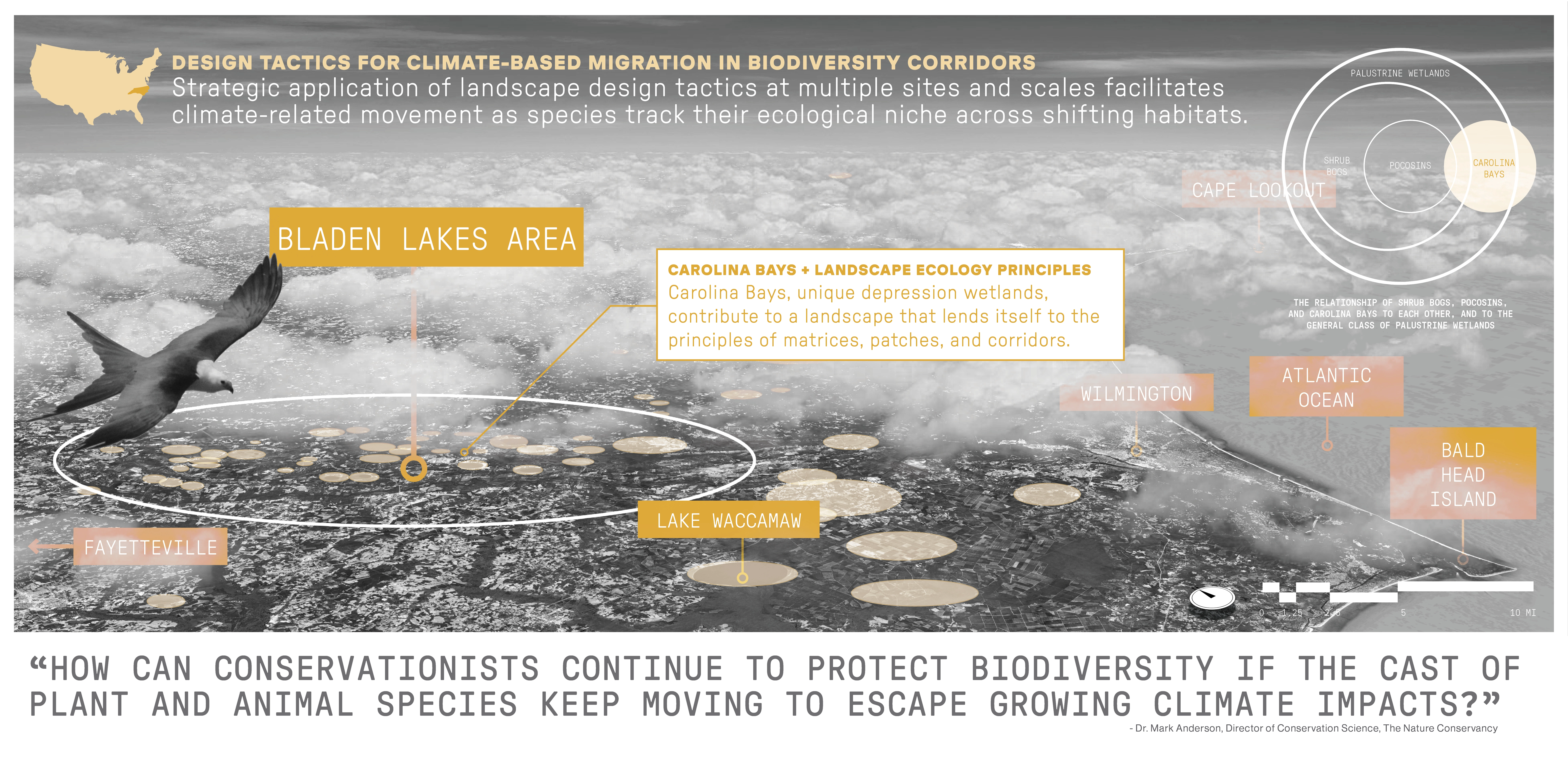 This project addresses biodiversity conservation through corridor design, exploring how the strategic application of design tactics at multiple sites and scales can facilitate climate-related movement as species track their ecological niche. The Nature Conservancy has identified “resilient and connected landscapes” across the US. These priority areas for conservation are linkages that could sustain the diversity of a region under a dynamically changing climate. This project examines the large