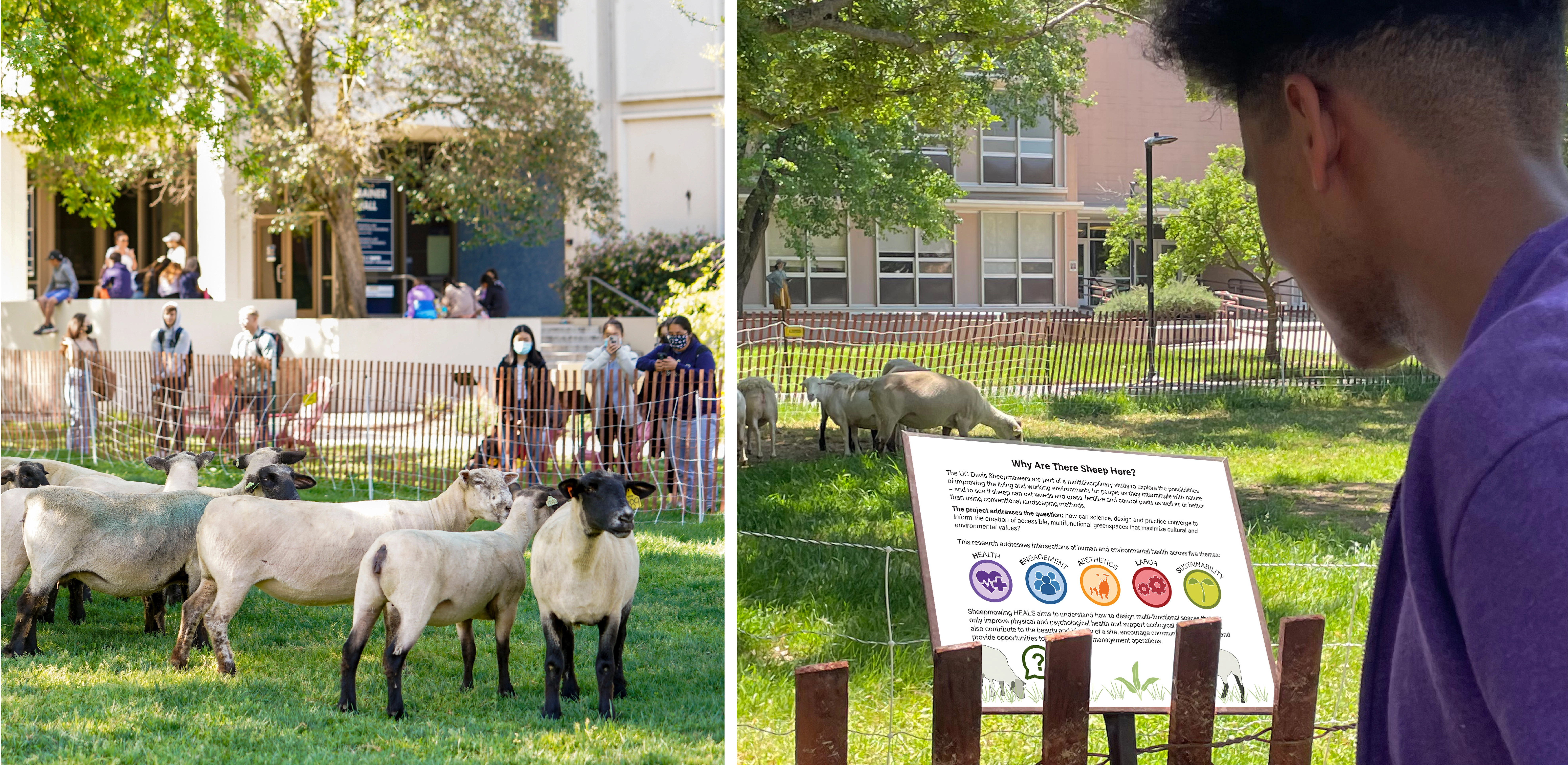 The Sheepmowers Project is a fun and engaging collaboration that brings sheep to the UC Davis campus to replace lawnmowers. The grazing sheep are the focus of community engagement and wellness activities, shepherded by students while trimming and fertilizing campus lawns. The collaborative group includes faculty, staff, students and the broader Davis/Sacramento community, and aims to be a model for other locations and organizations. Using sheep instead of lawnmowers reduces carbon e
