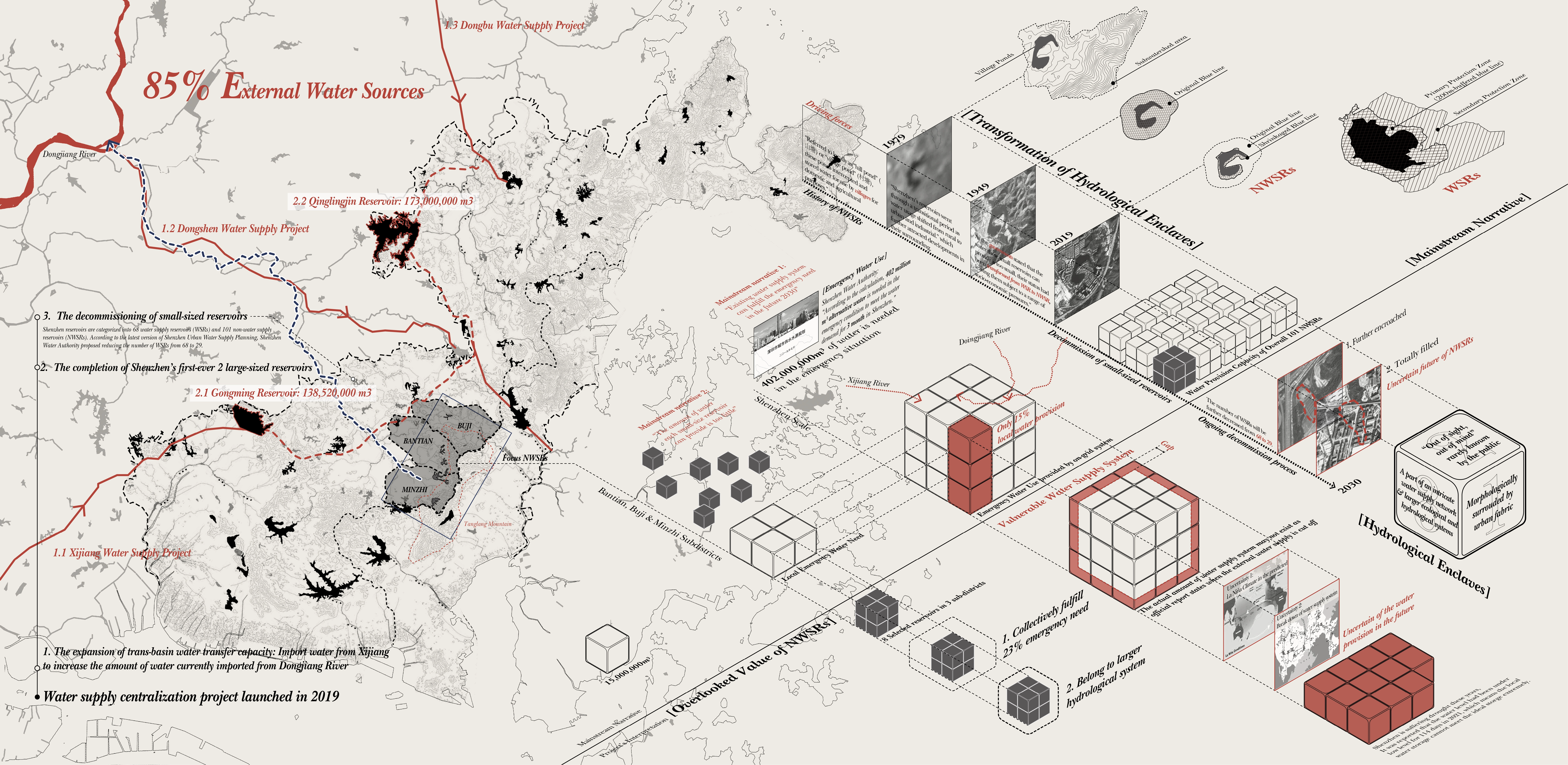 Decommissioning process of small-sized reservoirs in Shenzhen makes these reservoirs highly vulnerable to urban encroachment, leaving a series of ecological and socio-economic issues. “Hydrological Enclaves”is used to highlight three interconnected realities of these reservoirs while also shed light on potential space of intervention. Focusing on a chain of small reservoirs, firstly, this project aims to adapt these soon-to-be decommissioned small-sized reservoirs into dec