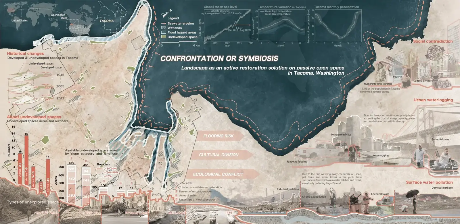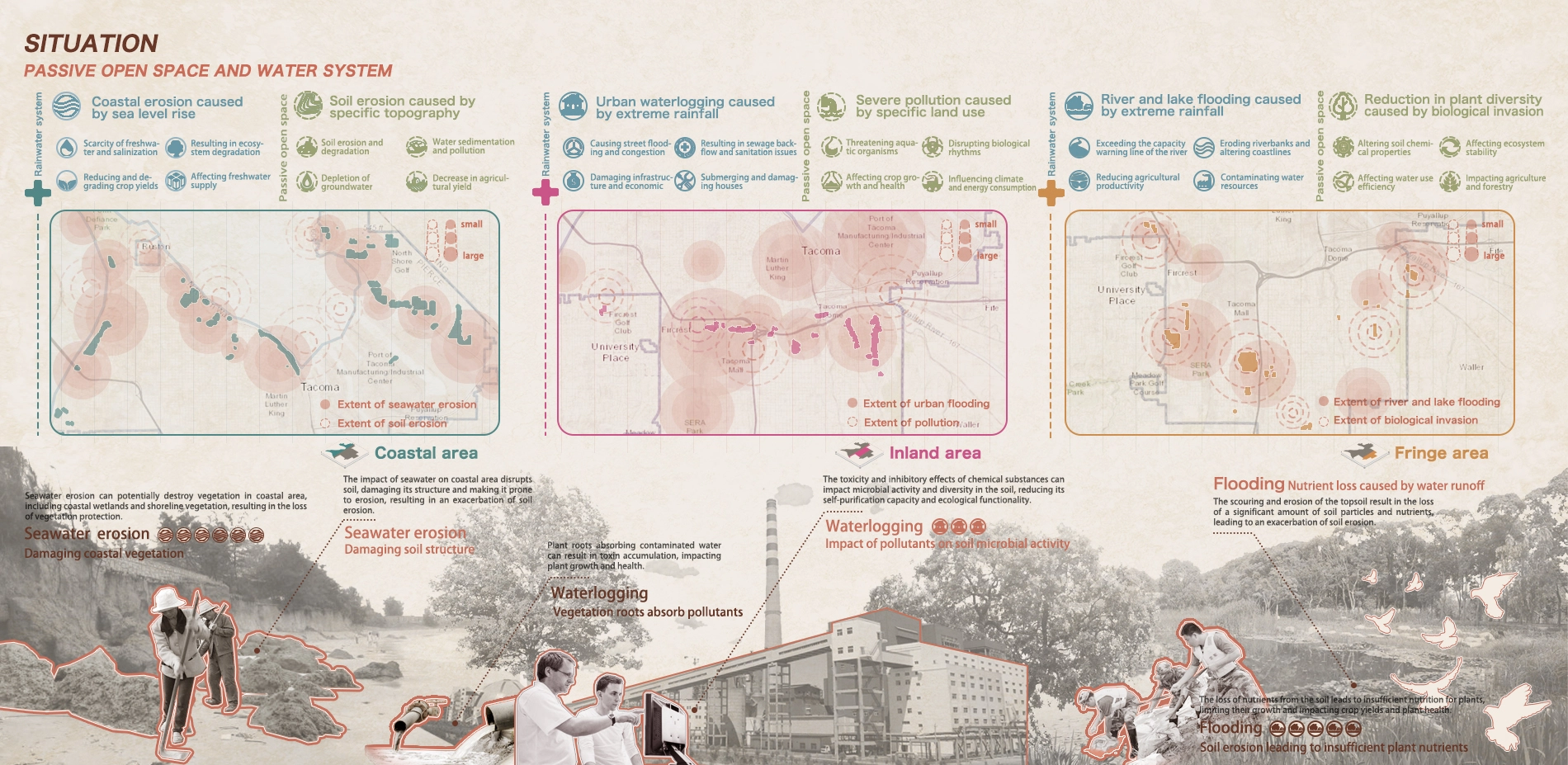 Tacoma has a direct confrontation in flooding risk, cultural division and ecological conflict. Passive open space with rich vegetation coverage offers a sustainable solution to deal with the contradiction. However, 47% of the space acreage is considered a steep slope and another critical factor is invasive plants. With the purpose of mitigating soil erosion caused by coastal seawater erosion, alleviating pollution by waterlogging in inland area, and addressing ecological degradation resulting from intensified river and lake flooding in fringe area, we promote an active restoration of it through the establishment of a symbiosis system. It'll facilitate the self-circulation of water system and impact diverse habitat self-recovery in Tacoma.