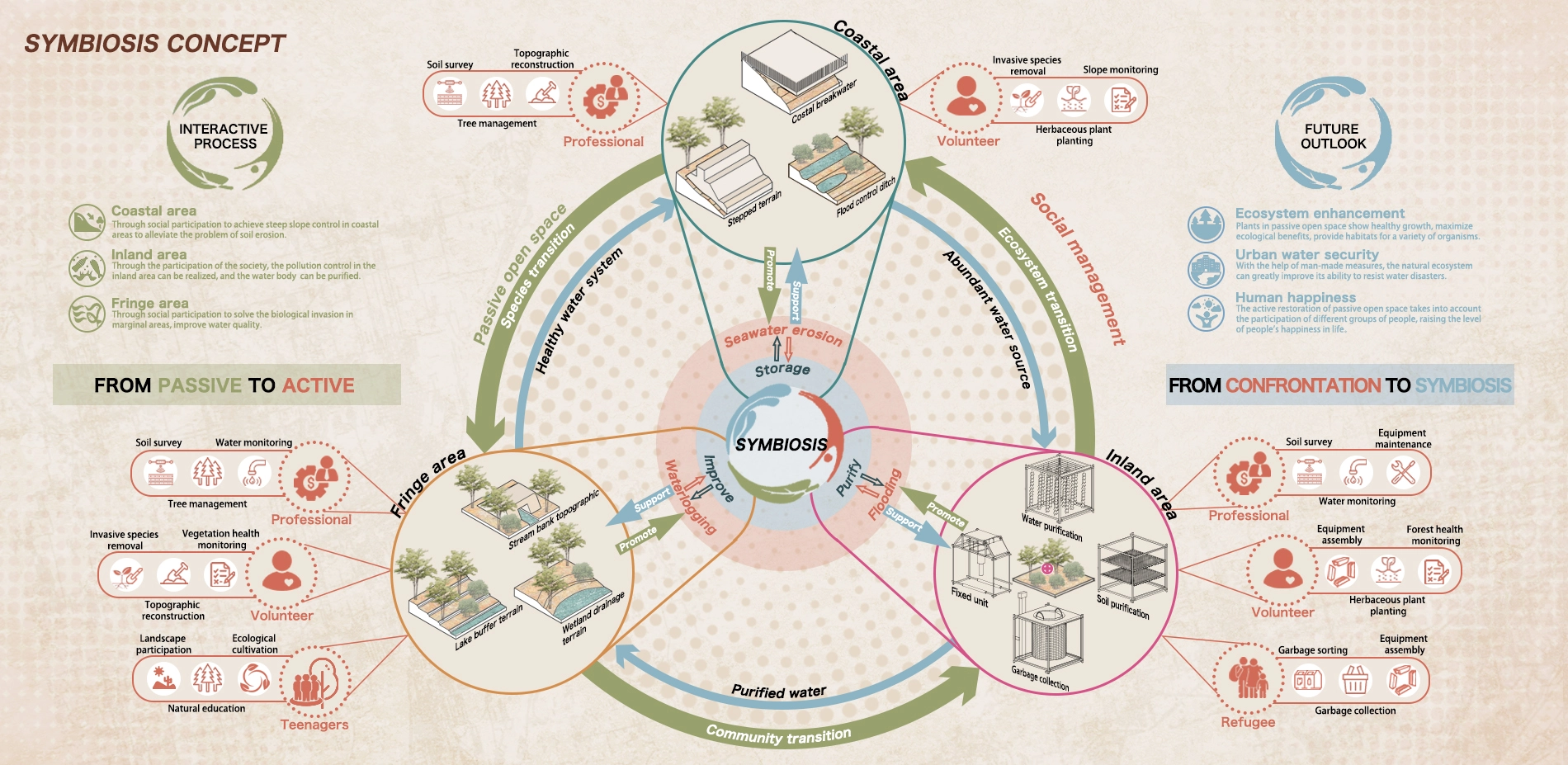 This project conducts a comprehensive study of the passive open space, surface water and human activity in the Coastal area, Inland area and Fringe area, dis-establish the confrontational and to re-establish a symbiosis system in them.