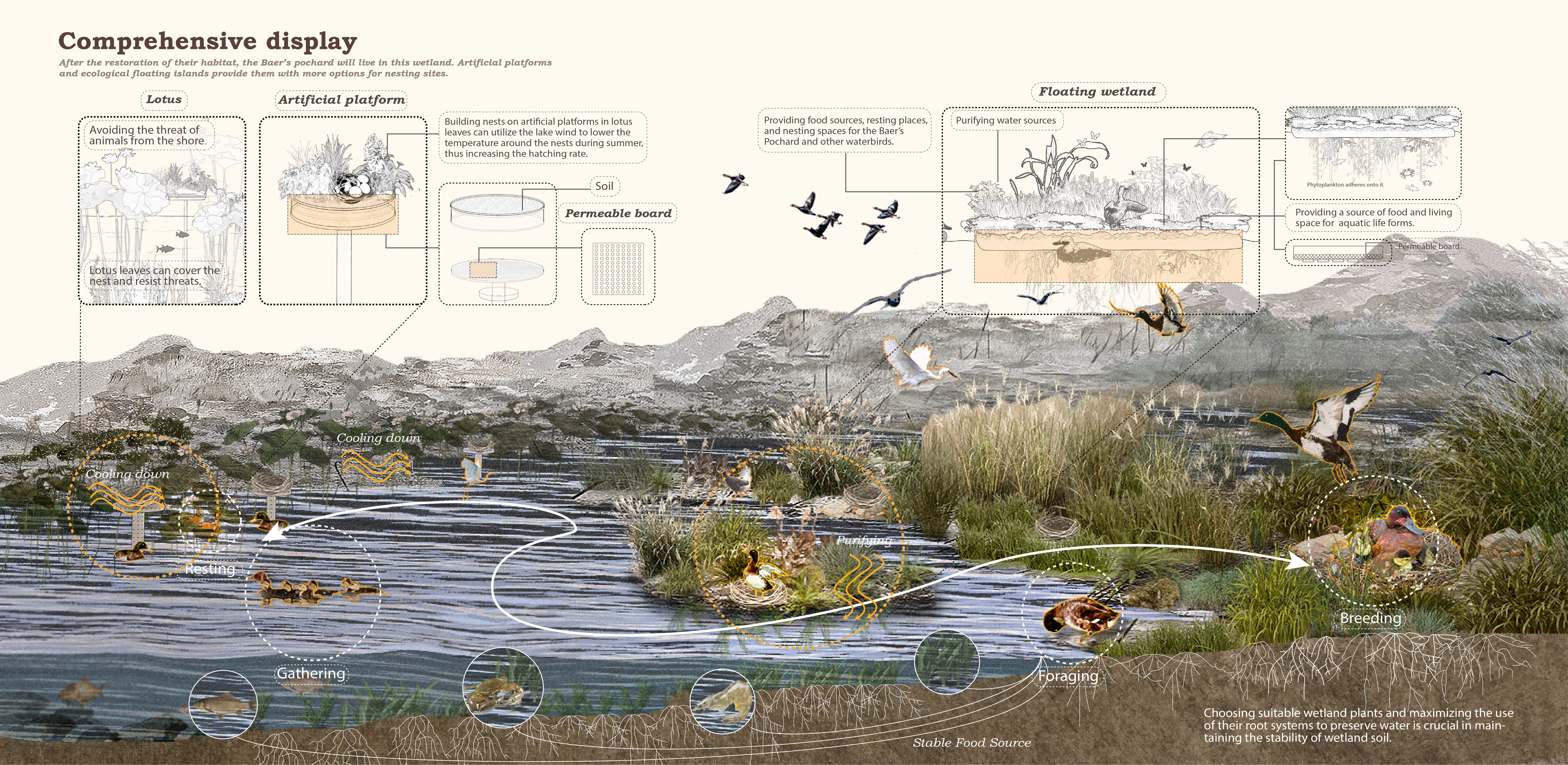 1. Ecological strategy: Based on Baer's pochard's habits, we design four ecological models: shallow beach lotus pond, pond and open water area. We restore, transform and add wetlands on site and create artificial platforms for nesting.