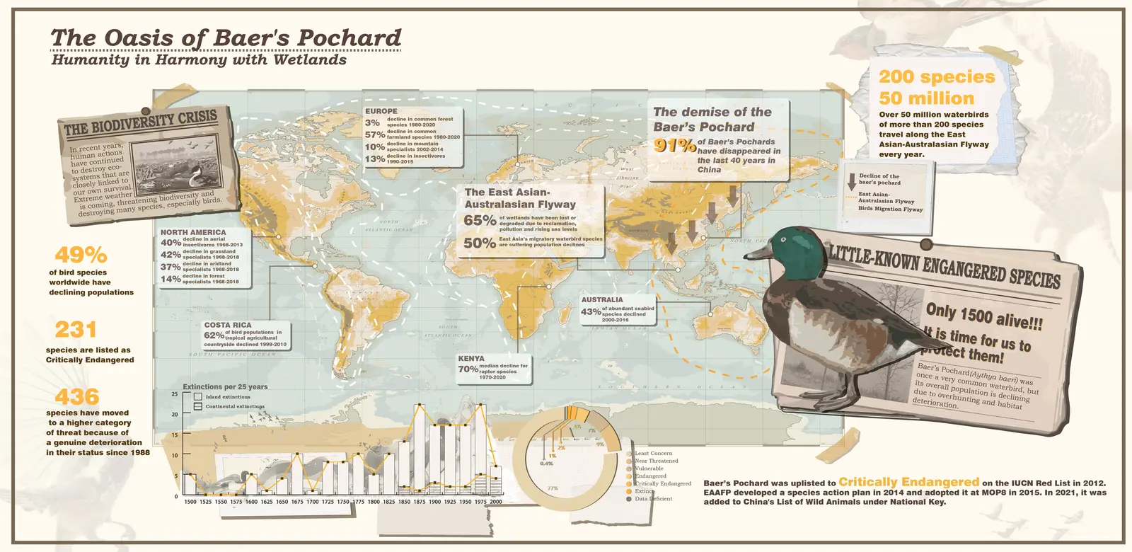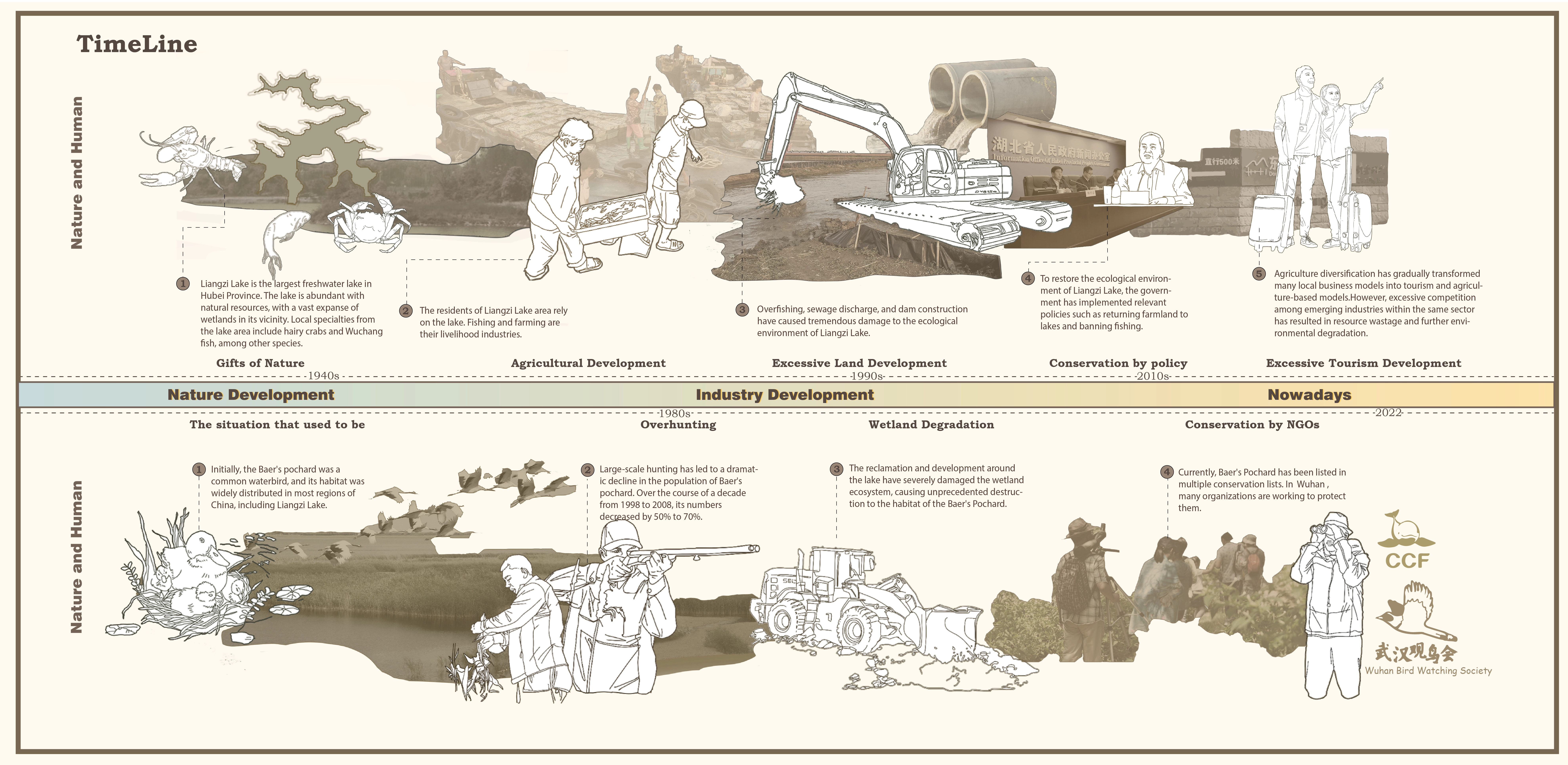 Birds are the most severely affected population in the biodiversity crisis and they are closely related to humans. The main source of the bird crisis is the various environmental destruction caused by human irrational development. Living in Wuhan, which has rich wetland resources but has always faced urban development and ecological conflicts, we hope to find a balance between industry and ecology from the perspective of birds here. While avoiding the homogenization of urban form, we will shape an ecological image with historical heritage by exploring local ecological features to promote sustainable development of society, economy and ecology. The focal species method is the most commonly used research method for protecting birds today, and this project also relies on it to choose the protagonist, the little-known but endangered Baer’s Pochard. Due to wetland degradation and large-scale hunting, Baer’s Pochard has declined sharply in number over the past forty years. Today, there are only about 1,500 left in the world. China, as its main distribution area, must take action to protect it urgently. The project is located in Liangzi Lake Puyanghai Provincial Wetland Park in Wuhan. As the southernmost breeding ground for Baer’s Pochard in the world, Wuhan is also known as China’s wetland city and has long faced problems between urban industrial development and ecological wetland protection. Liangzi Lake is the area where Baer’s Pochard is most frequently observed in Wuhan city. As a traditional agricultural area locally, the contradiction between agriculture and ecology is more prominent. After multiple inspections, we believe that this park with typical local contradictions and undergoing wetland degradation is suitable as our foothold for completion.