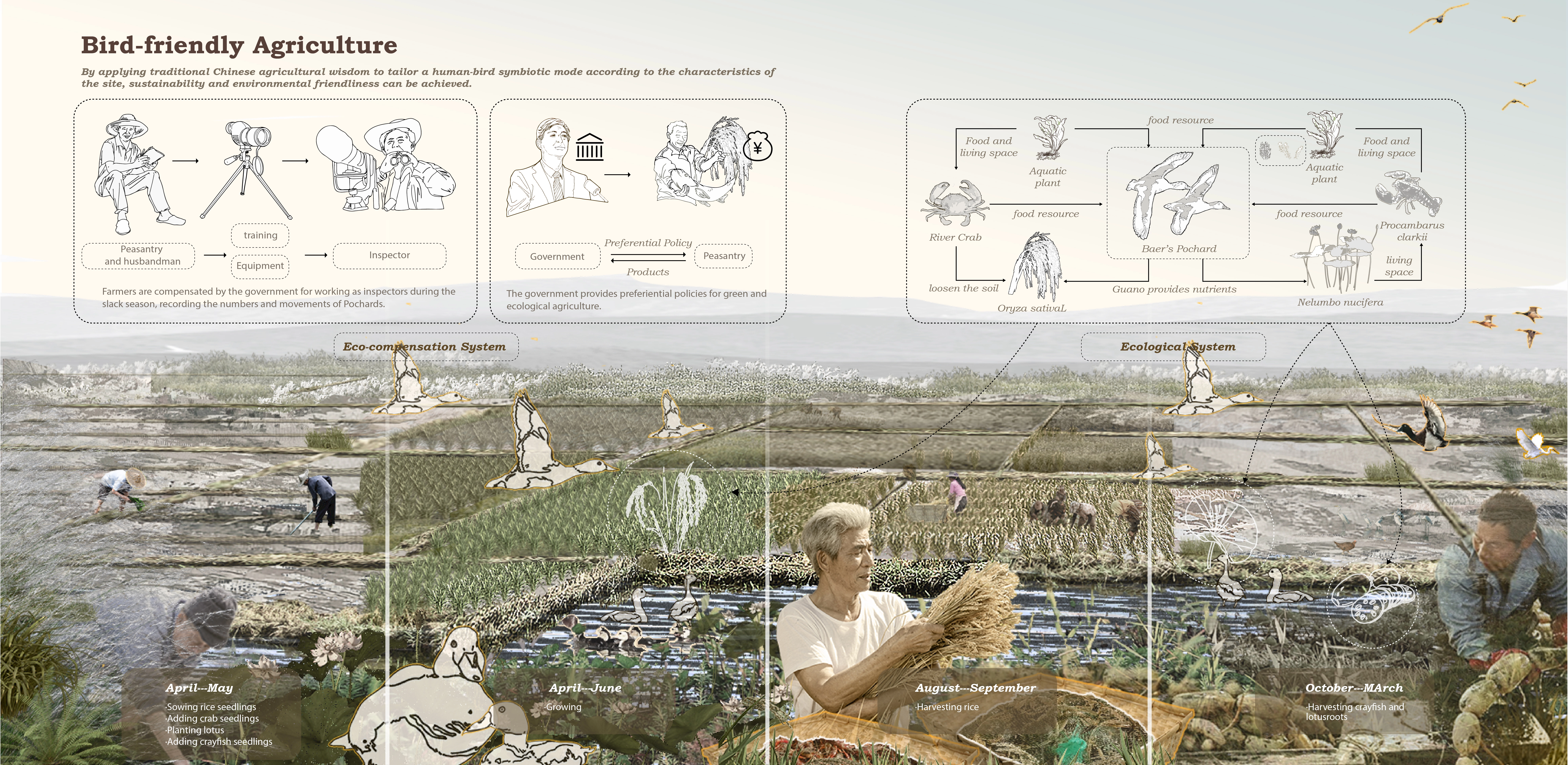 Human activities pose a tremendous threat to the planet's biodiversity. It is crucial to explore how to balance ecology and industry.This project focuses on the critically endangered species of Baer's pochard. We have chosen a typical wetland park in Wuhan, the southernmost breeding ground of the species, situated in an area where traditional agriculture conflicts with nature conservation. We propose a comprehensive strategy to address the needs of various stakeholders, including how to conserve the Baer's pochard and increase its population while utilizing traditional Chinese farming wisdom to maximize economic benefits for local residents and achieve sustainable development. The strategy also involves redesigning the wetland park.