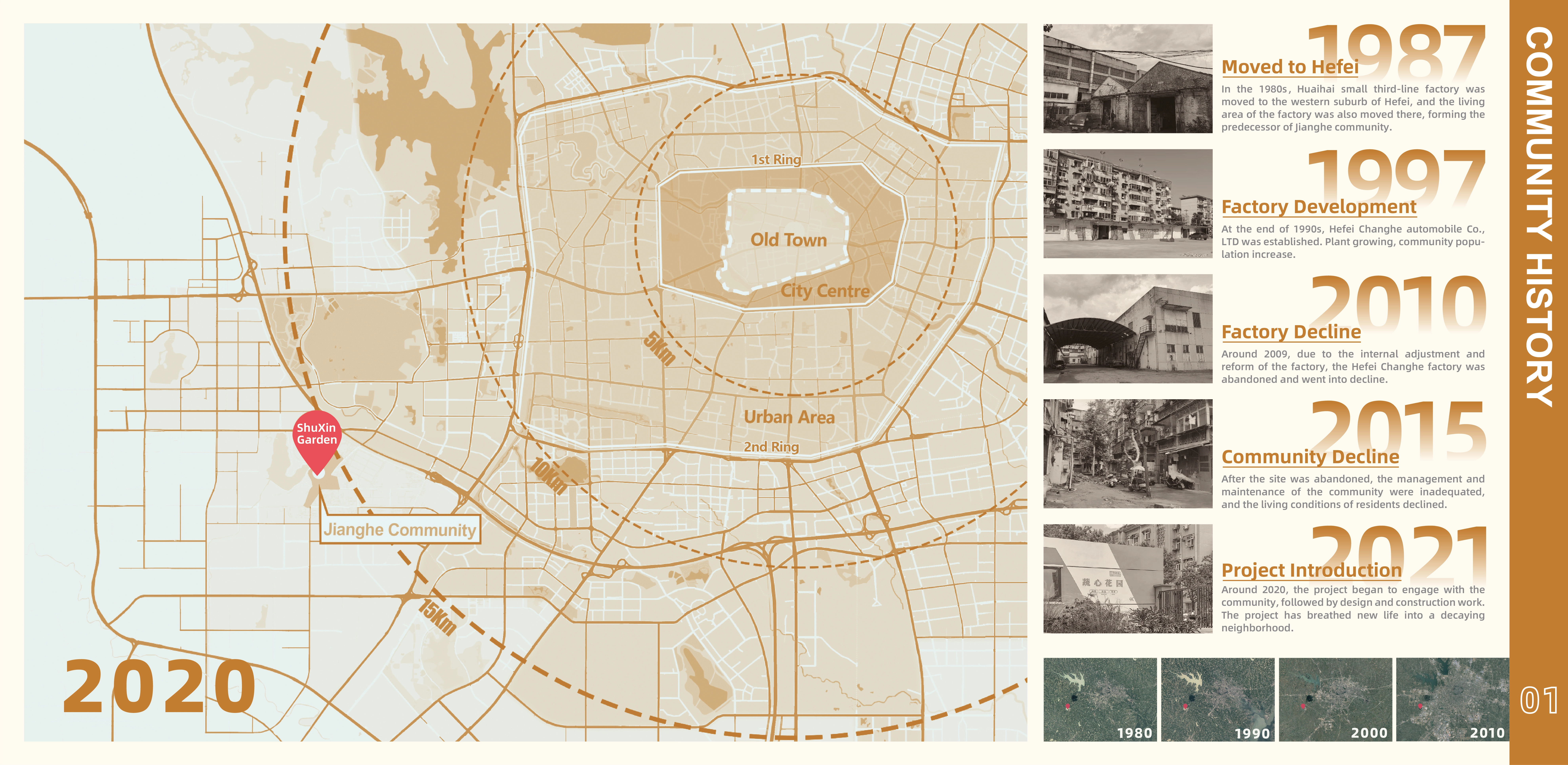 In China, industrial reconstructuring has led to the prevailing decline of communities surrounding industrial areas. A series of problems including poor environment, insufficient public areas, lack of green space, indifferent neighborhood relationships, and weak community services have become more and more prominent. This community garden, site is located in the Jianghe Community on the outskirts of Hefei city, covering an area of 4.75 square kilometers. This area used to be the center of local manufacturing enterprises who enjoyed a long period of economic prosperity. Along with the decline of those enterprises, factory buildings have been used for other purposes and the green infrastructure in the community remained scarce.