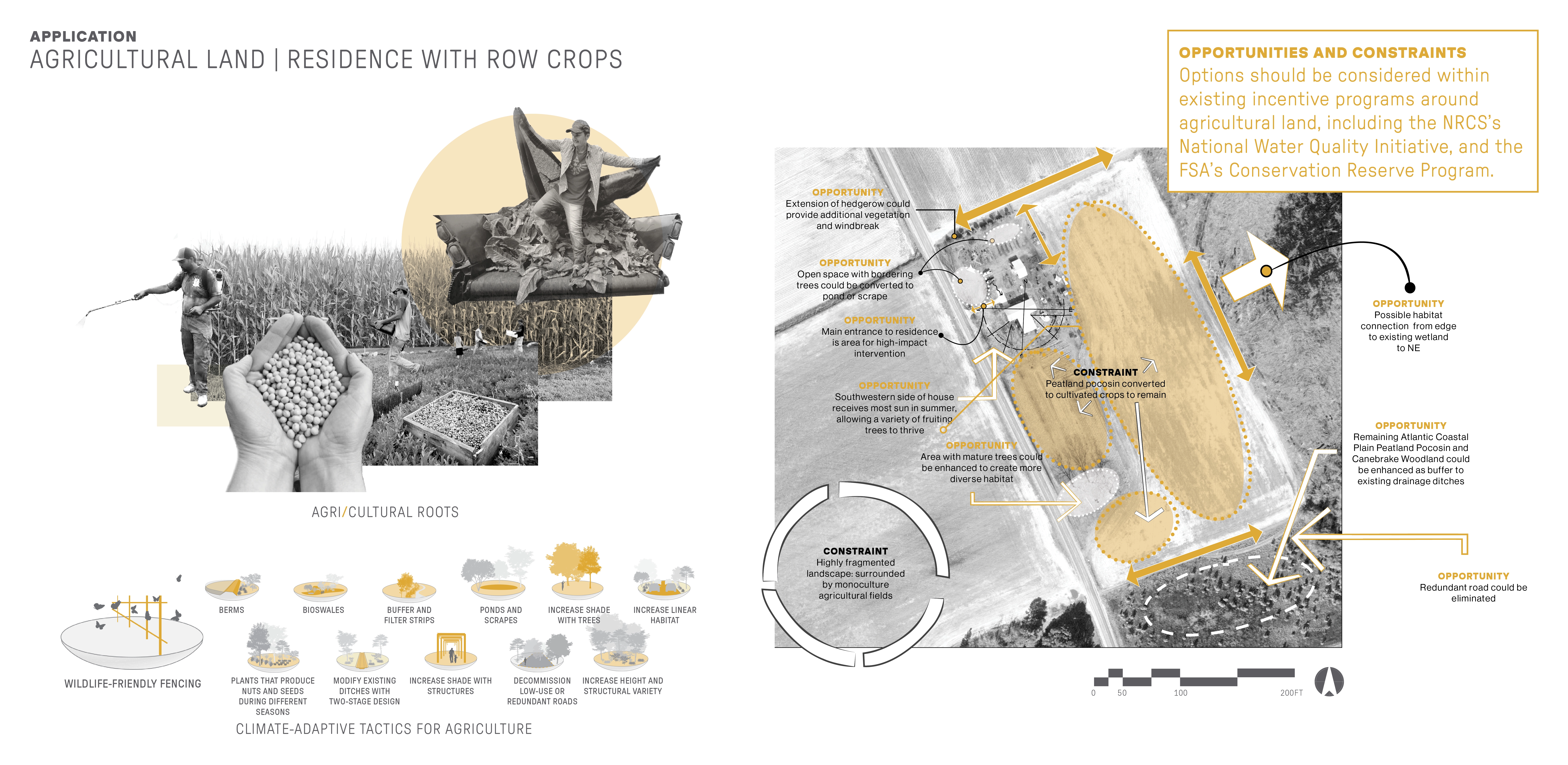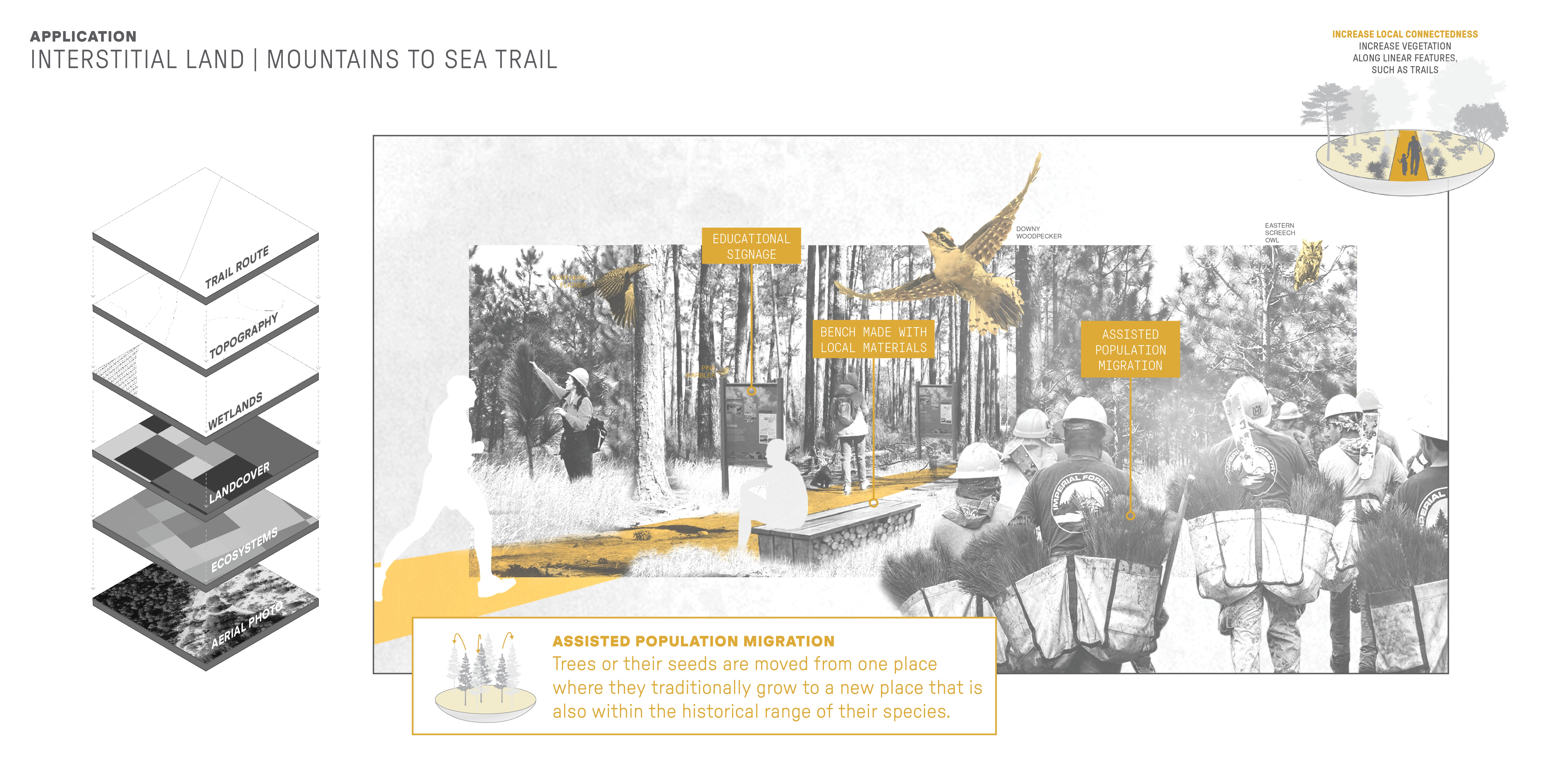 Contextually Sensitive Tactics for Climate Adaptation Projections indicate that the future in this area is hotter and wetter, with more invasives, pests, and wildfires. Research and analysis identified climate-adaptive tactics that fit into two overarching concepts: protecting a large number and variety of species and protecting the ability for species to move and migrate. Strategies that support these concepts are increasing landscape diversity, increasing local connectedness, and decreasing anthropogenic resistance. Forty-five resulting tactics were organized by 12 approaches. These tactics were applied to a range of sites representing five critical land types within the Bladen Lakes area: managed, agricultural, developed, and interstitial land, and priority connection parcels. Site-specific examples illustrate how in-situ design tactics can honor place and program while promoting climate adaptation that combats biodiversity loss.