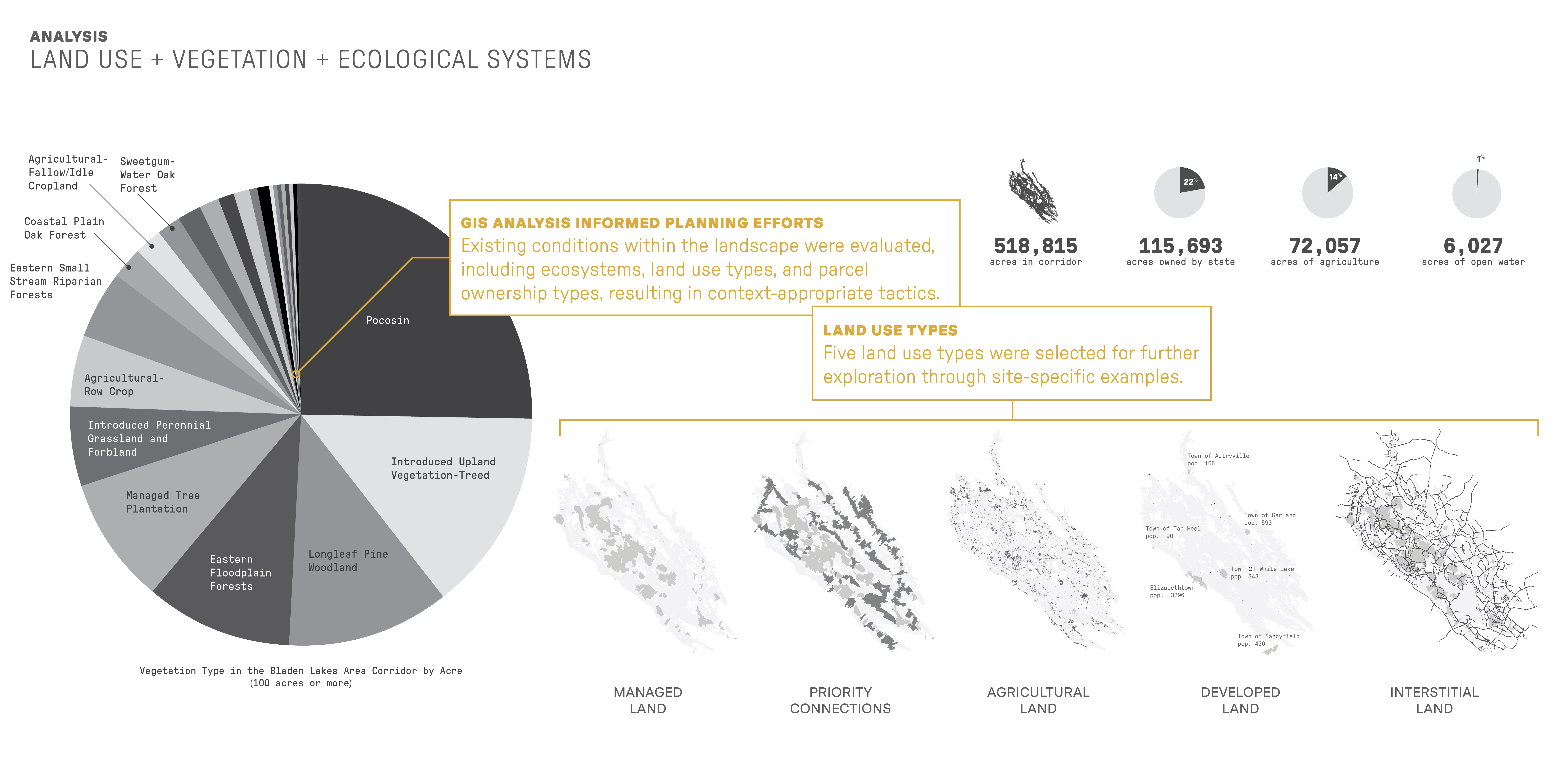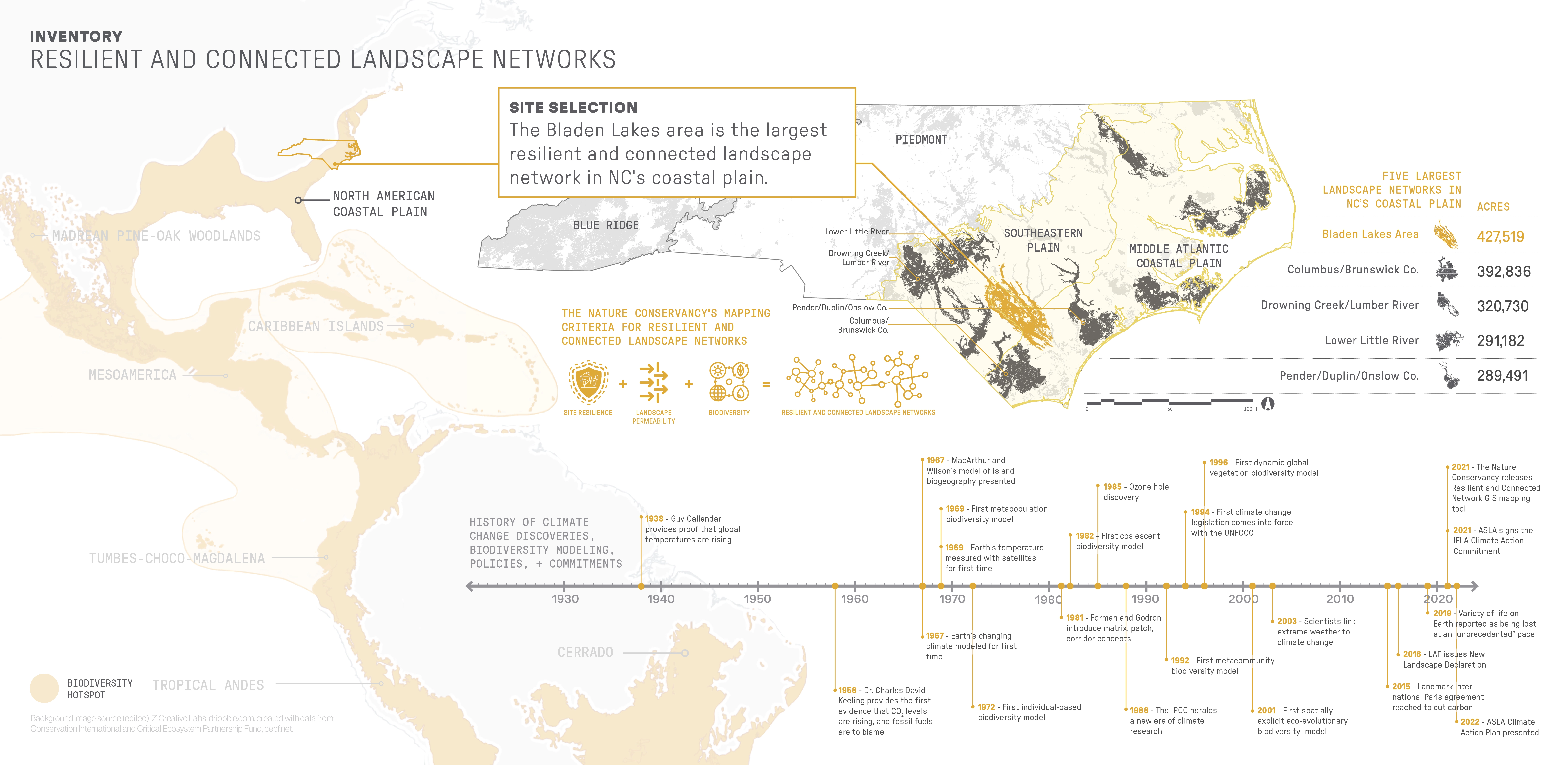 This project addresses biodiversity conservation through corridor design, exploring how the strategic application of design tactics at multiple sites and scales can facilitate climate-related movement as species track their ecological niche. The Nature Conservancy has identified “resilient and connected landscapes” across the US. These priority areas for conservation are linkages that could sustain the diversity of a region under a dynamically changing climate. This project examines the largest of these landscapes in NC’s Coastal Plain, resulting in a scalable framework for analyzing, planning, and designing for climate-related species movement. Applied broadly, this model could reduce the catastrophic effects of biodiversity loss.