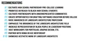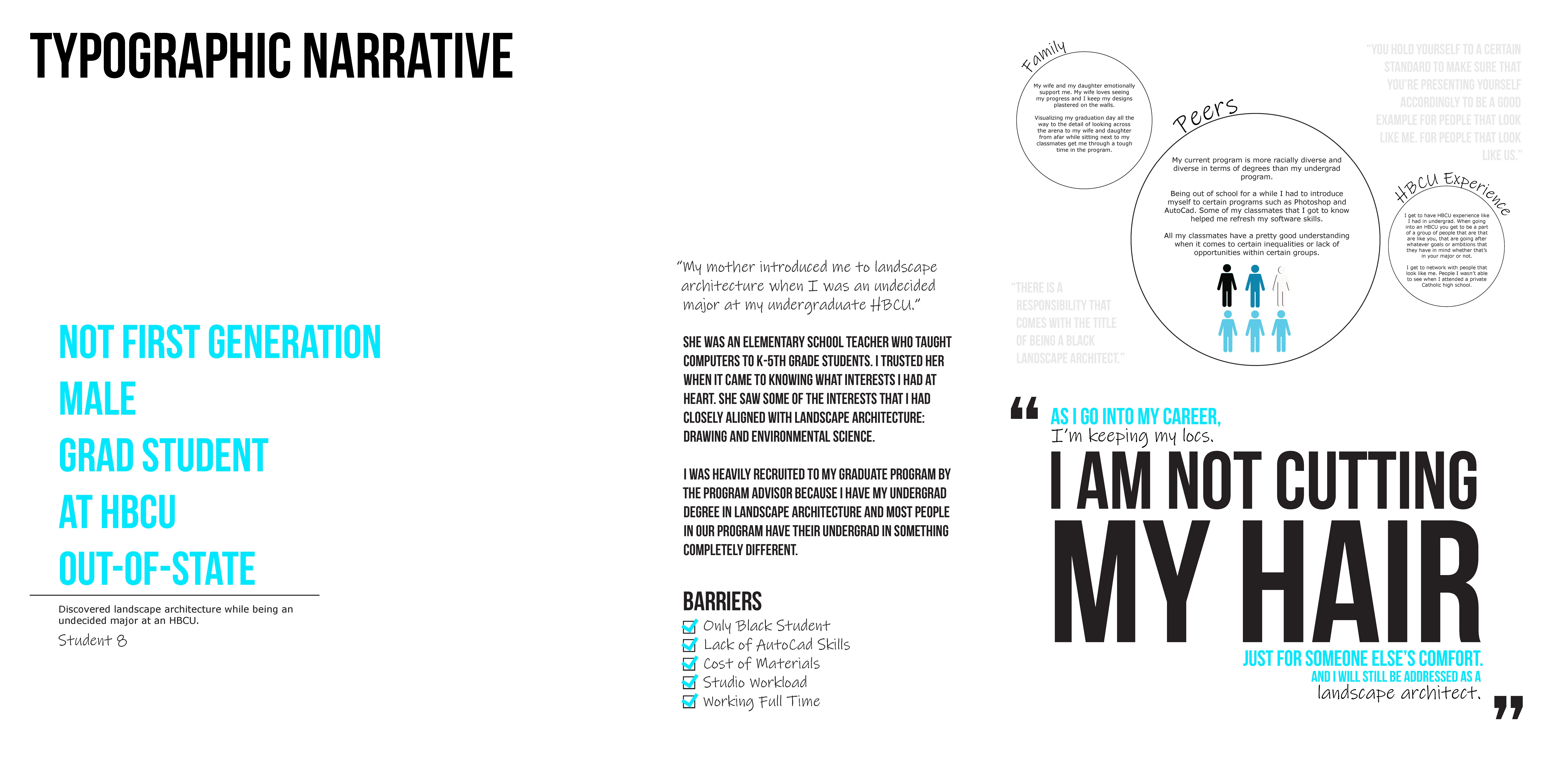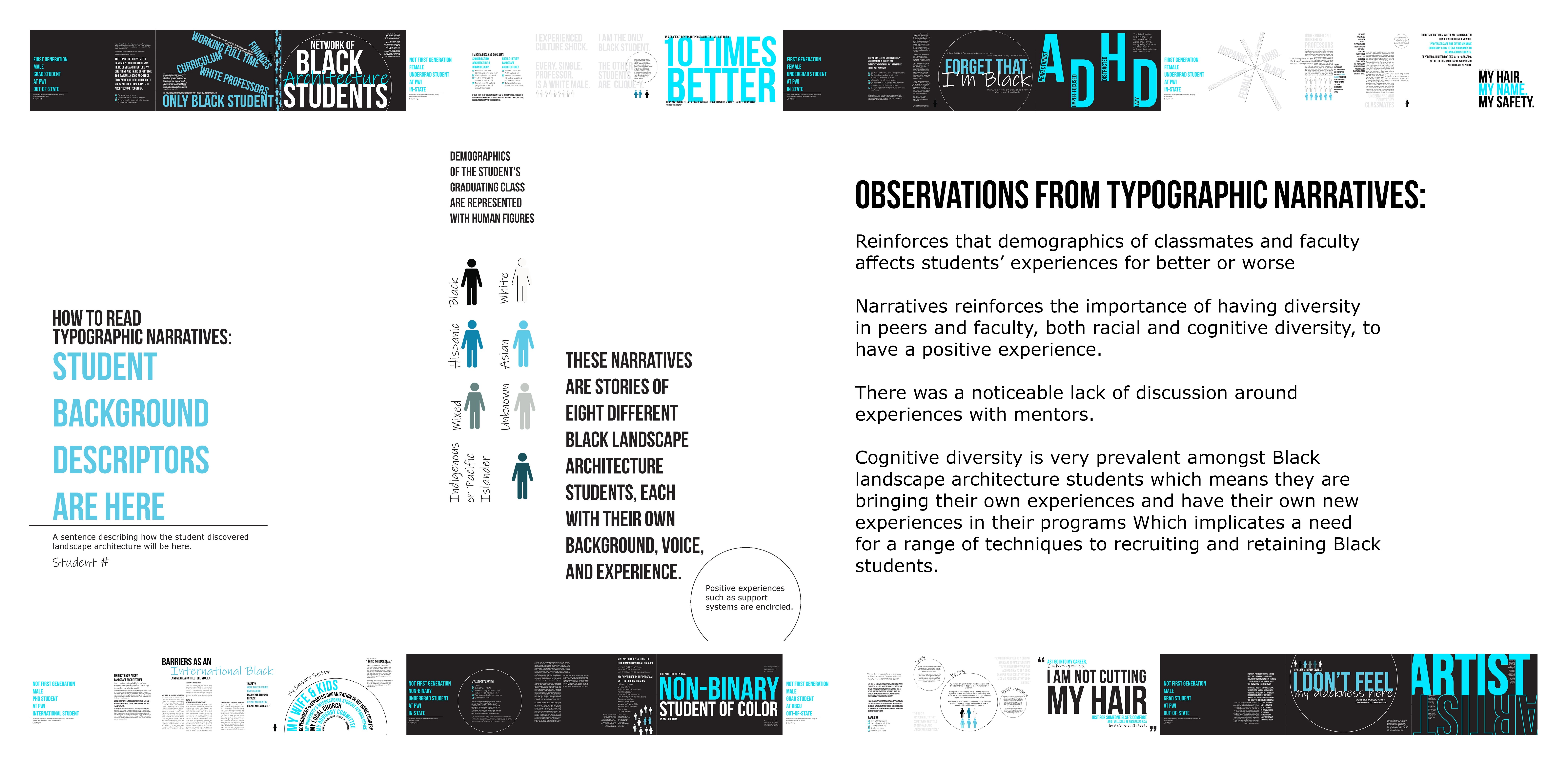 This engaged research revealed that cognitive diversity is prevalent amongst Black landscape architecture students, demonstrating the need for a range of techniques for recruiting and retaining them. The Typographic Narratives reinforce the importance of having both racial and cognitive diversity in peers and faculty. Primary recommendations to equitably diversify the landscape architecture field include cultivating pre-college learning partnerships, reworking landscape architecture curricula to be less white/Eurocentric, and increasing professional development mentorship.