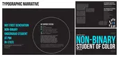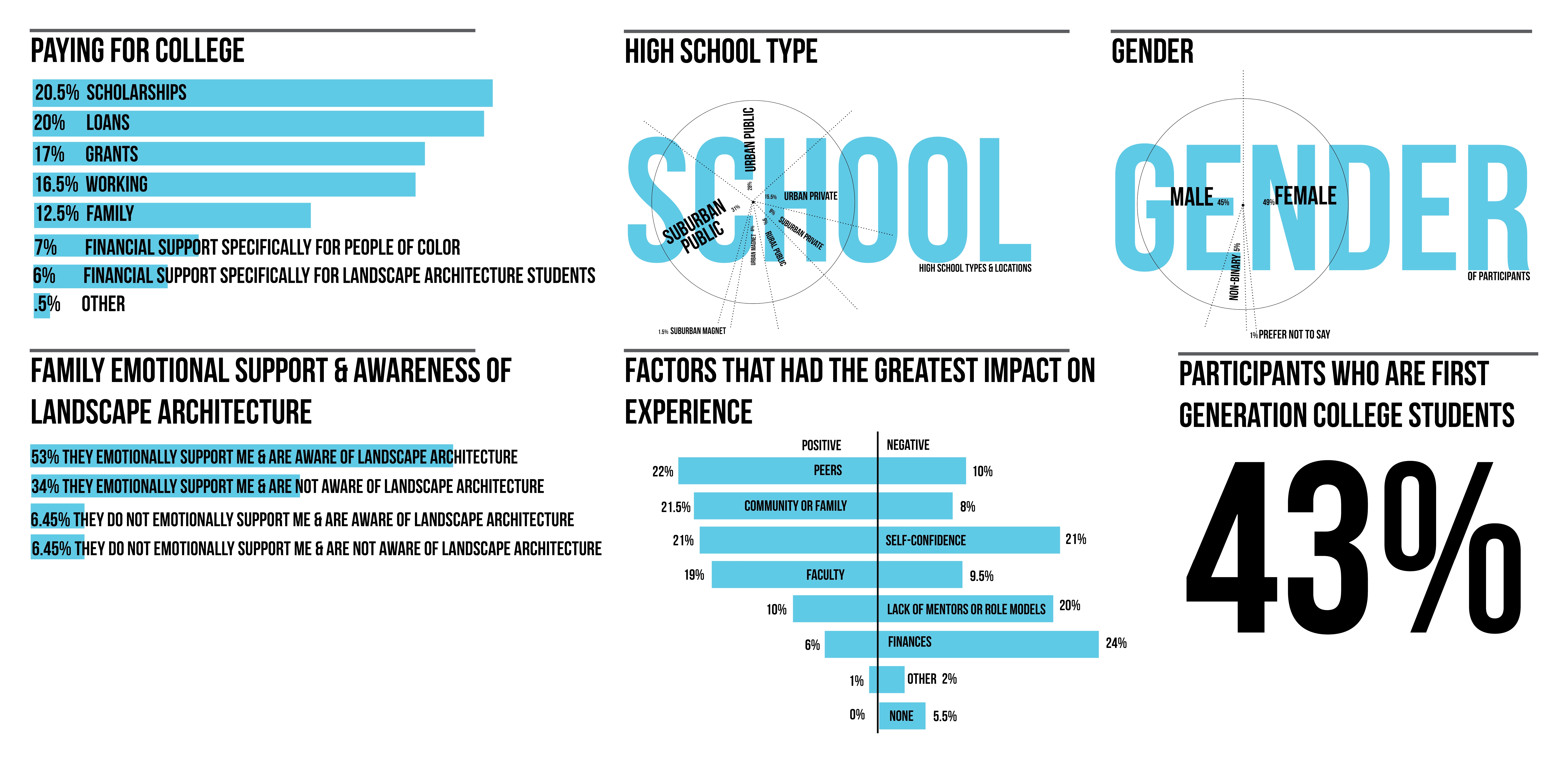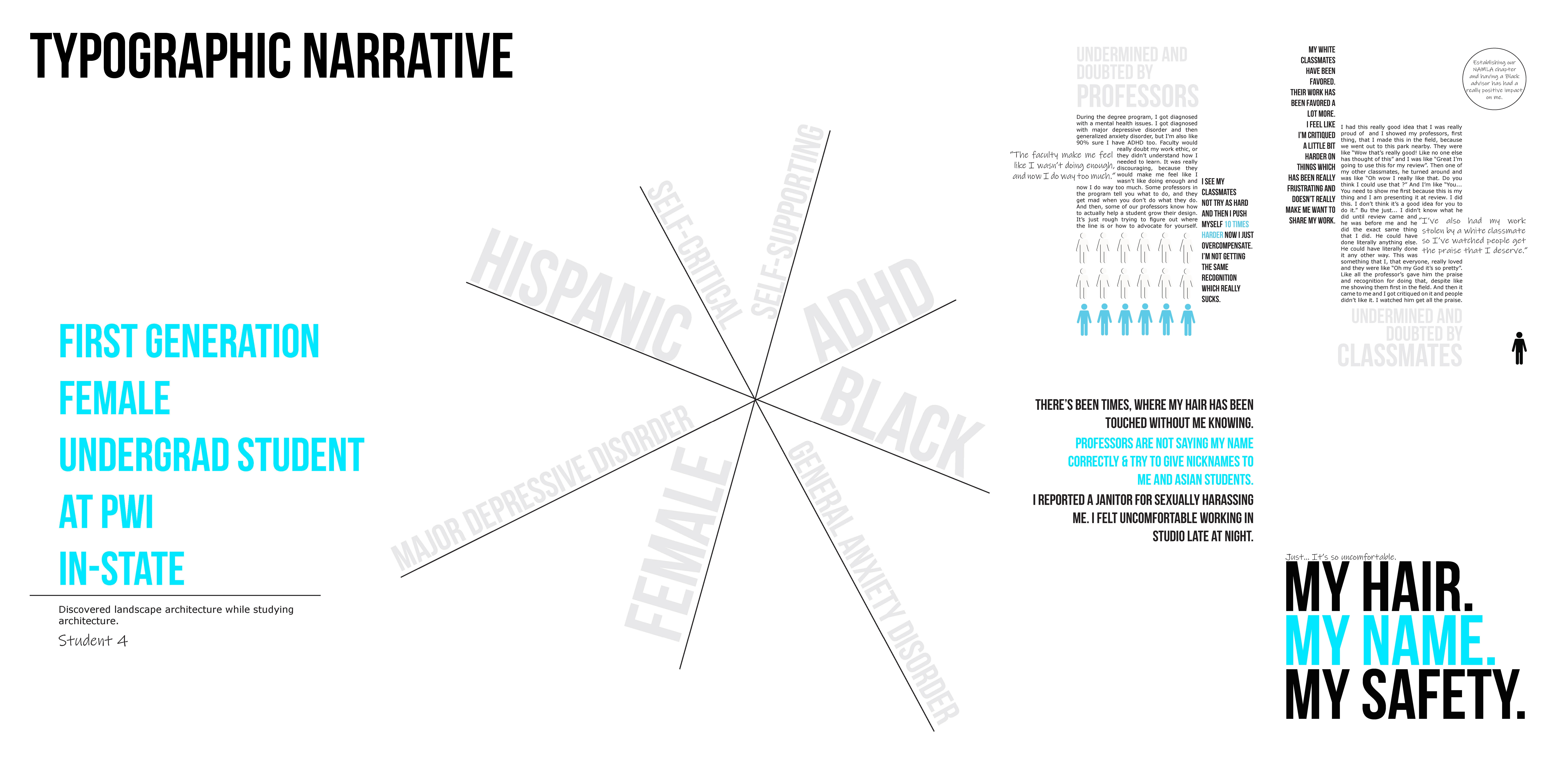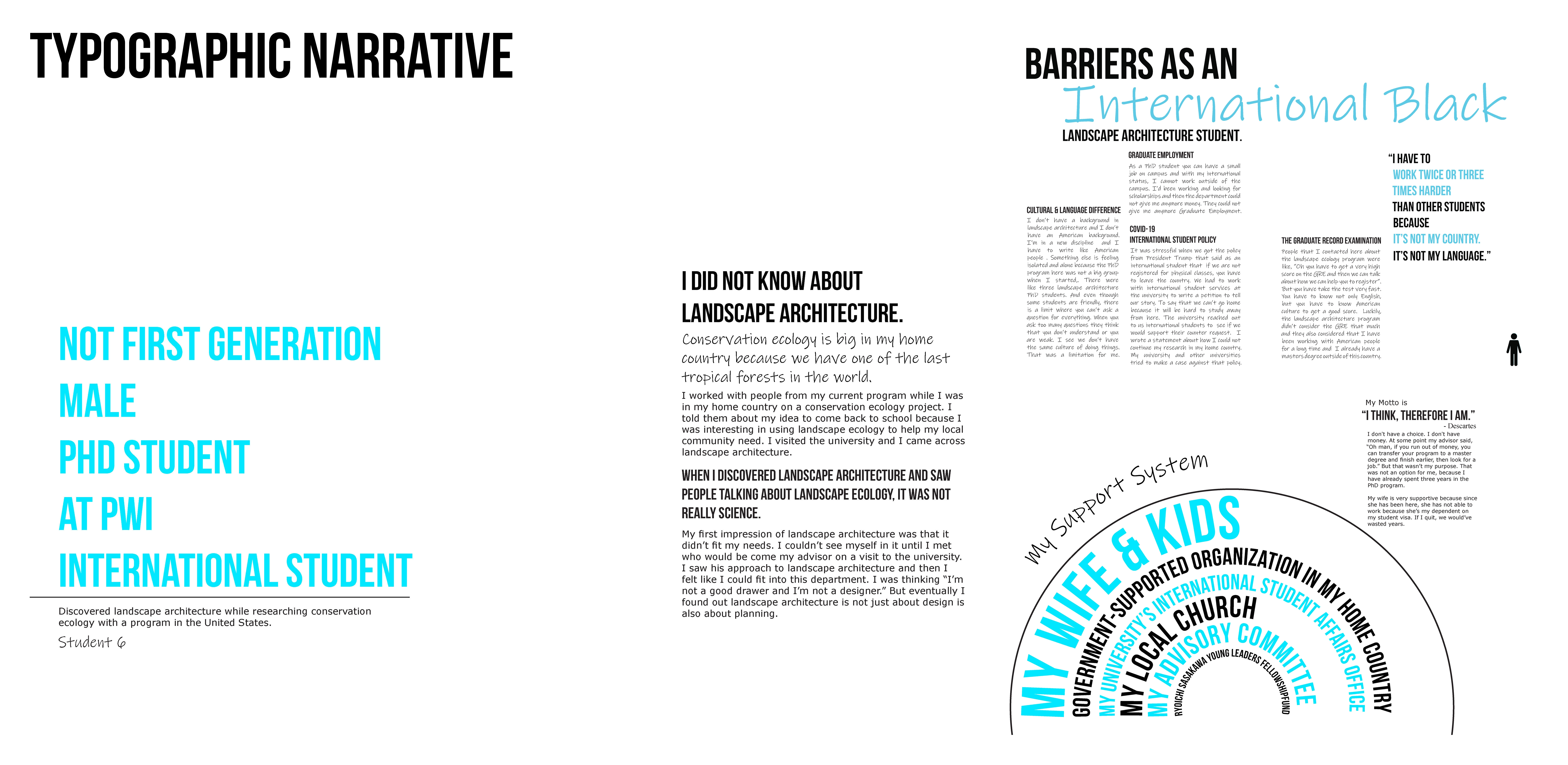Quantitative and qualitative data from multiple-choice and open-ended survey questions and participant interviews were used to examine Black students’ experiences in discovering, choosing, and navigating their landscape architecture programs. The conceptual framework is informed by Critical Race Theory, narrative inquiry, and case study methods. Survey results were analyzed using descriptive statistics and deductive coding with apriori codes (Saldana 2021). The apriori codes were determined from an indepth literature review. The survey results are illustrated in infographics detailing students’ backgrounds, experiences, and recommendations to the landscape architecture field. Key points in the interviewees’ stories related to the discovery, recruitment, and retention portions of their design journey were identified and retold anonymously through counternarrative visualizations, dubbed “Typographic Narratives” by the researcher.