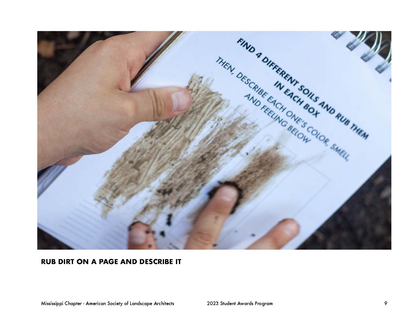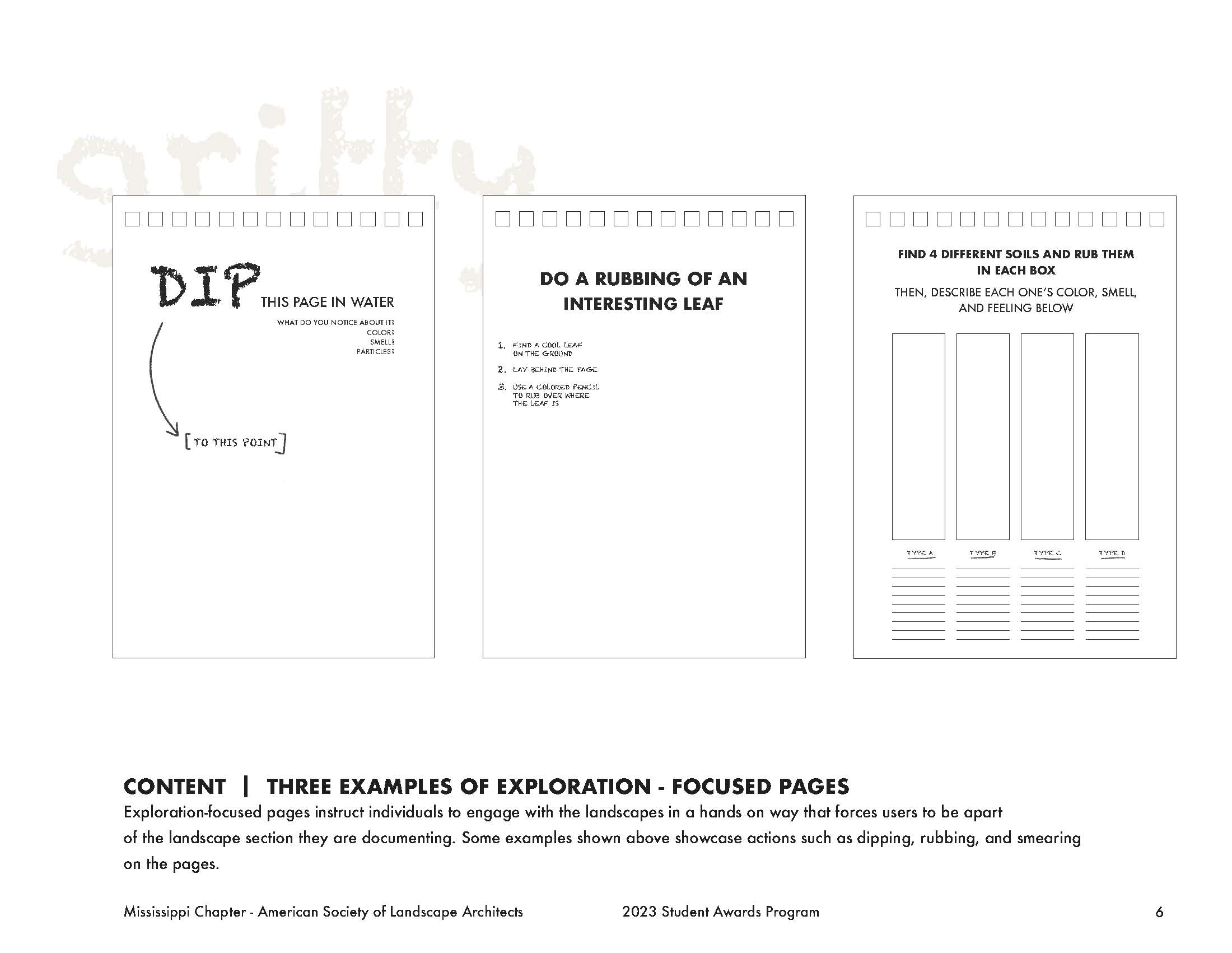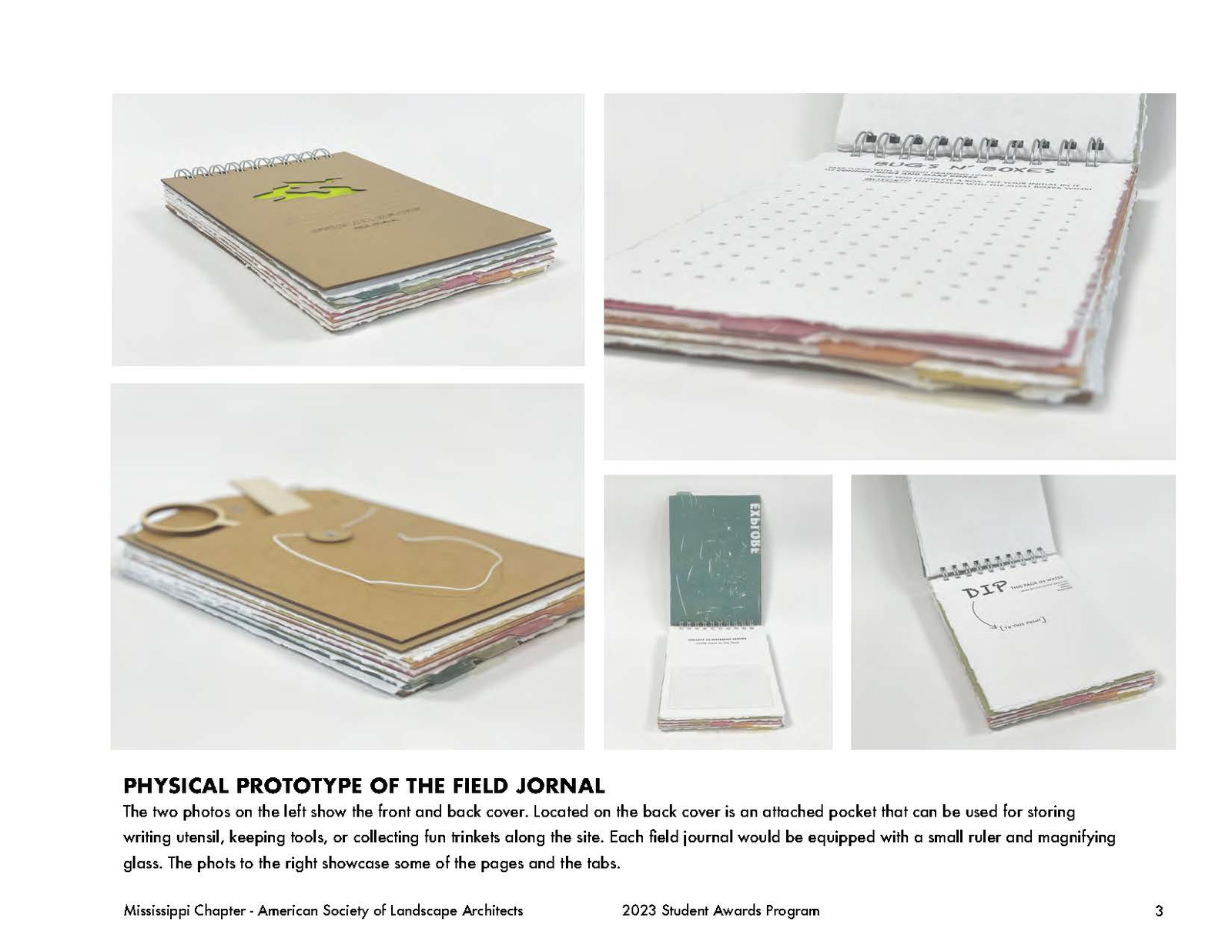 Throughout this design problem, the same question was posed: how can a designer provide the space for children and adults alike to explore new landscape typologies and understand their value? This design proposal leverages the existing site features and introduces new amenities and connections to become an artful, ecological, and interactive environment for its local community, the Wolf River Greenway system, and the greater Memphis area. The proposal integrates three unique programmatic changes to achieve this goal: experiential learning and a play pathway called the walk to learn. Playing off the walk to learn, the project showed that there was even more that could be done for community educational outreach for natural and curated landscapes within the urban context. This led to creating a field journal filled with prompts and guidelines to direct children (and adults) along the site to engage and explore the landscape. The walk to learn consists of five sections based on their programmatic functions in the masterplan: explore, learn, gather, play, and splash. The explore section encompasses the constructed wetlands and promotes people interacting with and becoming comfortable in natural landscapes and exploring the plant life and habitats that it inhabits. The learn section is a designated area for a teaching pavilion with worktables to create a space for field trip groups to convene or rest along the pathway. The gather section covers the community gardens which allow for exploration of a more manicured landscape maintained by surrounding residents. The play section caters to the more typical play. Lastly, the splash section covers the reconstructed lake edge with a low-slope gravel edge to allow for easy water access. Each section is specific to a different landscape typology to promote various learning potentials. The field journal pages in each section correlate to its section on the site plan by steering the prompts to engage users in both tactile and intellectual ways.