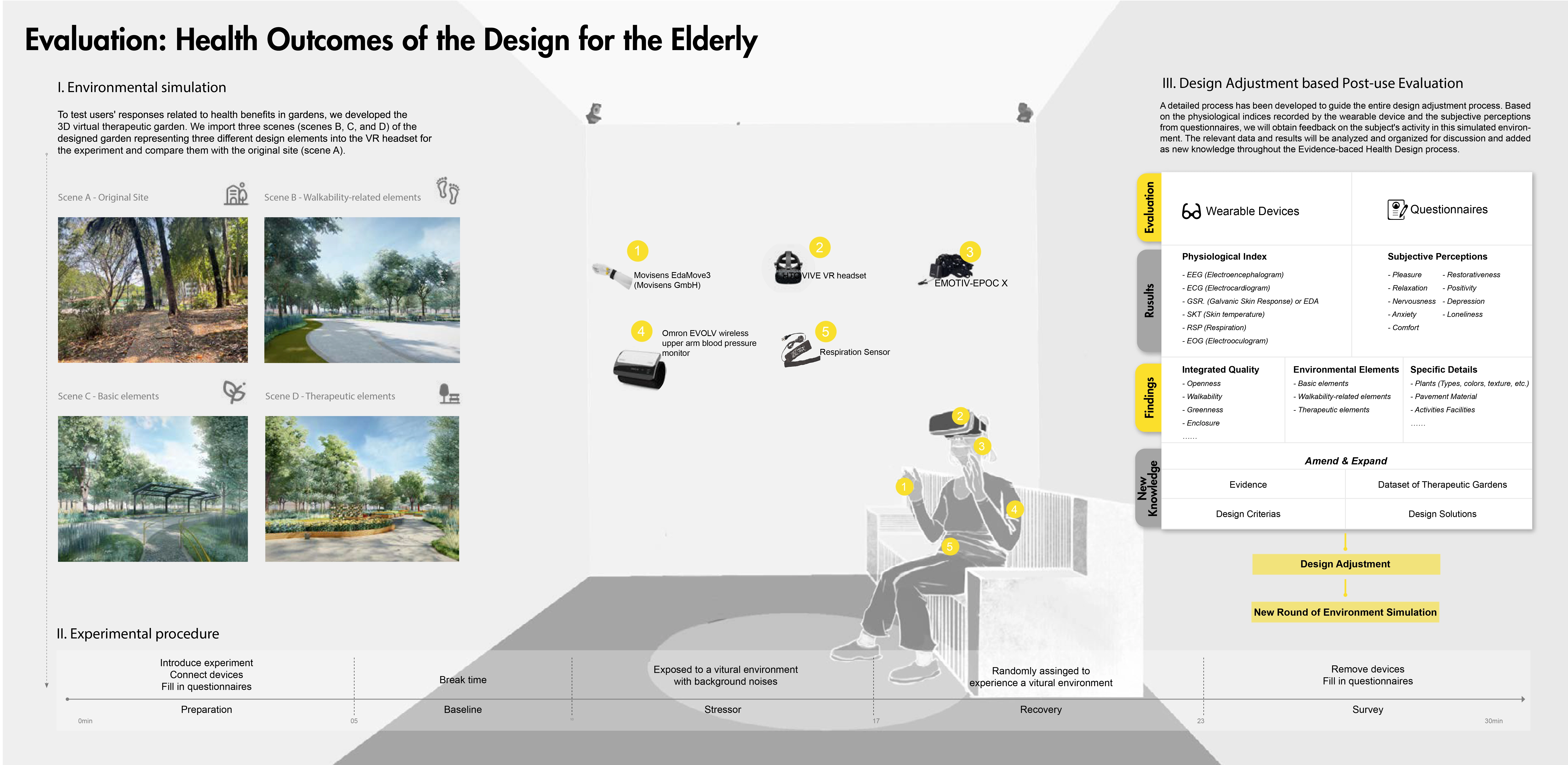 4) Evaluation: Health Outcomes of the Design for the Elderly. We use wearable devices and questionnaires to evaluate elders’ responses related to health benefits in the 3D virtual garden. It indicates that the design can effectively improve the elderly’s health compared to the original site. The new knowledge would be used to adjust the design and push the spiral process of EBHDL.