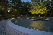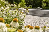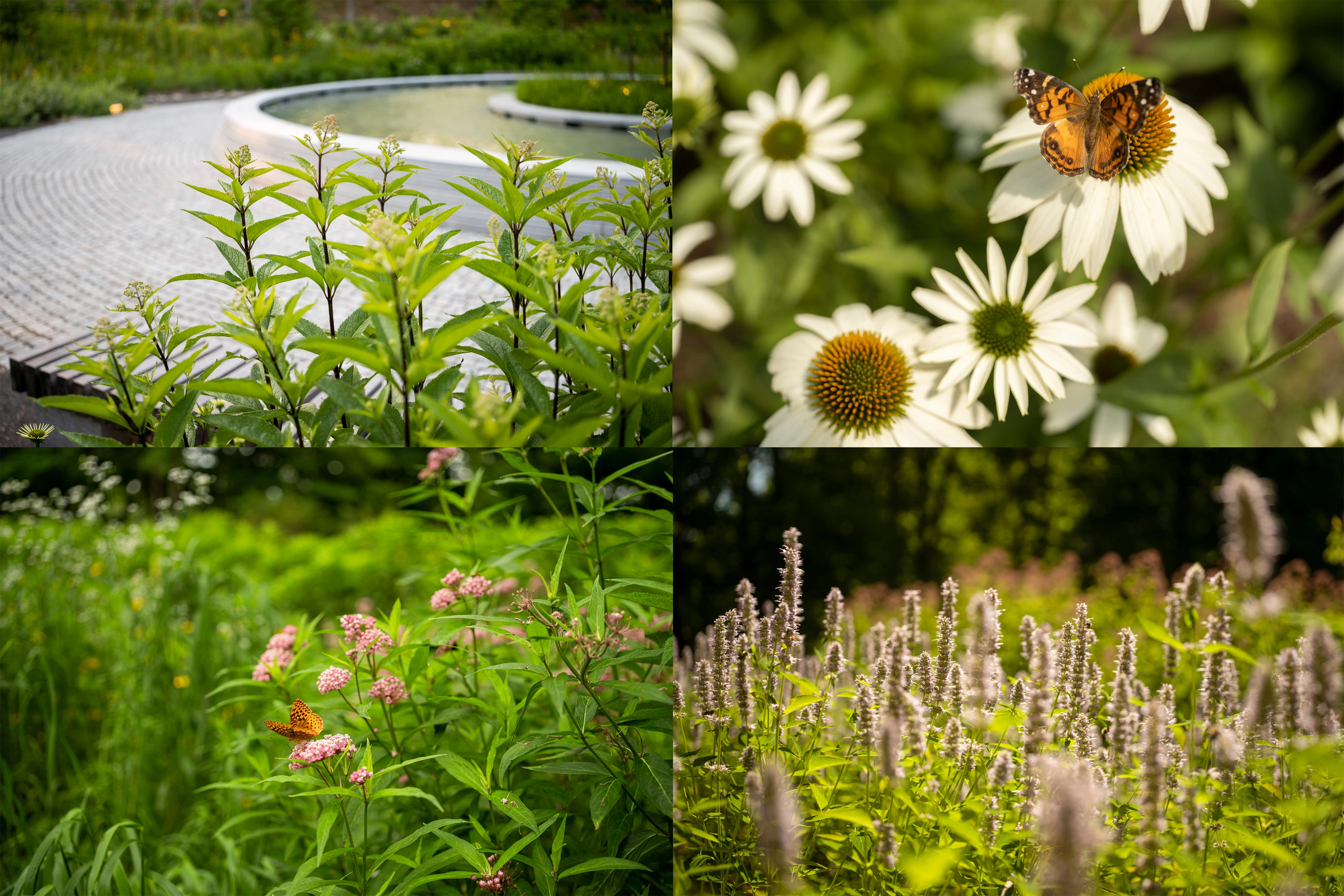 Known as The Clearing, the design takes a distinctly different approach from most contemporary memorials, focusing on nature rather than a static object. At its center, a young sycamore tree is situated within a low granite basin, its beveled edge engraved with the names of the deceased—a direct reference to life cycles as a parallel to grief, seasonally shedding and regrowing foliage. Barely perceptible until visitors approach, water flows counterclockwise toward the center of the fountain, moving in the opposite direction of the surrounding series of concentric paths, a gesture toward the nonlinear process of healing. In summer, the landscape bursts forth from sculpted mounds delineating the paths, selected for pollinator value and year-round texture and color: butterfly bushes, joe-pye weed, winterberries, rudbeckias, and more.