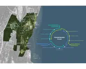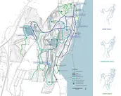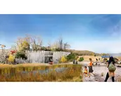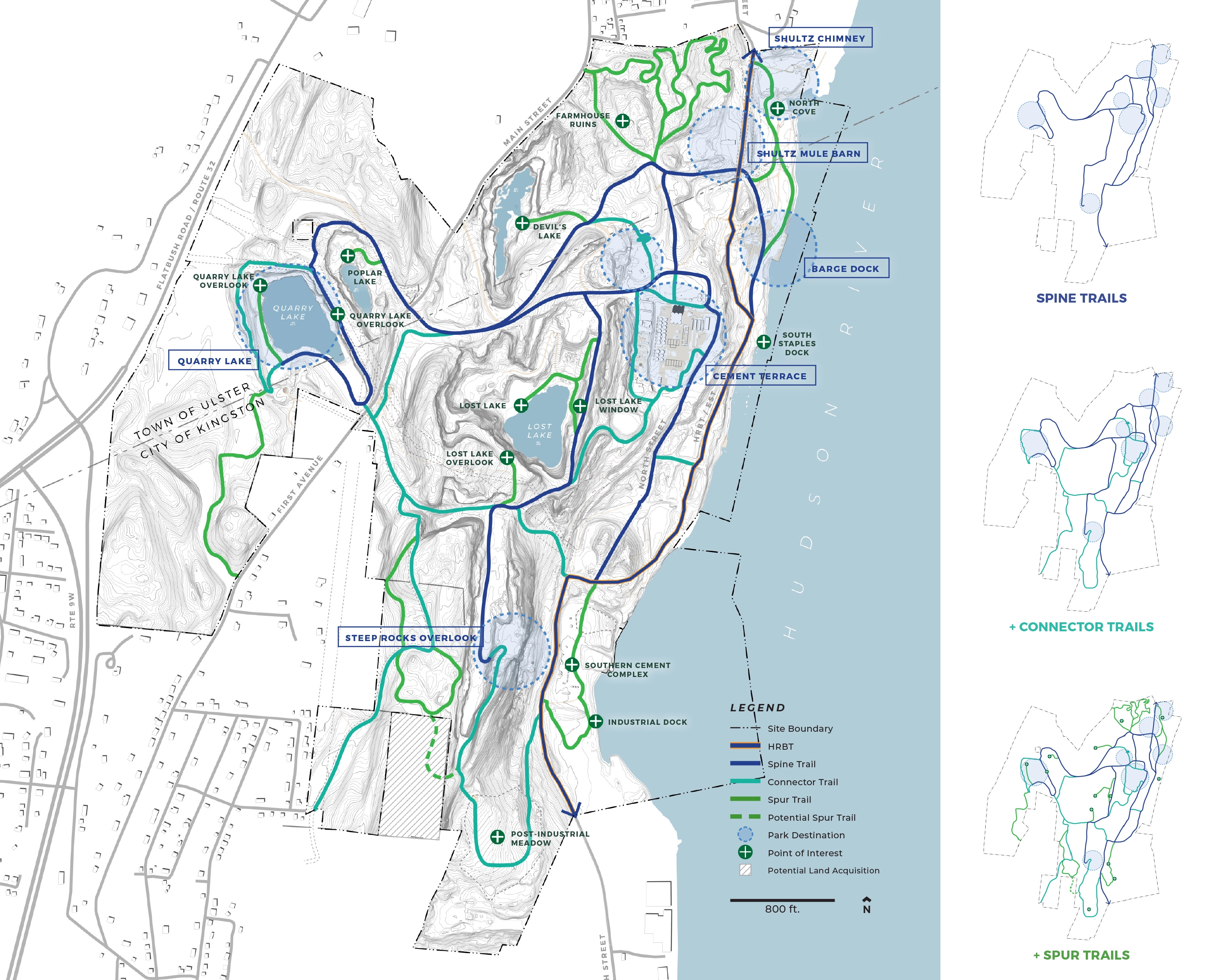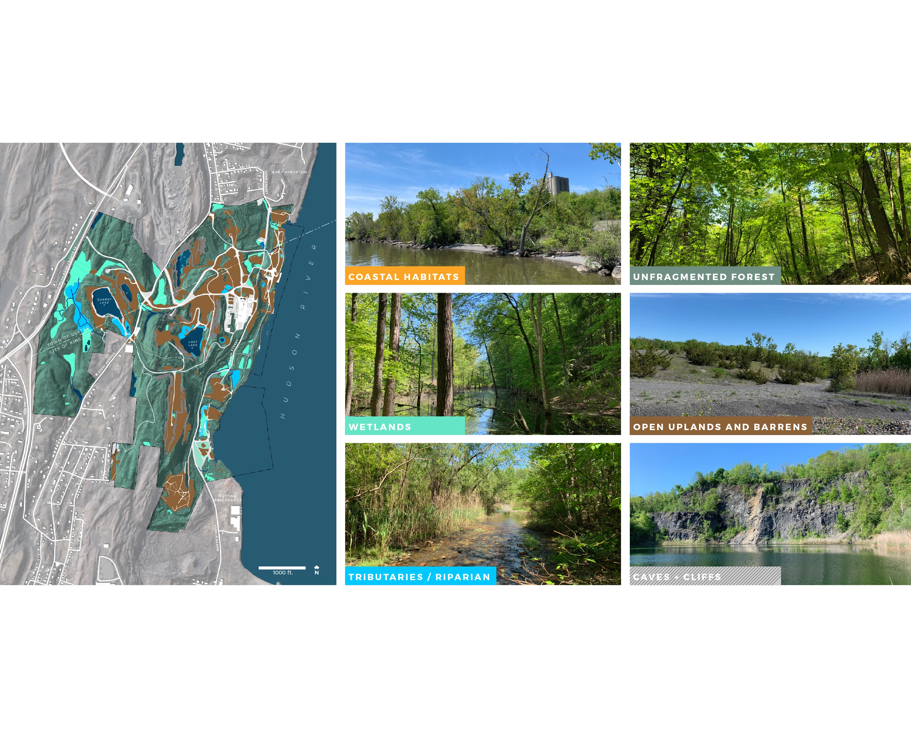 Context: Situated on 520-acres of abandoned quarry land in the City of Kingston and adjacent to the Town of Ulster, the site includes diverse natural features such as woodlands, wetlands, quarry lakes, and Hudson River waterfront. The area's history spans from its pre-industrial home to the Esopus people and later as the "Kingston Commons," and through a century of extractive industry use and abandonment, led to its current state: part wild and heavily degraded. The plan is deeply informed by understanding local communities of the area including diverse Black and Hispanic communities.