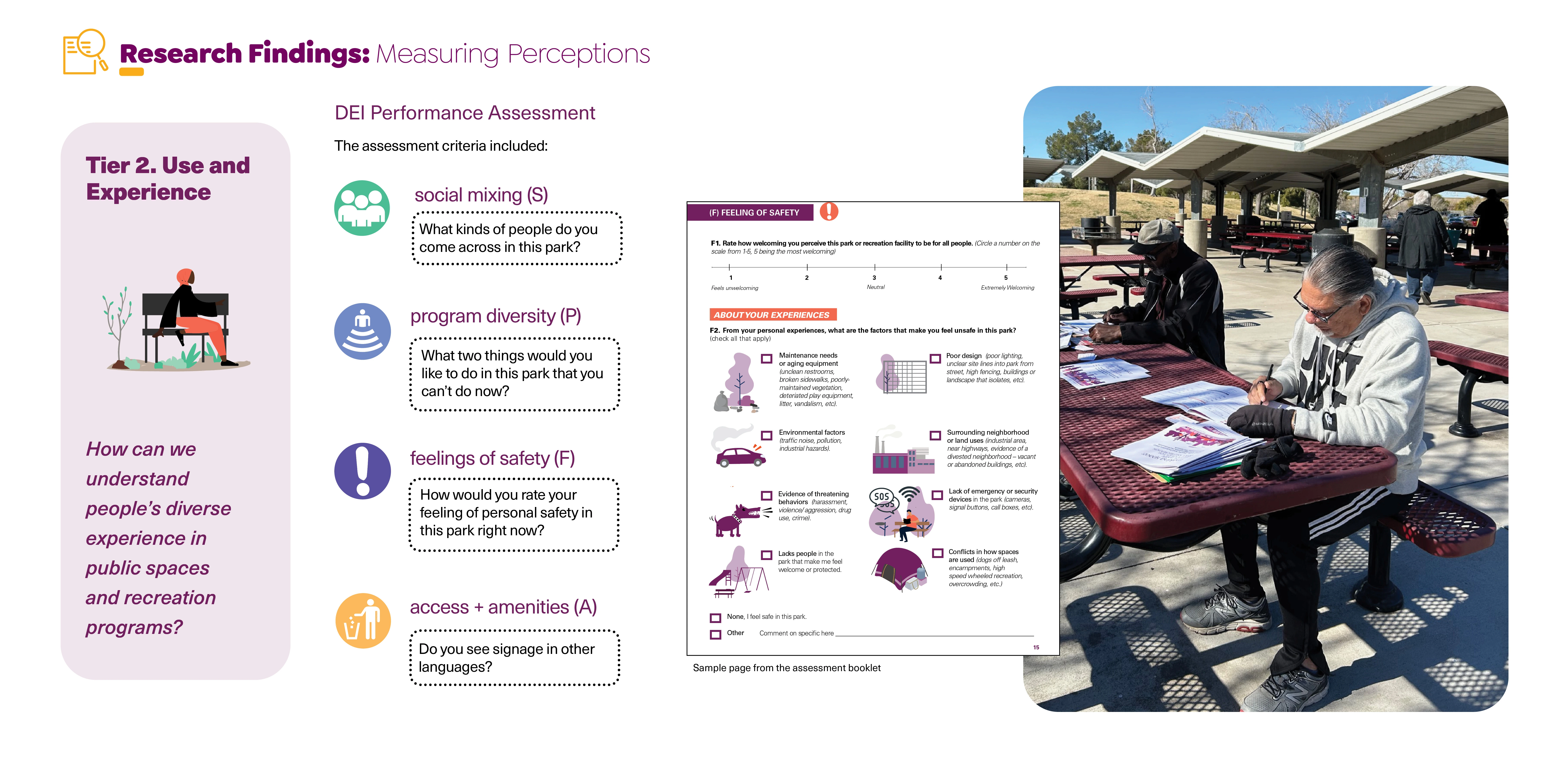 The primary research methods involved two tiers – 1. desktop data analysis collected from publicly accessible sources as well as 2. unconventional observational tools conducted by diverse community members. These tools are critical to getting a pulse on how different lived experiences inform the perceptions and use of public spaces.