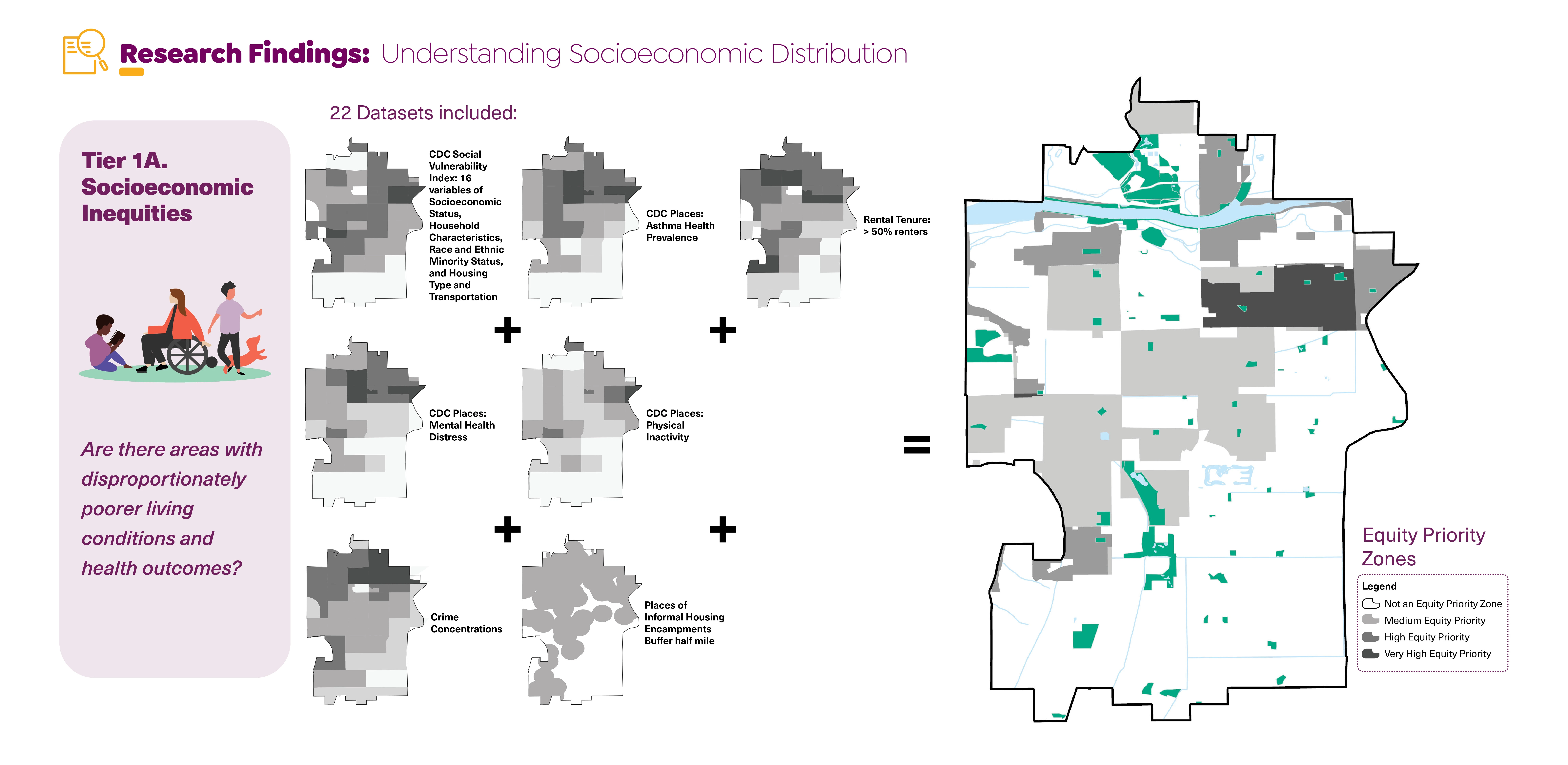 A growing body of research examines the continued devastation of policies and bias facilitating inequities in park provision. This study provides the most comprehensive look at geographic-based disparities amidst diverse populations. It expands research to include public health and climate change implications and examination of city operations. One innovation is measuring complex qualities of green spaces, recreation offerings, and public gatherings: an assessment tool to understand cultural inclusion and a sense of safety. Multiple methods elevate diverse community member perceptions to drive changes in policies and target equitable investments. This methodology is poised to change the field of public space planning and design.