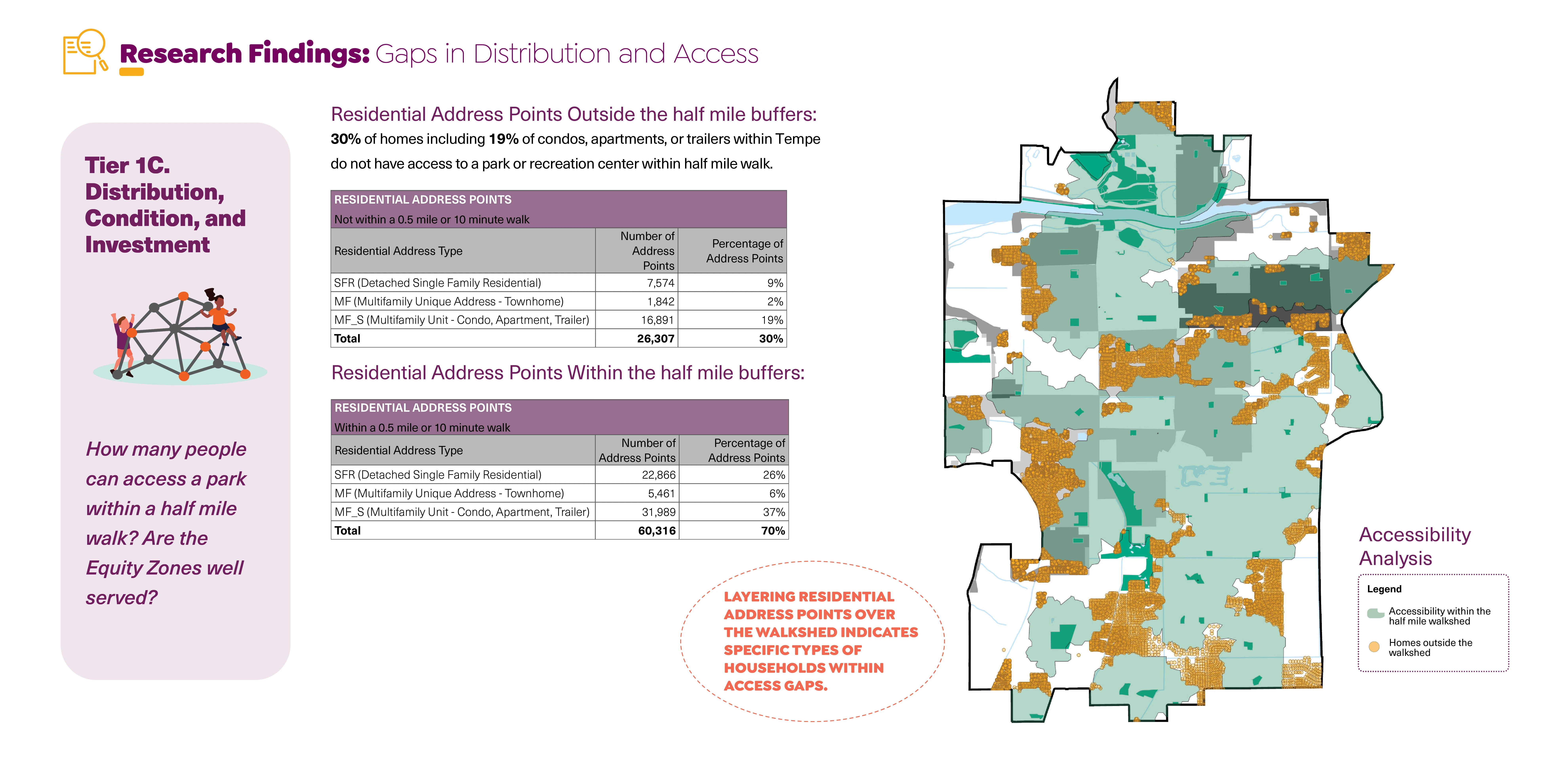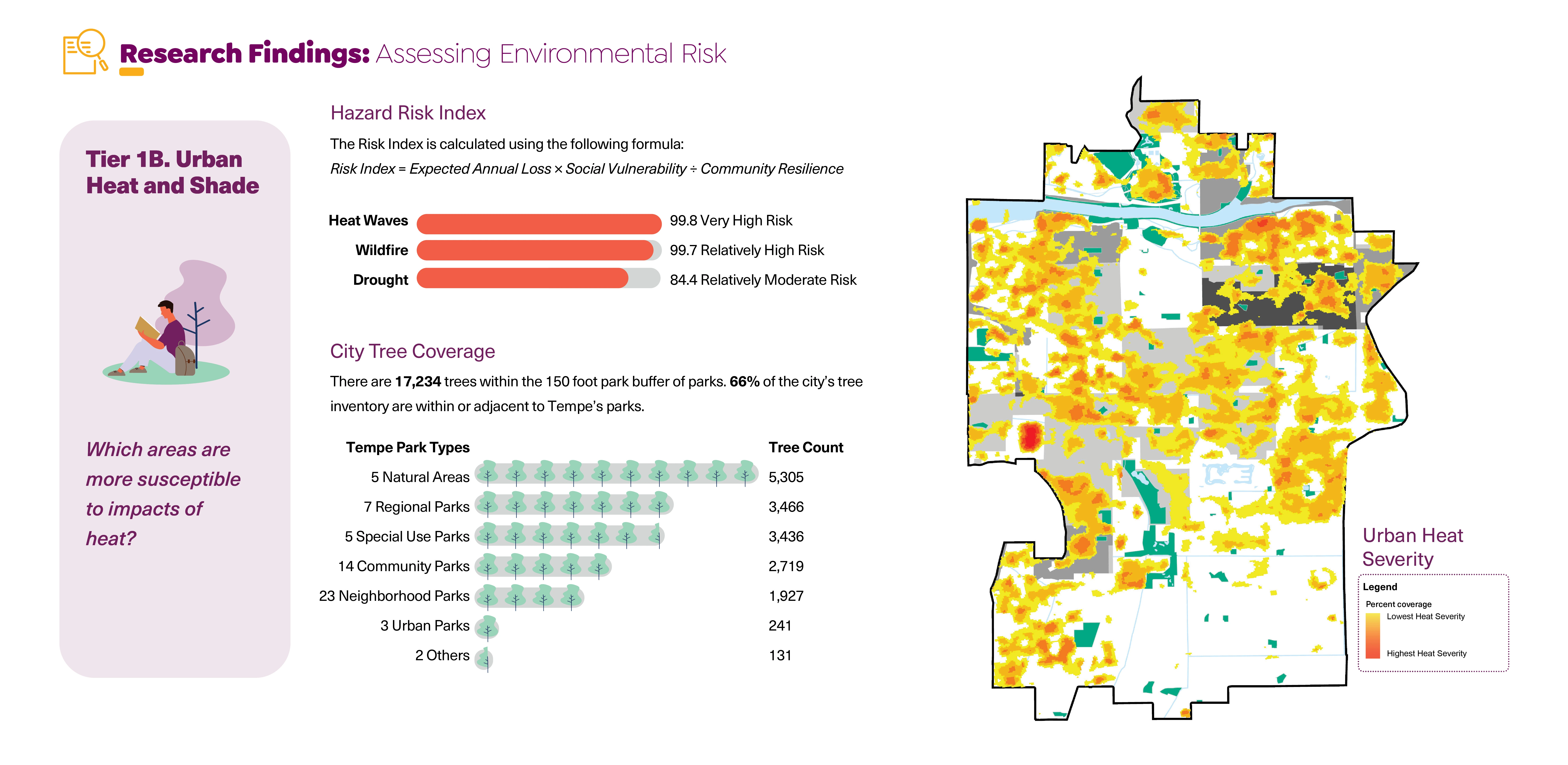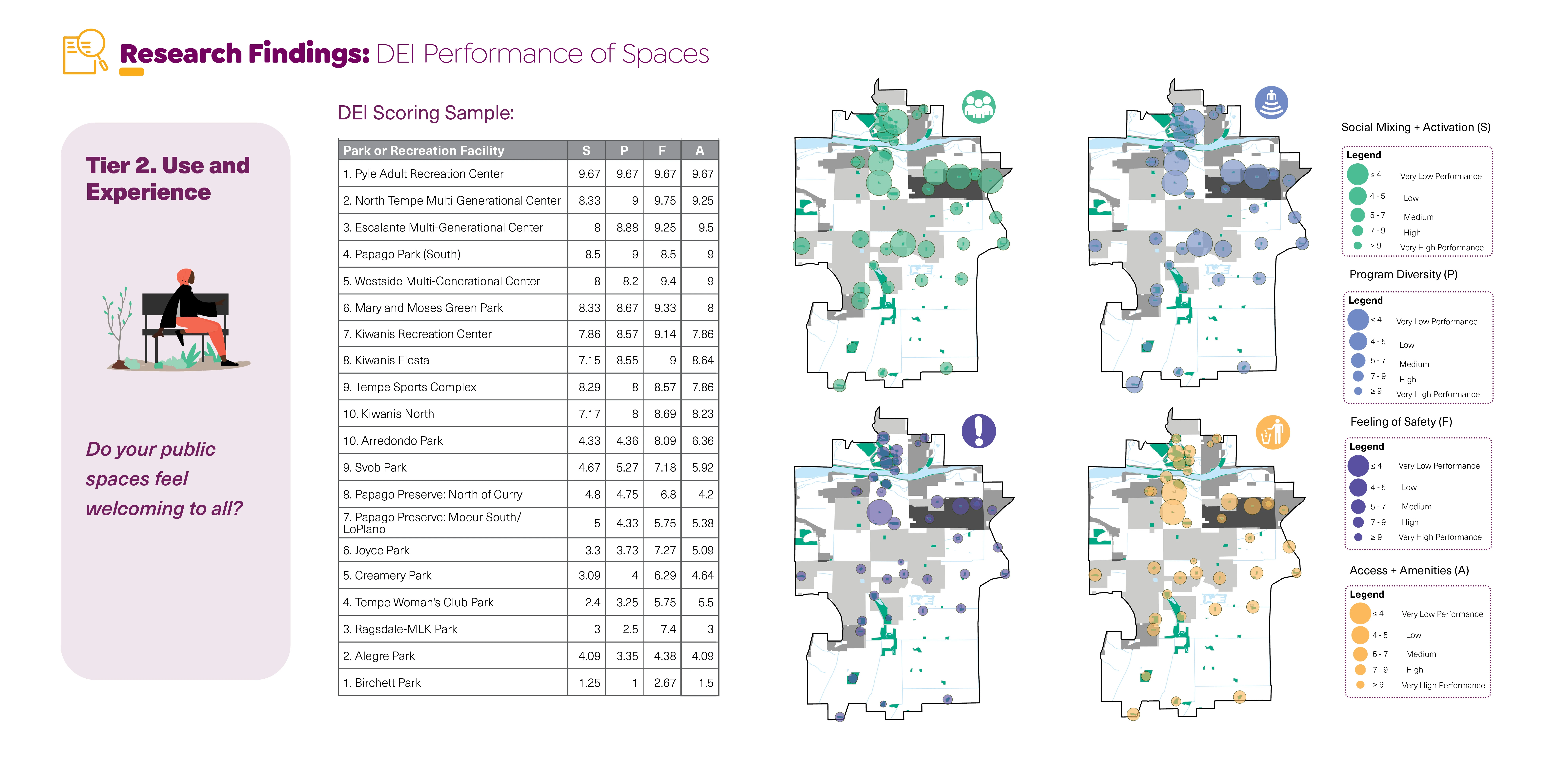 The inquiry phase included a review of Tempe’s existing planning and policy documents, a review of the city’s historic land planning practices, local factors effecting climate resilience, and a synthesized case study analysis comparing equity reports for peer communities and best practices. The second phase focused on generating an equity analysis framework (based on tier 1 data), highlighting systemic inequities around socioeconomic disparity and environmental impact data, and park distribution, condition, and investment trends. The third phase paired with findings from the second phase involved a robust community engagement campaign comprised of community navigator-led park assessments, park intercept surveys, neighborhood pop-up events, topical focus groups, and staff surveys (tier 2 data). This ultimately informed the fourth research phase that translated the rigorous analysis process into actionable next steps for the City to undertake in partnership with local stakeholders.